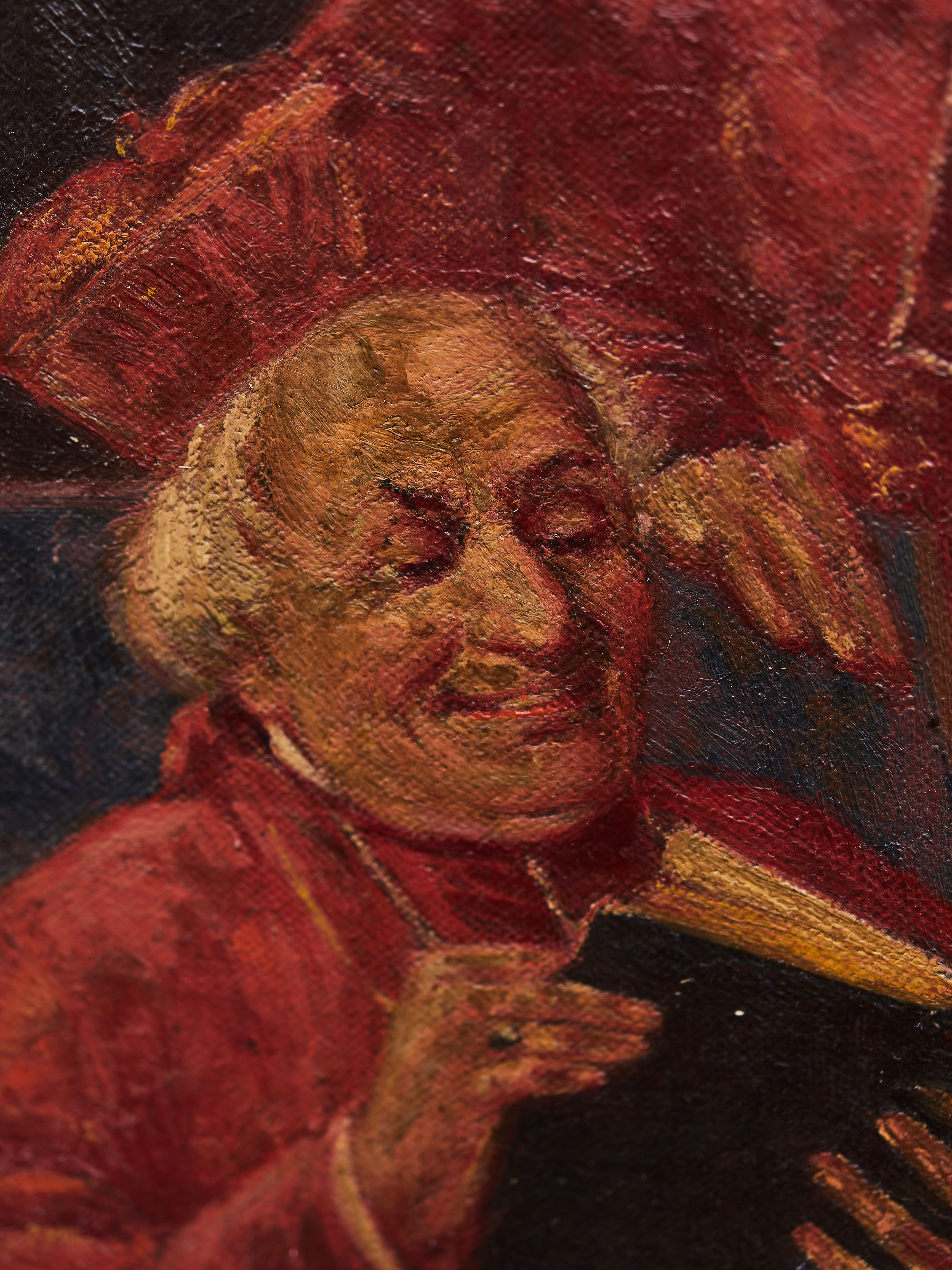 Stav: dobrý původní stav, místy drobné povrchové nečistoty, lokální otěry a drobná krakeláž v červených partiích; plátno pevné, bez průrazů. Na rubu starší inventární značení. Připraveno k zavěšení.