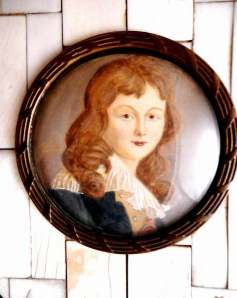 Miniatura obrázek dámy, kombinovaná technika, ruční malba na papíru, rámeček 13 x 18 obrázek v rámečku na slonové kosti, na rubu makulatura.