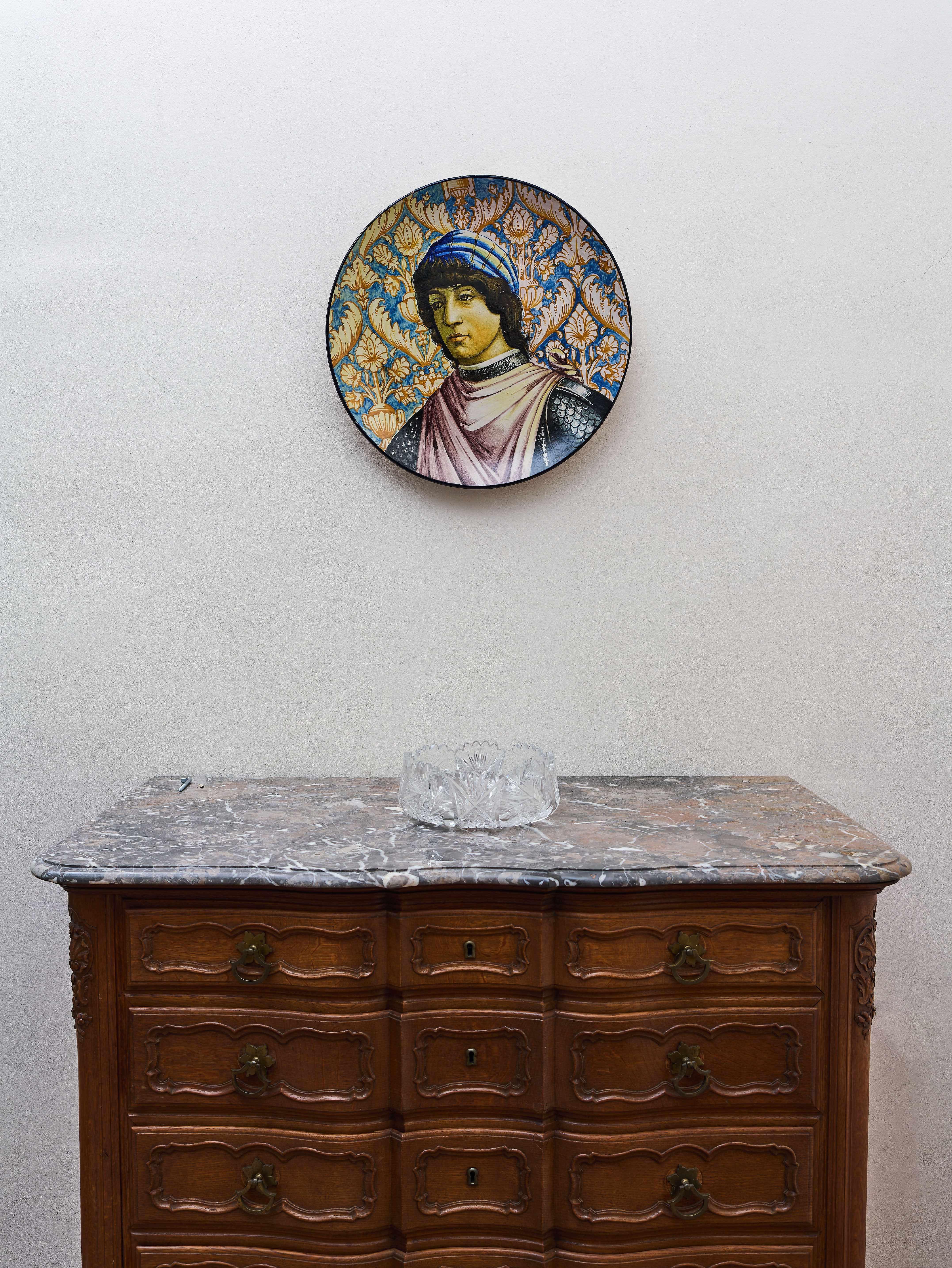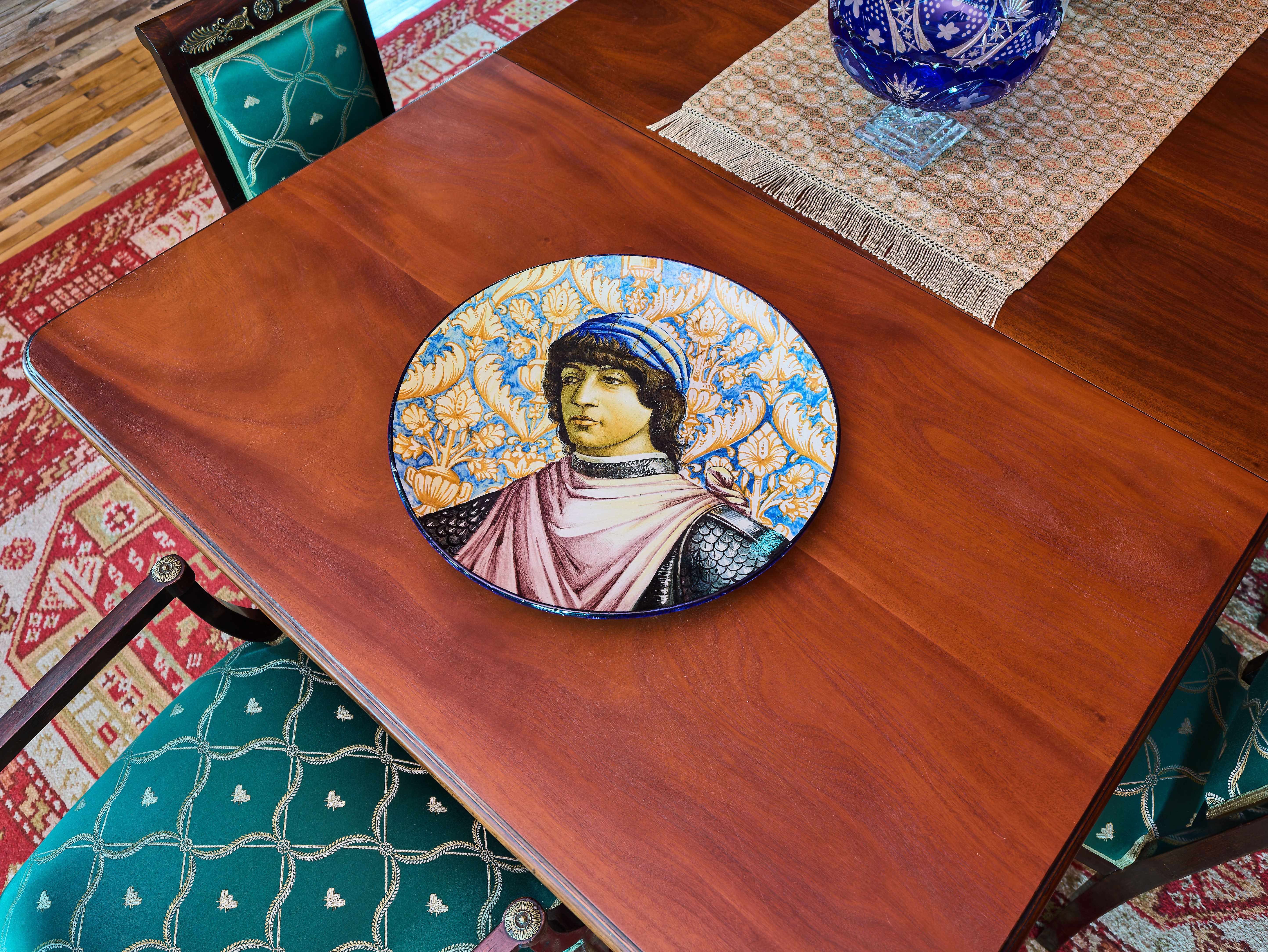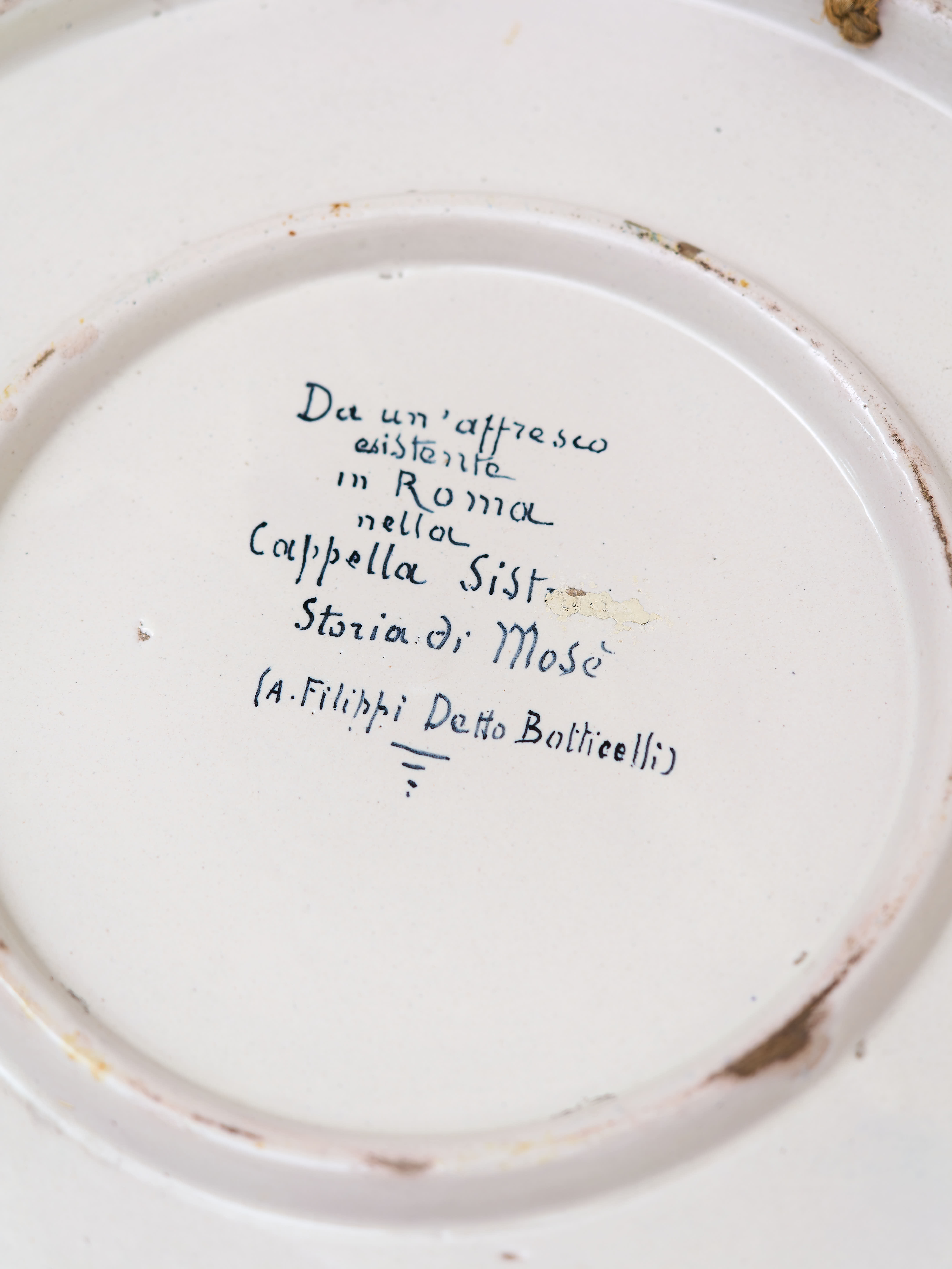 Velký ručně malovaný italský talíř s portrétem mladého muže podle fresky z dílny Sandra Botticelliho. Na zadní straně nápis „Da un affresco esistente in Roma nella Cappella Sistina, Storia di Mosè (A. Filippi detto Botticelli)“, který odkazuje na inspiraci freskami v Sixtinské kapli v Římě.