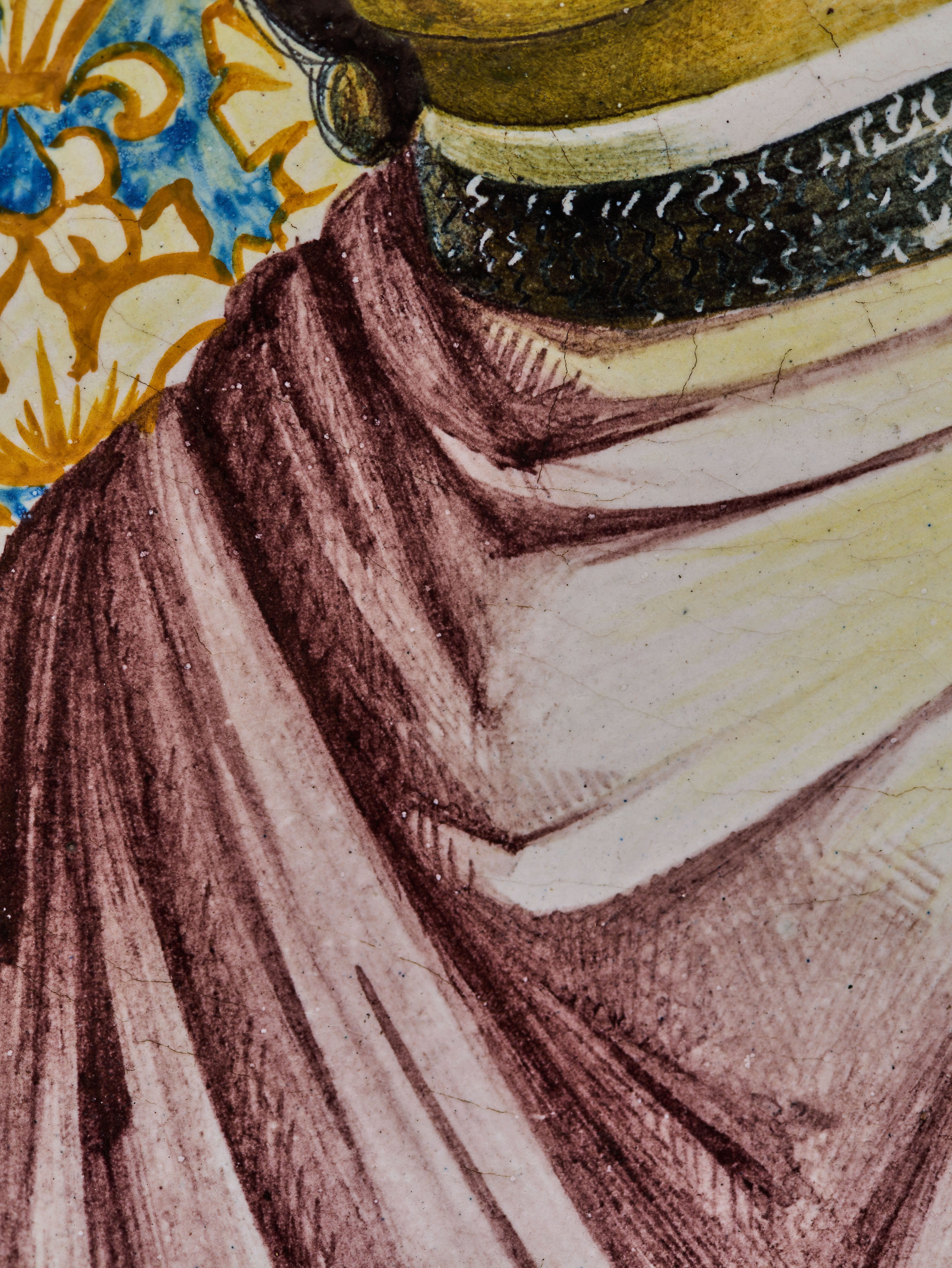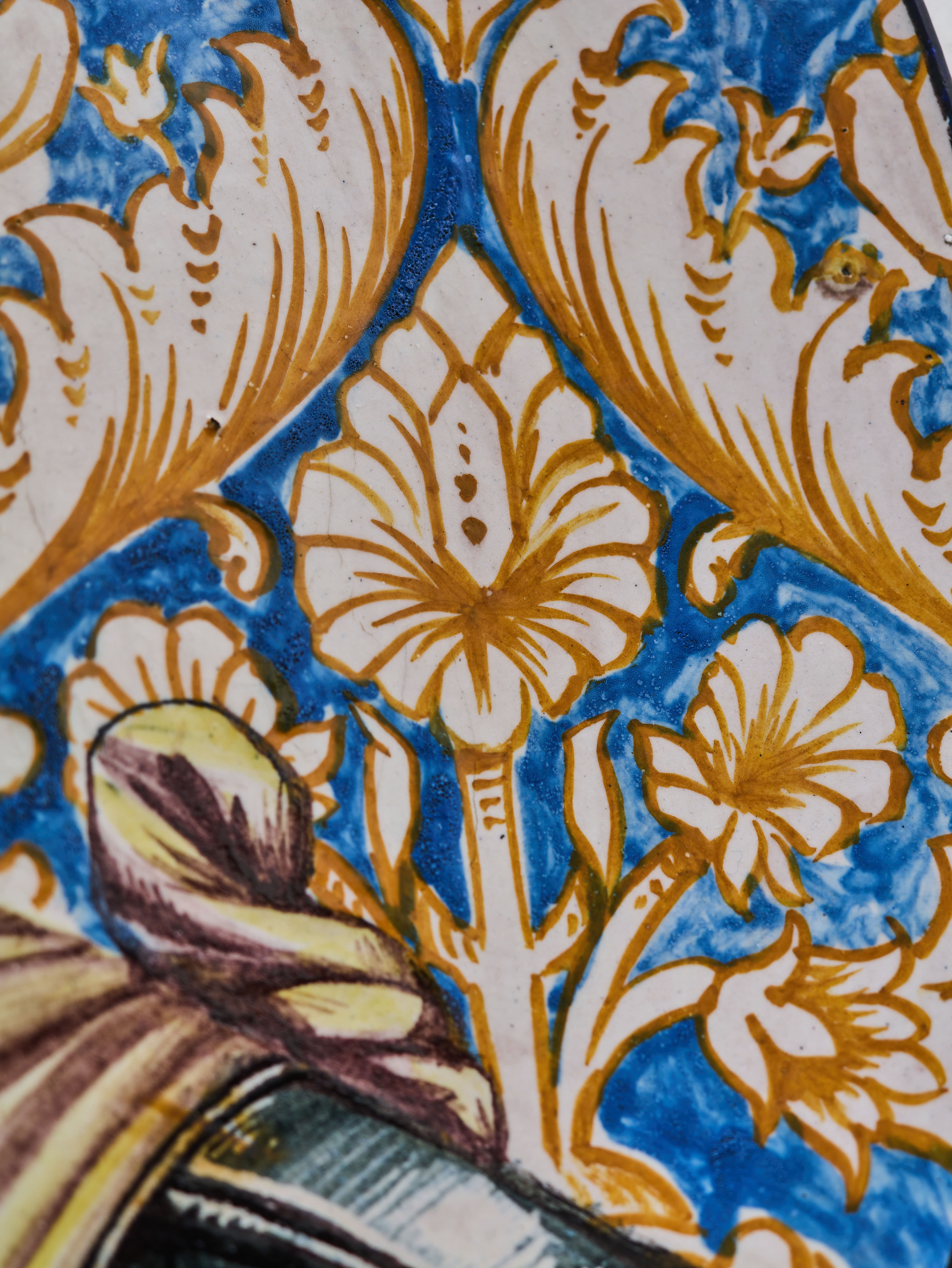 Talíř má výrazné barvy v kombinaci modré, zlaté a hnědé s bohatým ornamentálním pozadím ve stylu italské renesance. Povrch je glazovaný, s jemnou krakeláží odpovídající stáří.