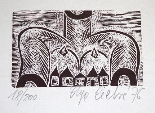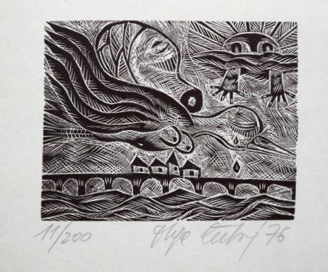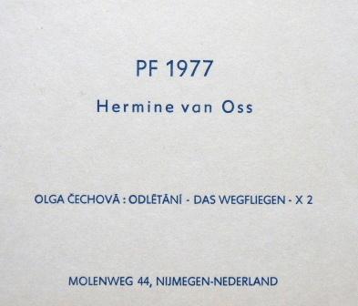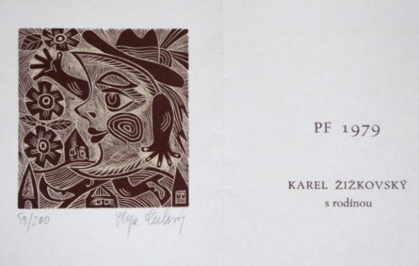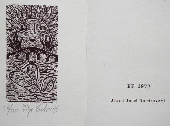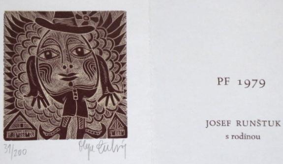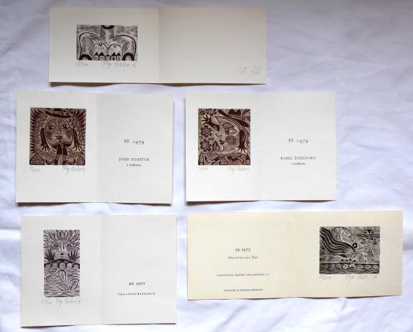 5 x dřevoryt na papíře 6,5 x 8,3 cm, 9,2 x 4,8 cm, 4,8 x 8,3 cm, 7,6 x 7,2 cm, 7,8 x 7,2 cm. Signováno tužkou vpravo dole a vlevo dole. Datováno 1976. Číslo listu 59 / 200, 31 / 200, 18 / 200, 36 / 200, 11 /200. PF 1977 Hermine van Oss, PF 1977 Olga Čechová, PF 1977 Jana a Josef Runštukovi, PF 1979 Josef Runštuk s rodinou, PF 1979 Karel Žižkovský s rodinou. Nerámováno. Olga Čechová ( 6. 4. 1925 Brno – 24. 11. 2010 Praha ) studium: Škola uměleckých řemesel v Brně 1941 – 1944 prof. Petr Dillinger, arch. Zdeněk Rossmann. Vysoká škola uměleckoprůmyslová v Praze 1946 – 1951 prof. Antonín Strnadel, prof. Karel Svolinský. členka: skupina Trasa, Sdružení českých umělců grafiků Hollar, Český fond výtvarných umění.