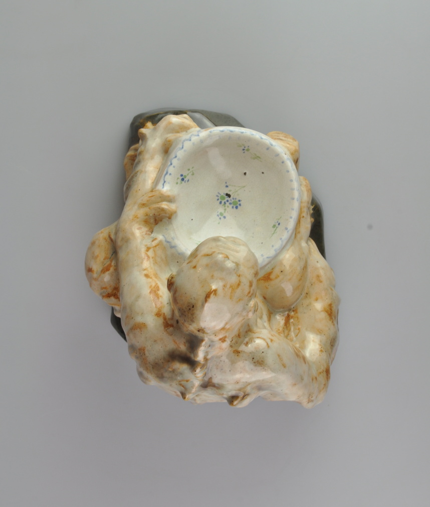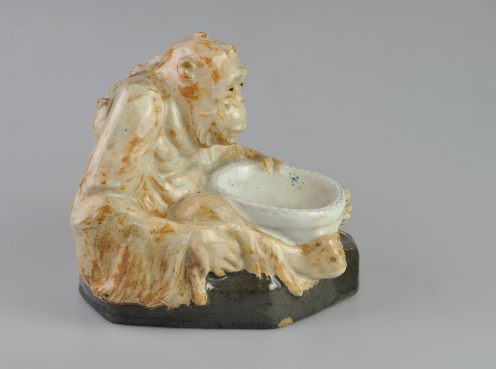 Figurální keramická miska v podobě opice, glazovaná, Bechyně, Československo, kolem roku 1920; výška 15 cm, délka 17 cm, šířka 14 cm