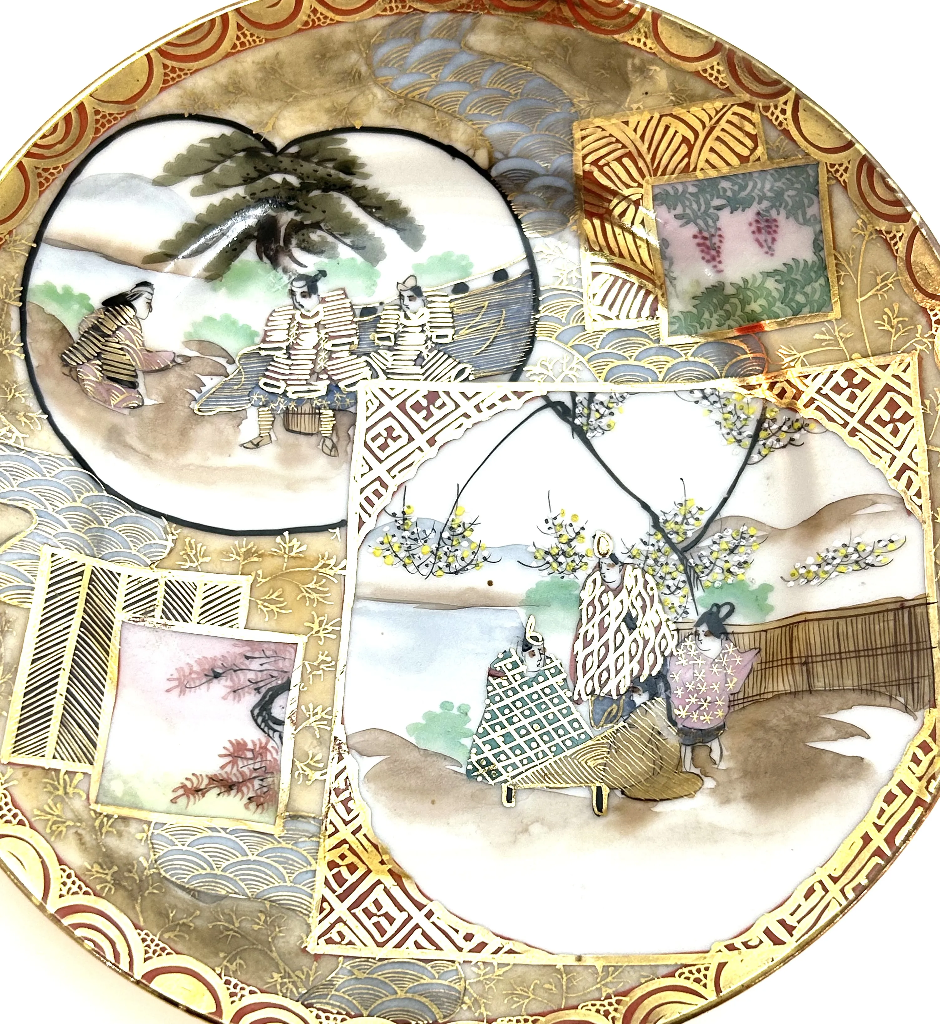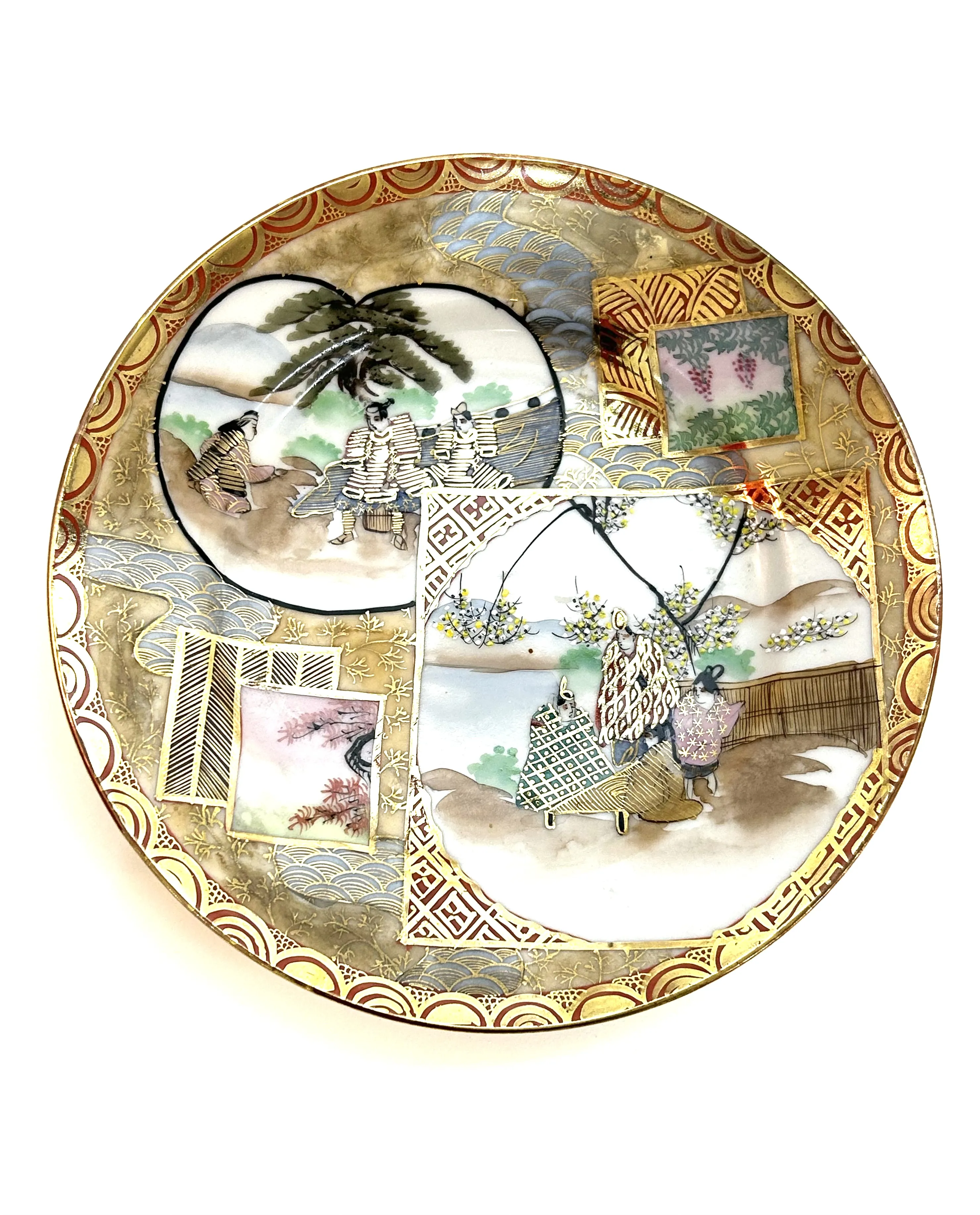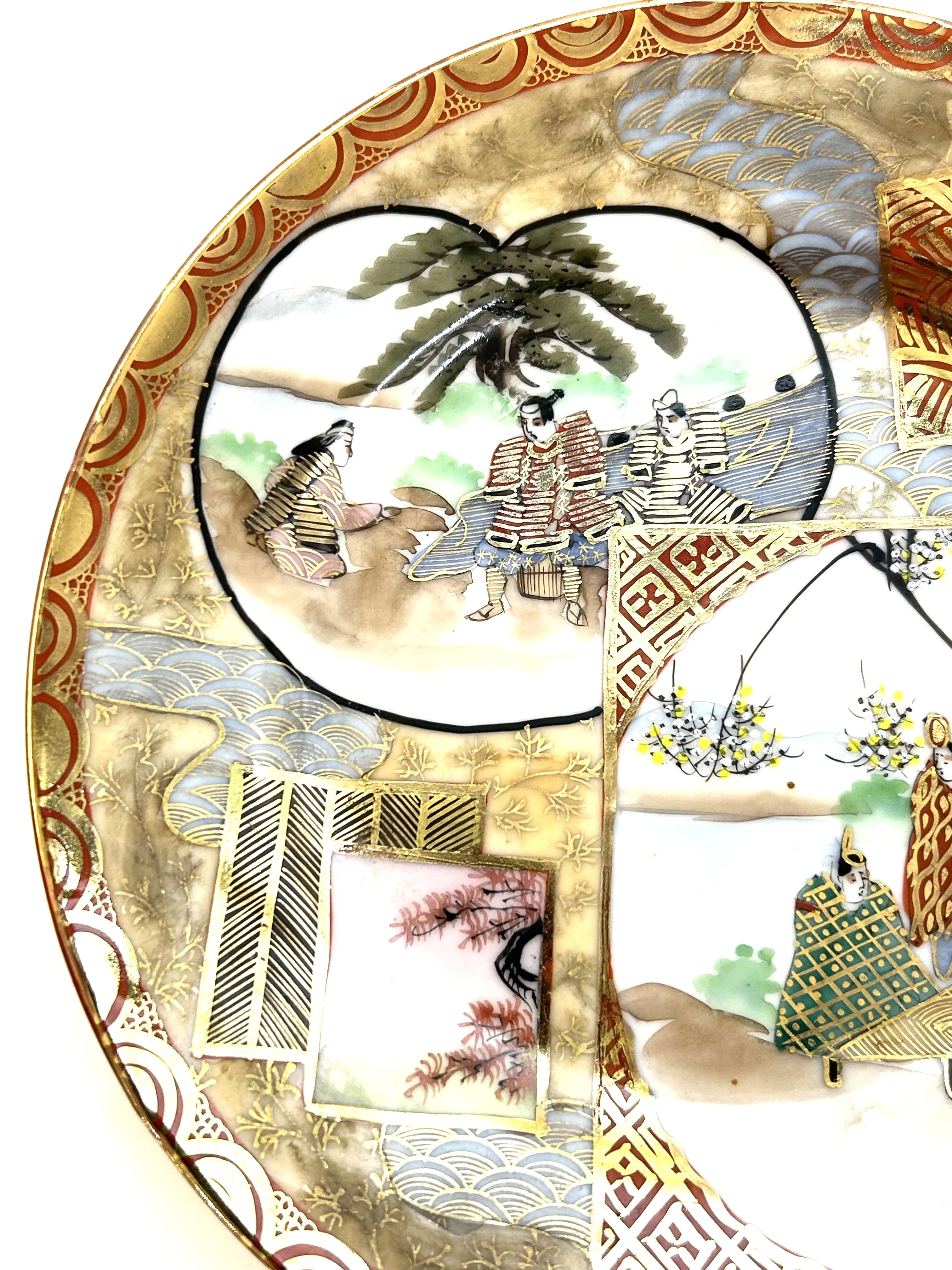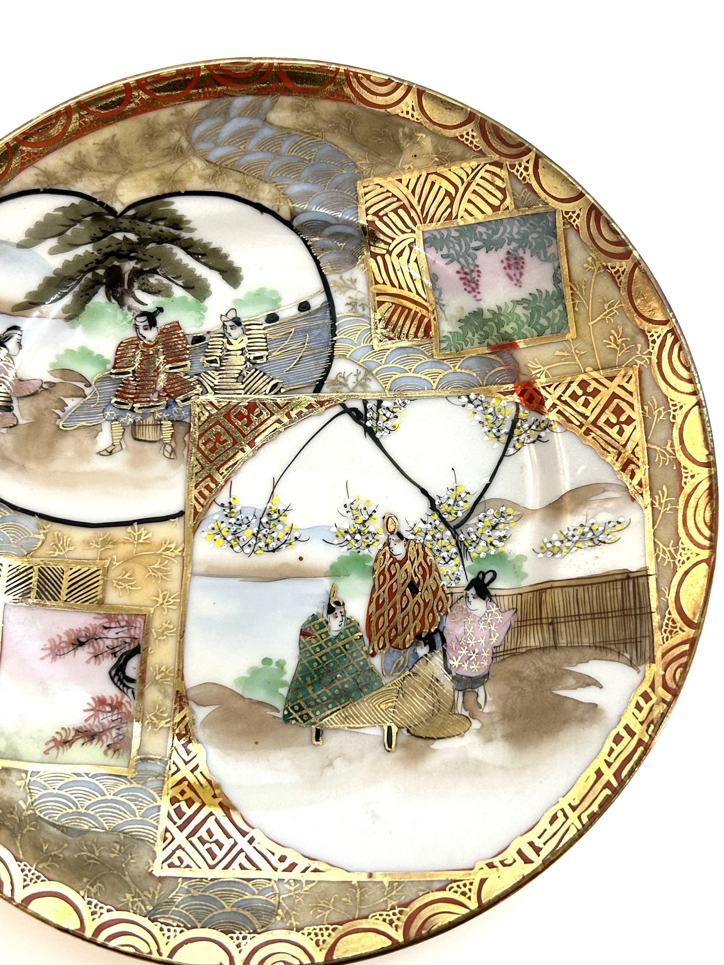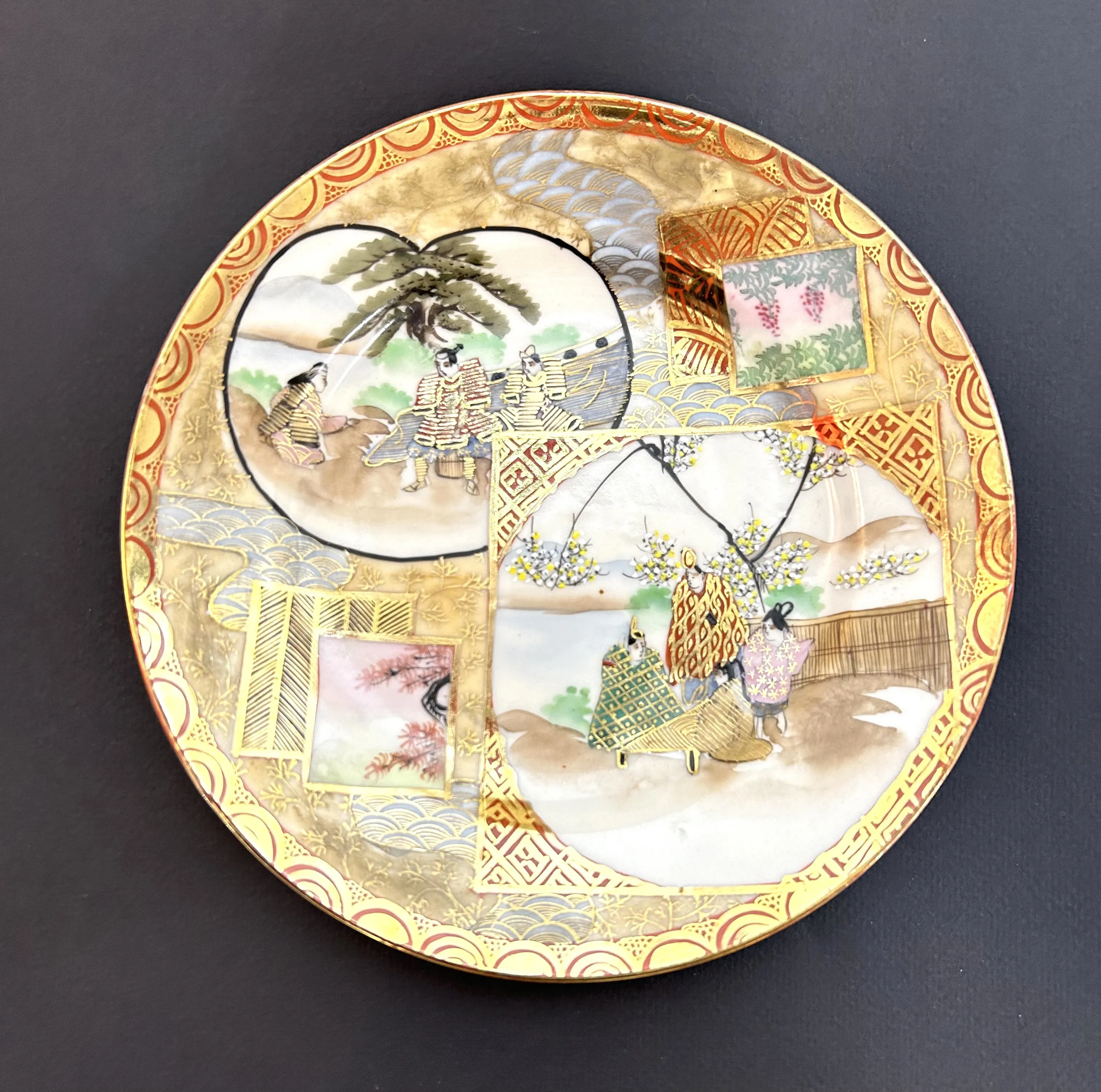 Originální porcelánový ručně malovaný a zlacený luxusní dezertní talířek z Japonska, druhá polovina 19. století. Motivem vzoru Satzuma jsou scenérie ze života šógunů a gejš. Průměr 18 cm.