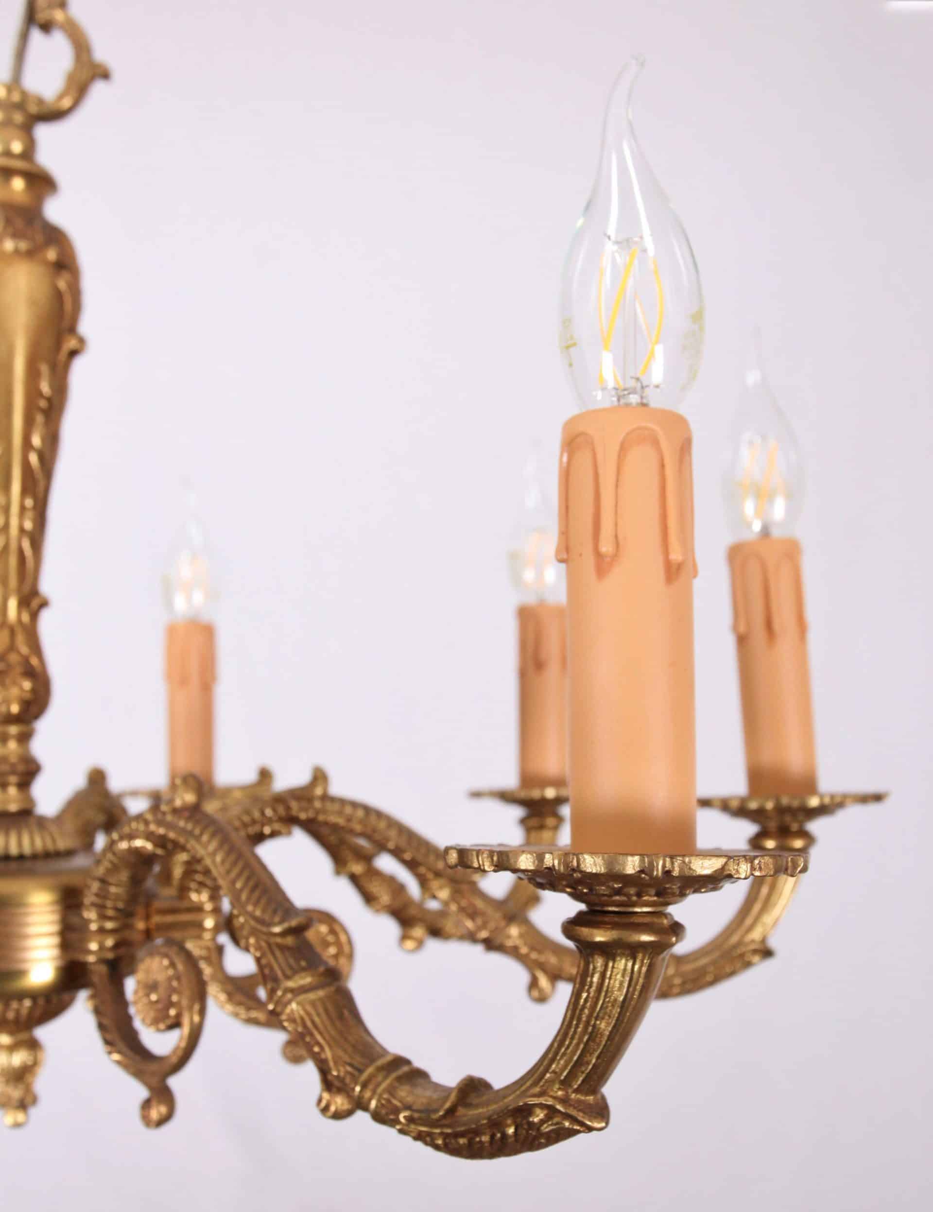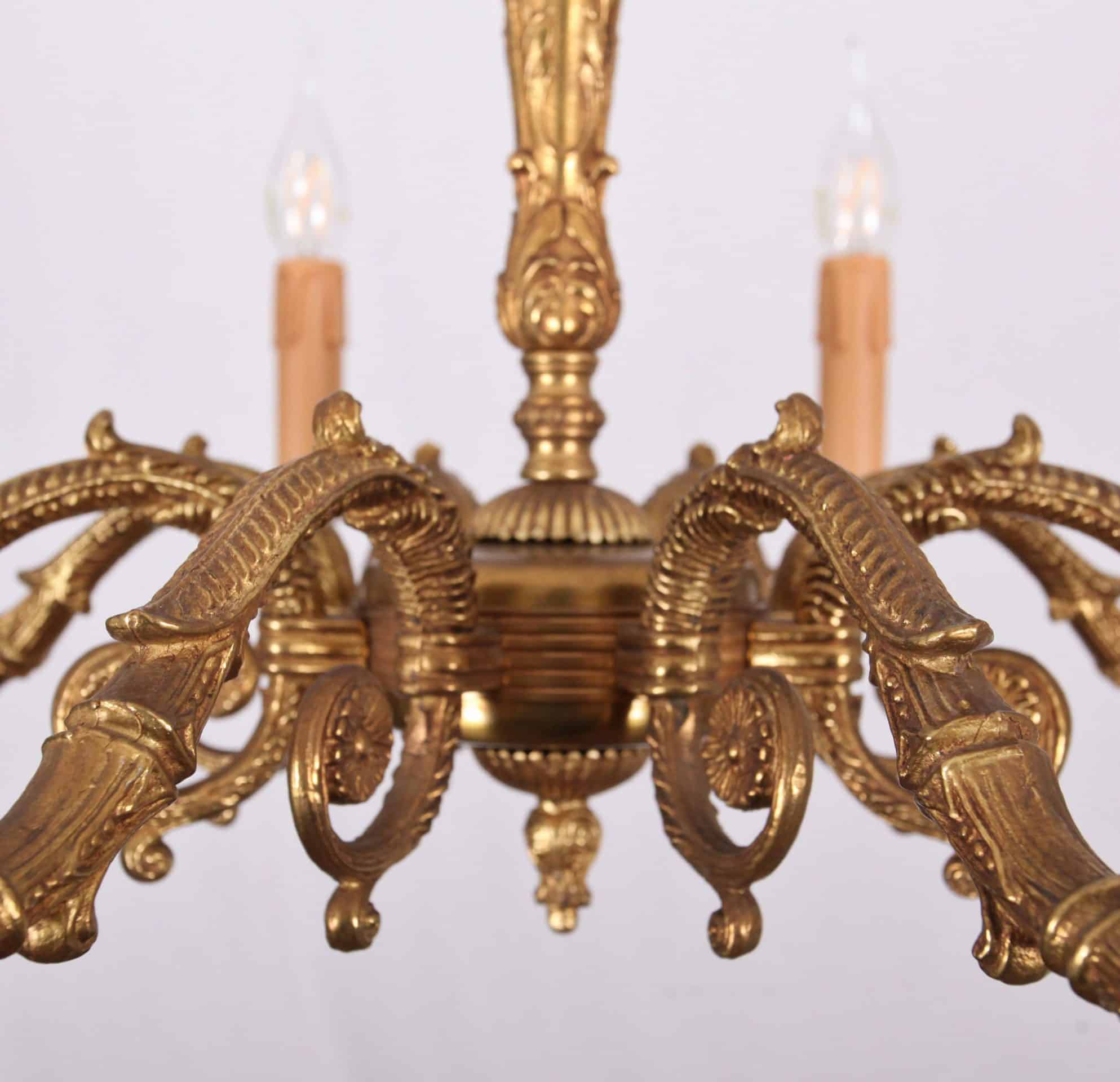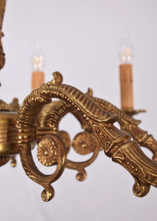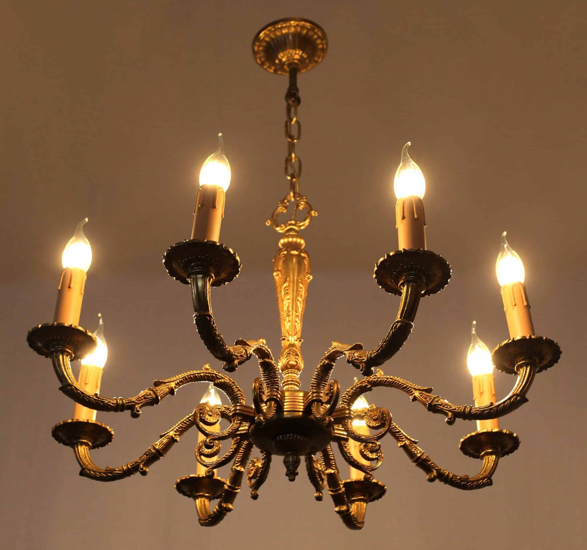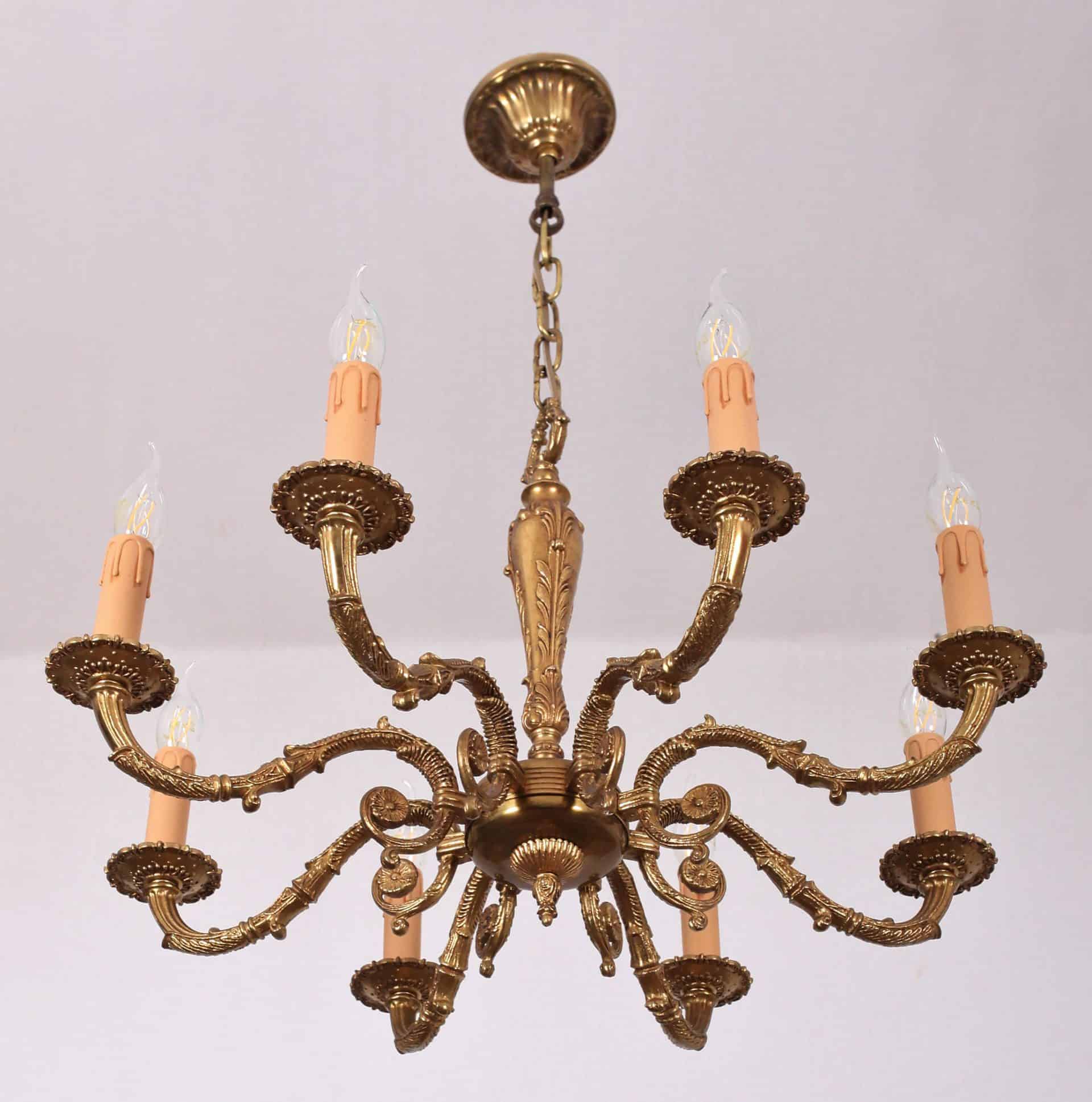 Litá mosaz. Velmi kvalitní provedení. Bohaté zdobení. Zrestaurovaná elektroinstalace: nové kabely, objímky i krytky – ihned k užívání. Žárovky s klasickým svíčkovým závitem E14 do 60W (vhodné jsou klasické i led žárovky).