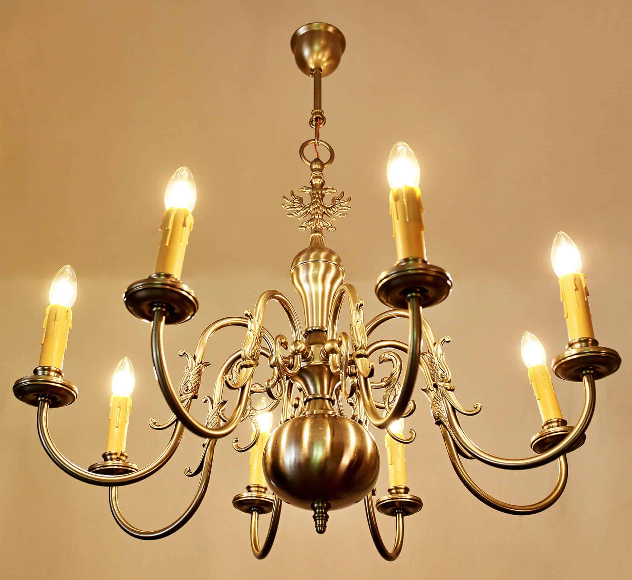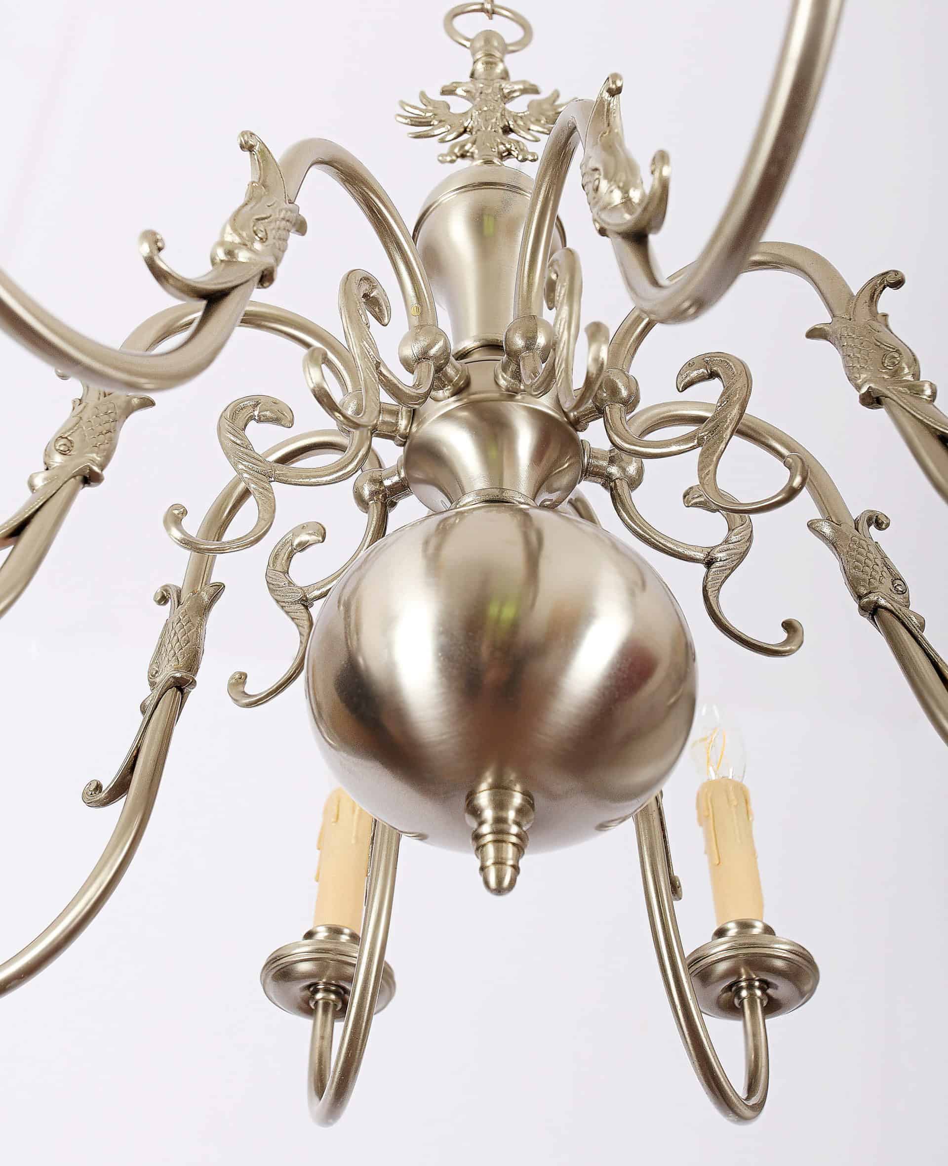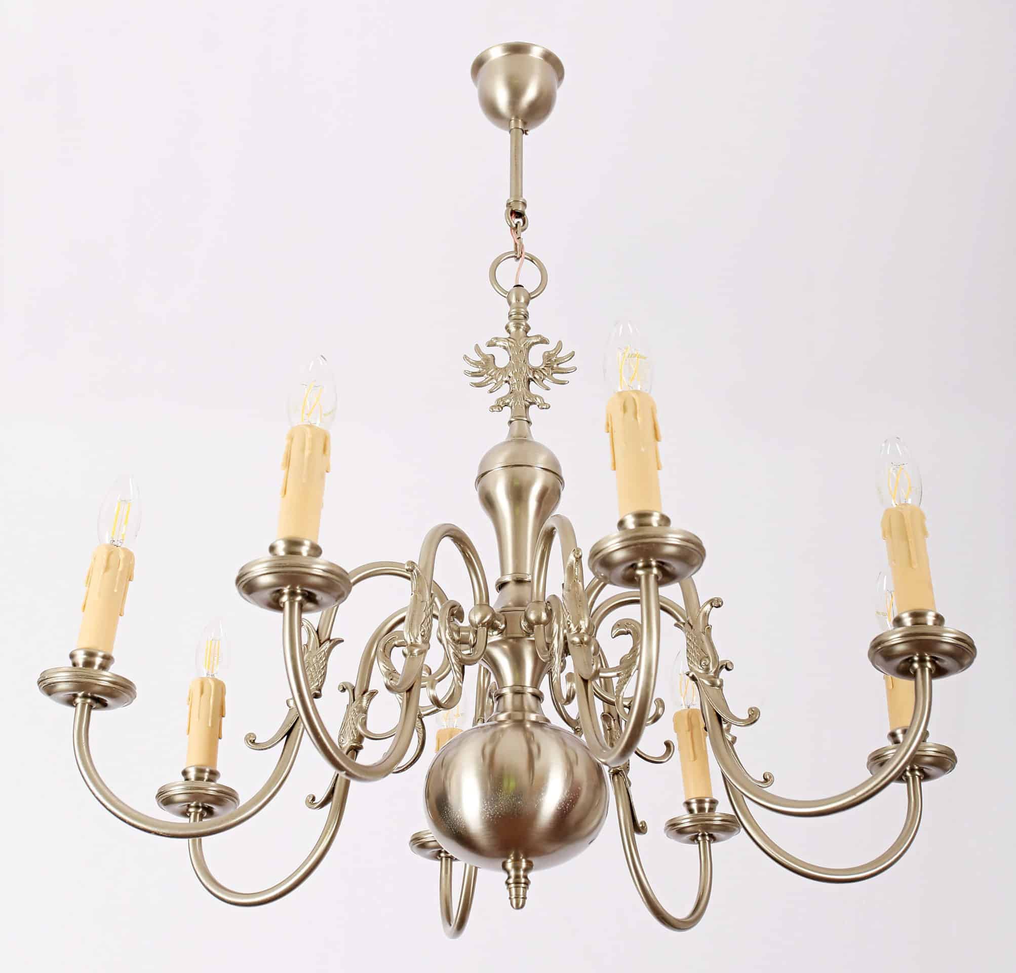 Krásný lustr bílé mosazi zdobený rybami a orlicí. Zkontrolovaná elektroinstalace – ihned k užívání. Žárovky s klasickým svíčkovým závitem E14 do 60W (vhodné jsou klasické i led žárovky).