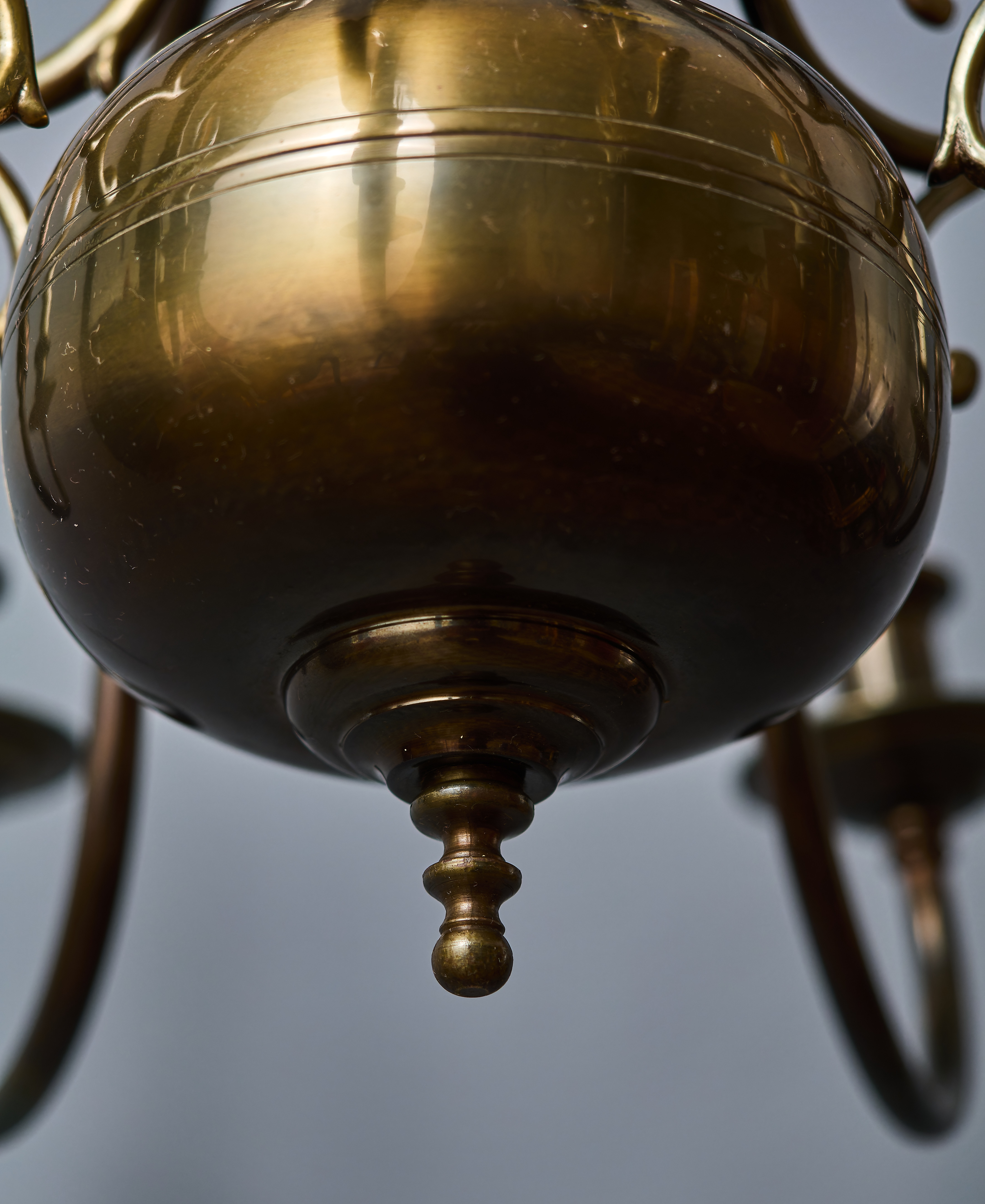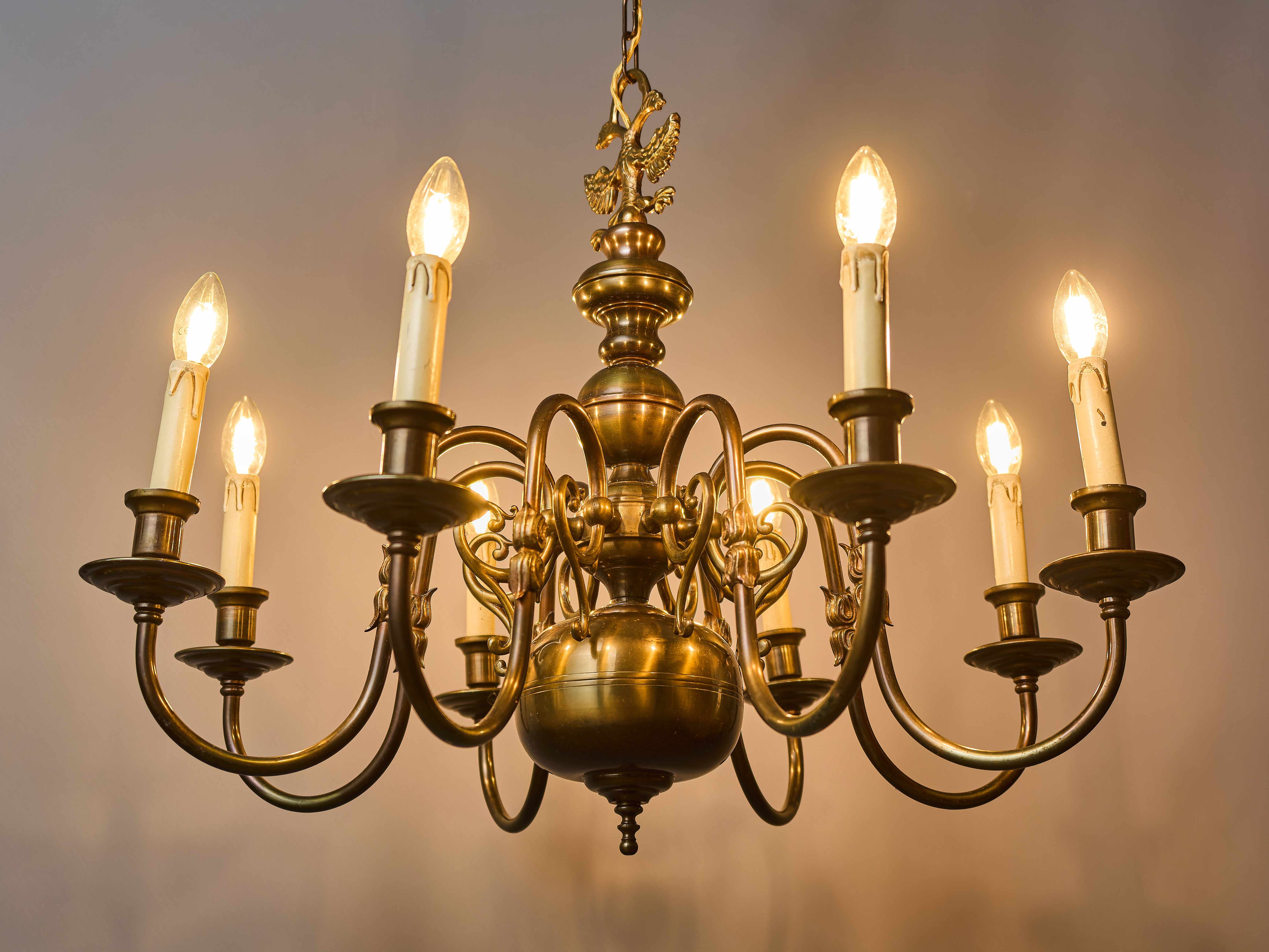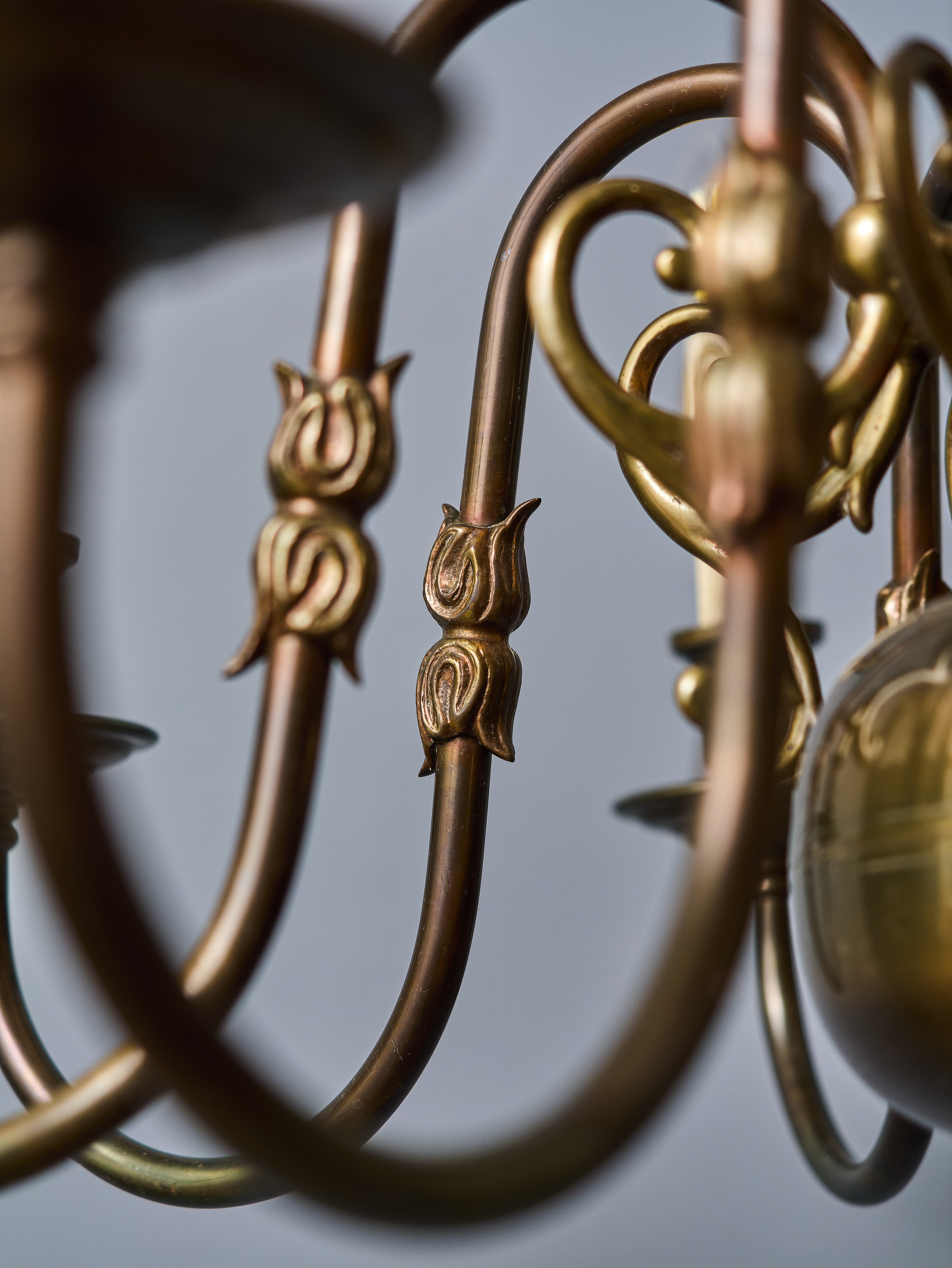 Krásný vlámský lustr z patinované mosazi. Ramena jsou florálně zdobená. Vrchní část s vlámskou orlicí. Zrestaurovaná elektroinstalace – ihned k užívání. Žárovky s klasickým svíčkovým závitem E14 do 60W (vhodné jsou klasické i led žárovky).