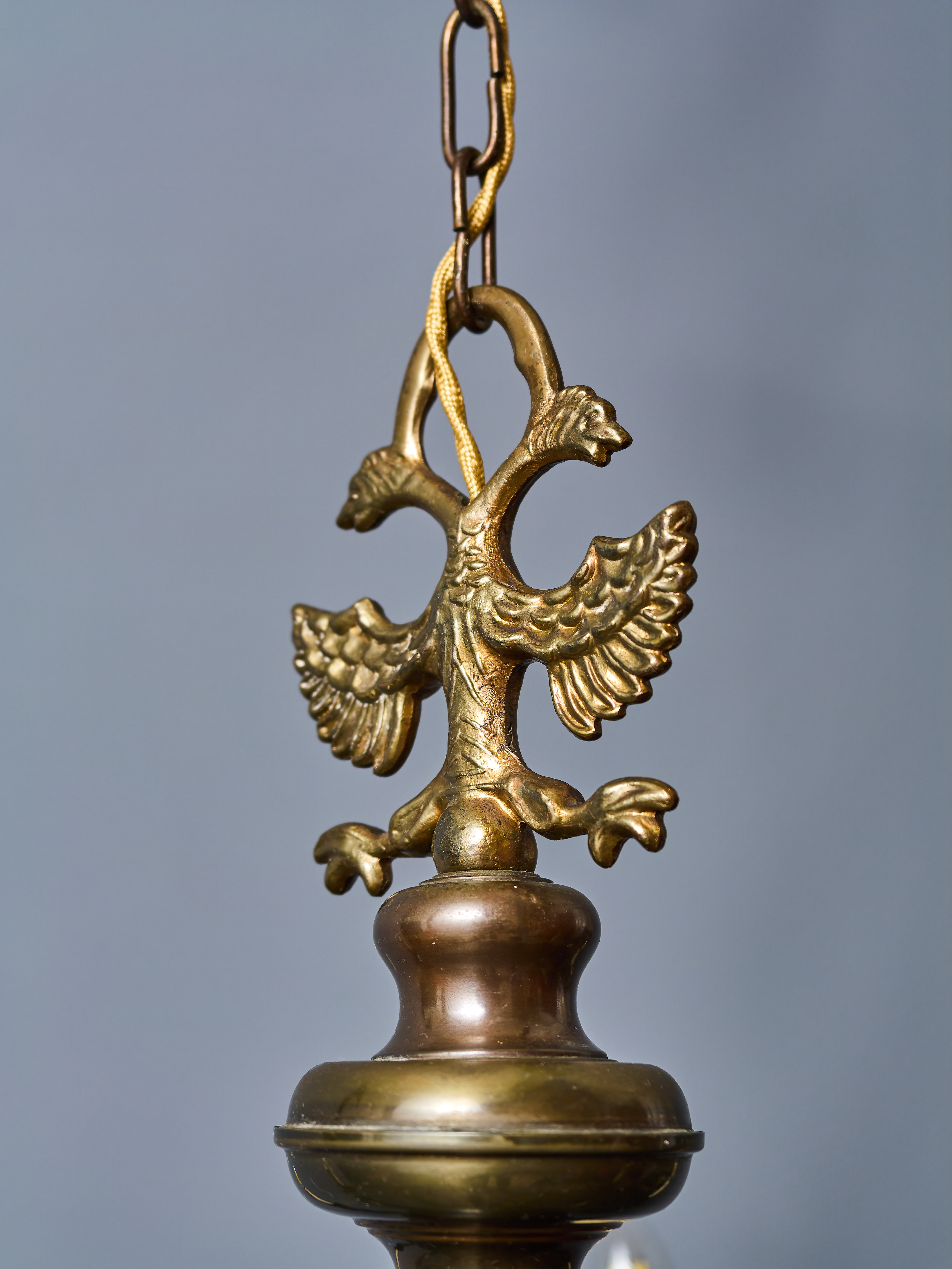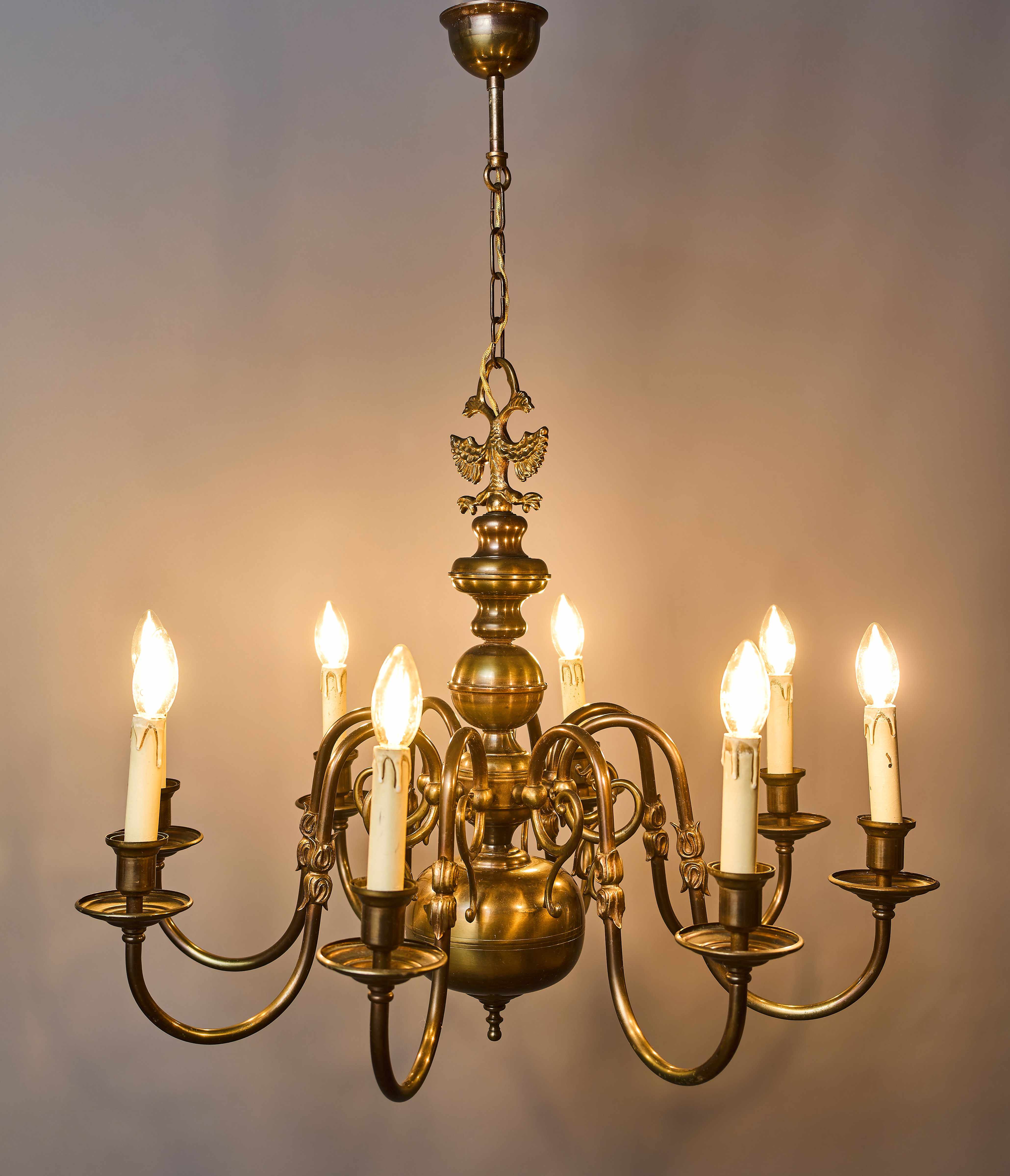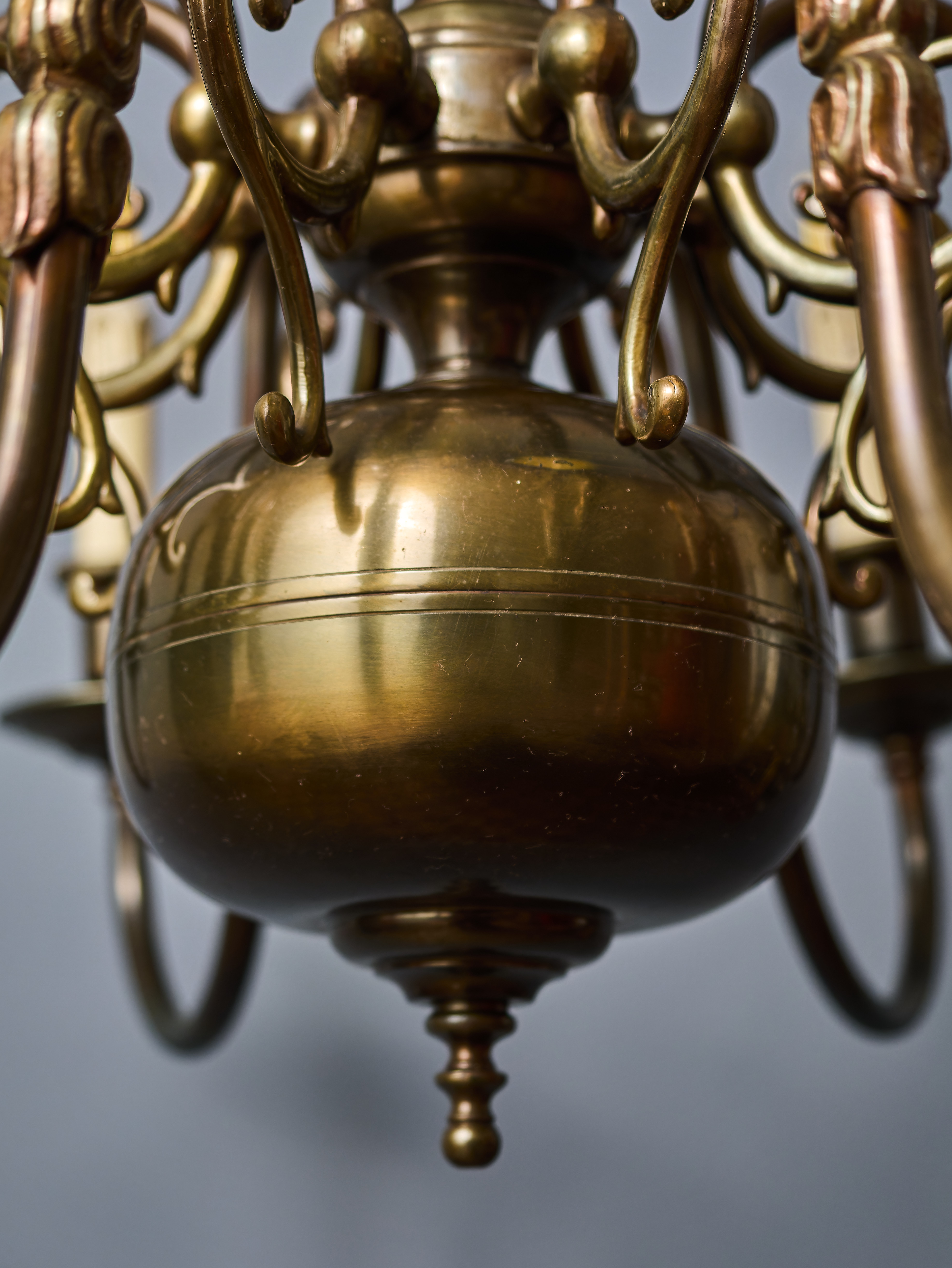 Krásný vlámský lustr z patinované mosazi. Ramena jsou florálně zdobená. Vrchní část s vlámskou orlicí. Zrestaurovaná elektroinstalace – ihned k užívání. Žárovky s klasickým svíčkovým závitem E14 do 60W (vhodné jsou klasické i led žárovky).