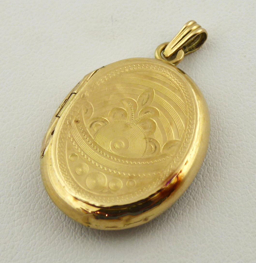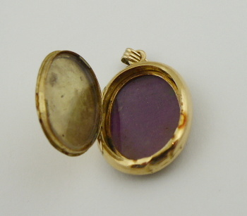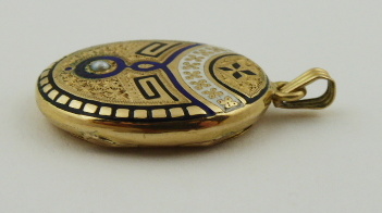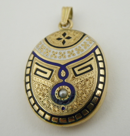 Čtrnáctikarátové zlato, ručně malovaný email a sladkovodní perlička. Ryzost Au 585/1000, celková hmotnost 2,70 g. Otevírací zlatý medailon s ručně černým, modrým a bílým emailem malovanými geometrickými a florálními ornamenty doplněnými něžnou malou sladkovodní perličkou. Líc i rub zdobený jemným gravírováním. Uvnitř medailonu místo na uložení symbolického miniaturního předmětu na památku. Na jednom místě okem nepatrná odborně a kvalitně provedená oprava emailu. Značeno: rakousko-uherský vídeňský punc pro cizí zboží. Střední Evropa 1870 – 1900. Výška bez očka 24 mm, výška s očkem 30 mm, šířka 18 mm.