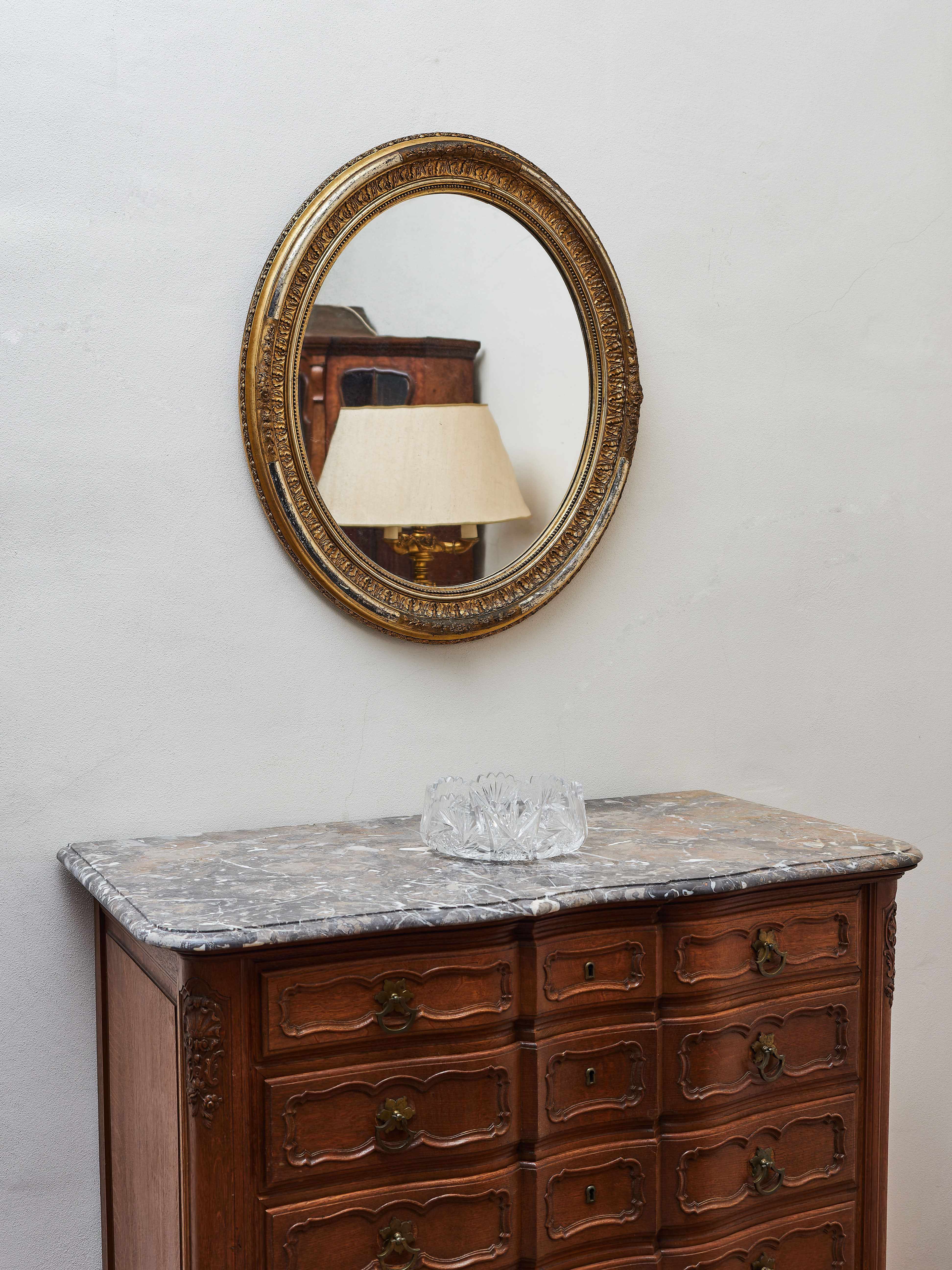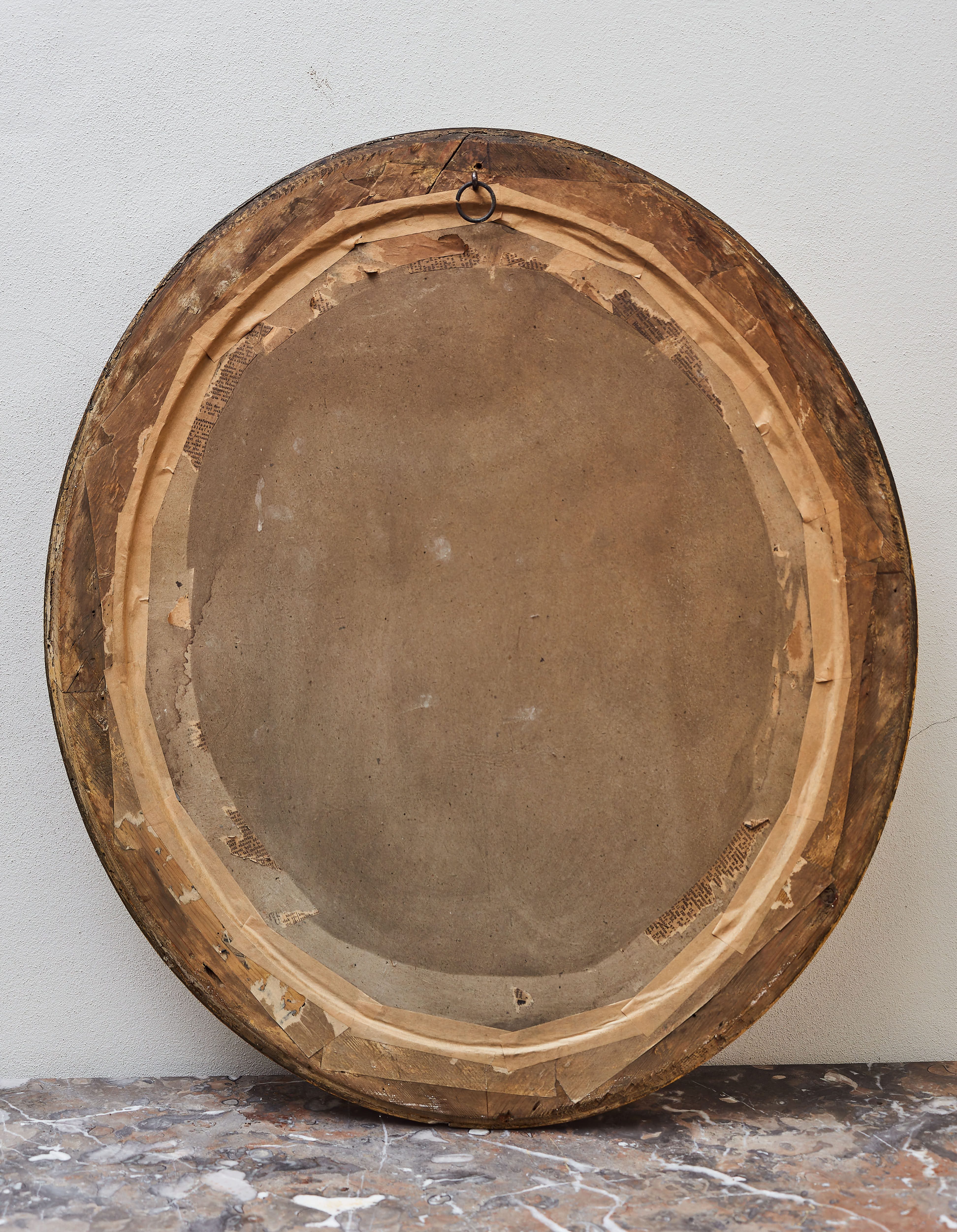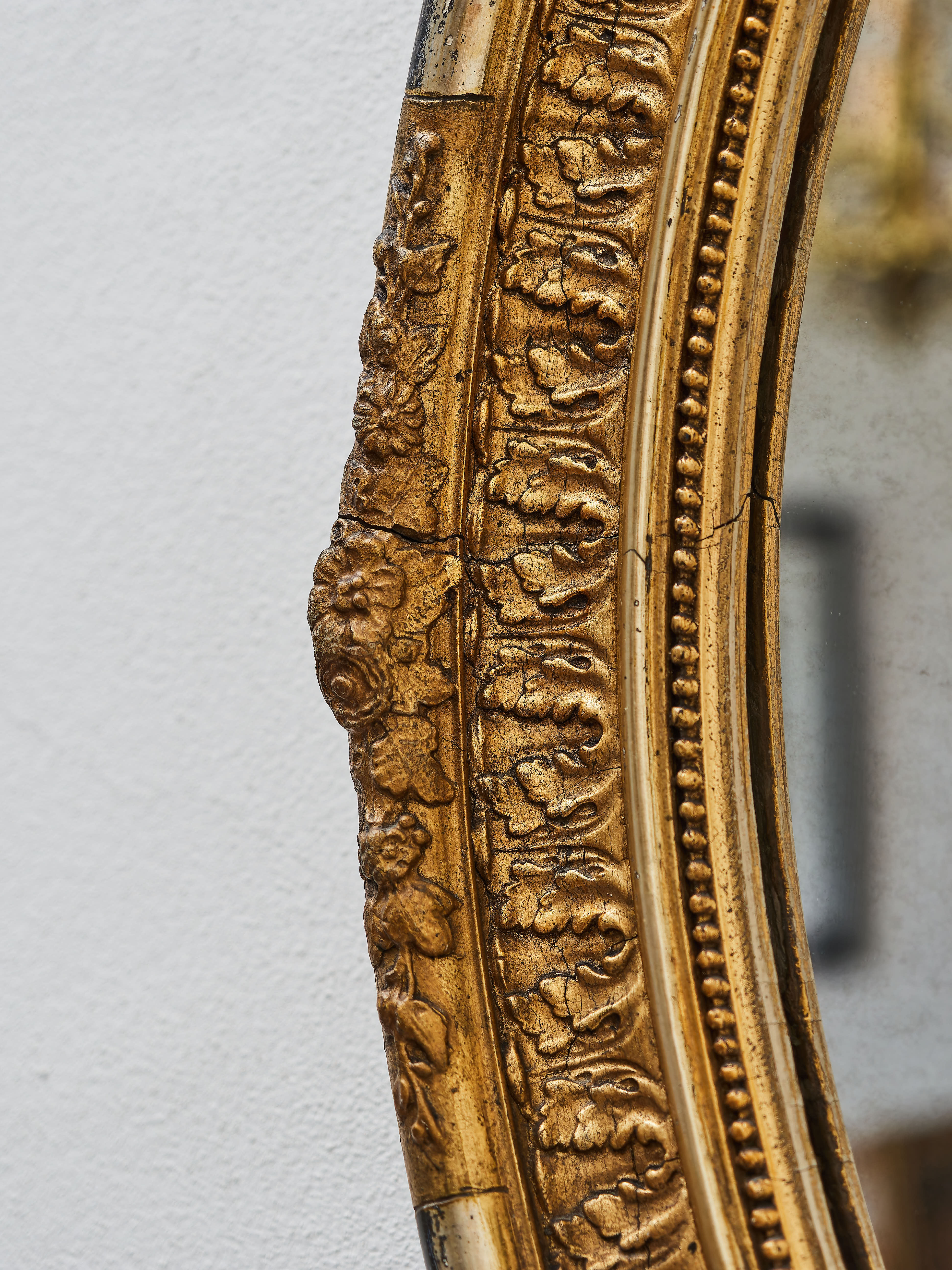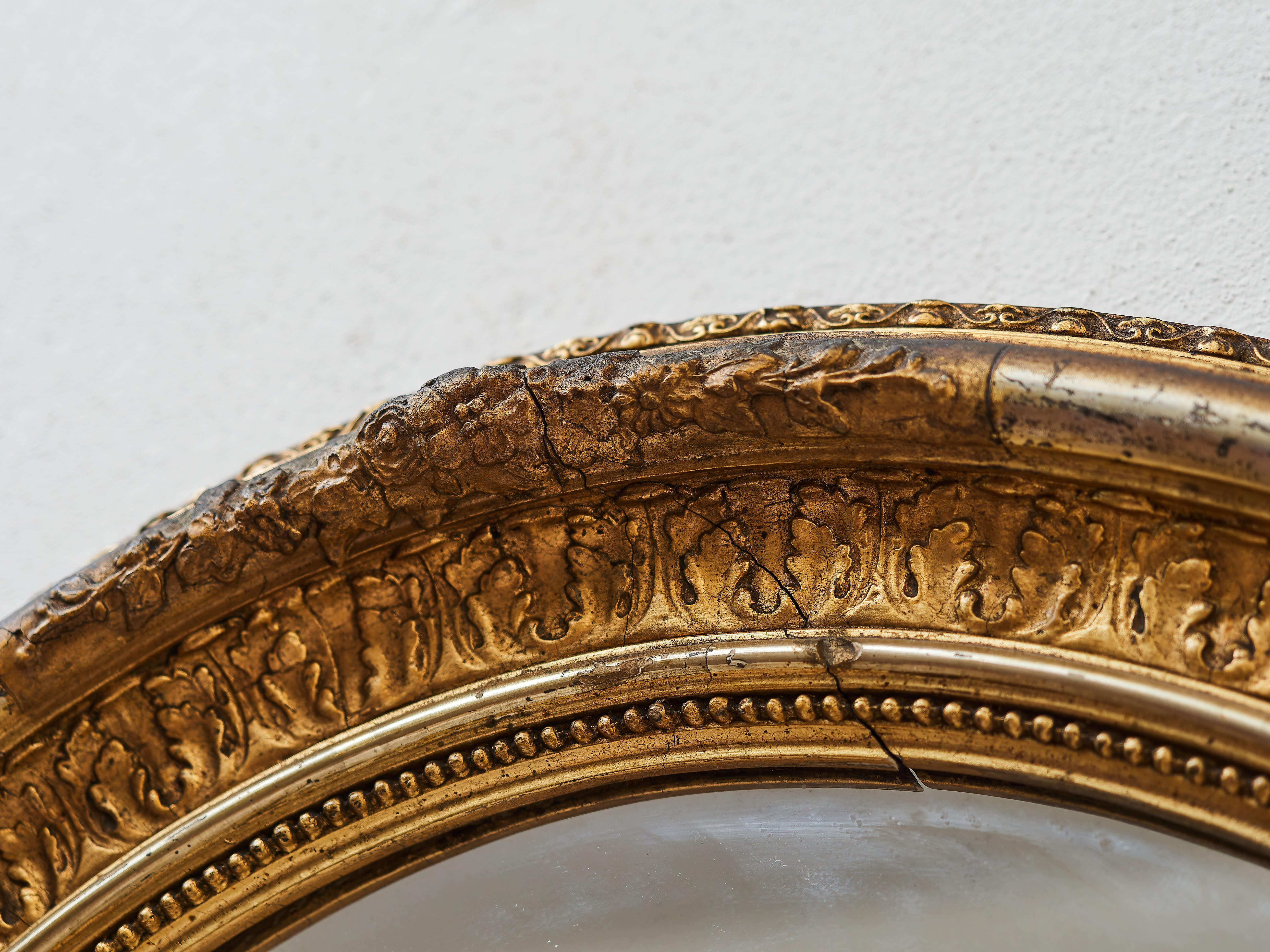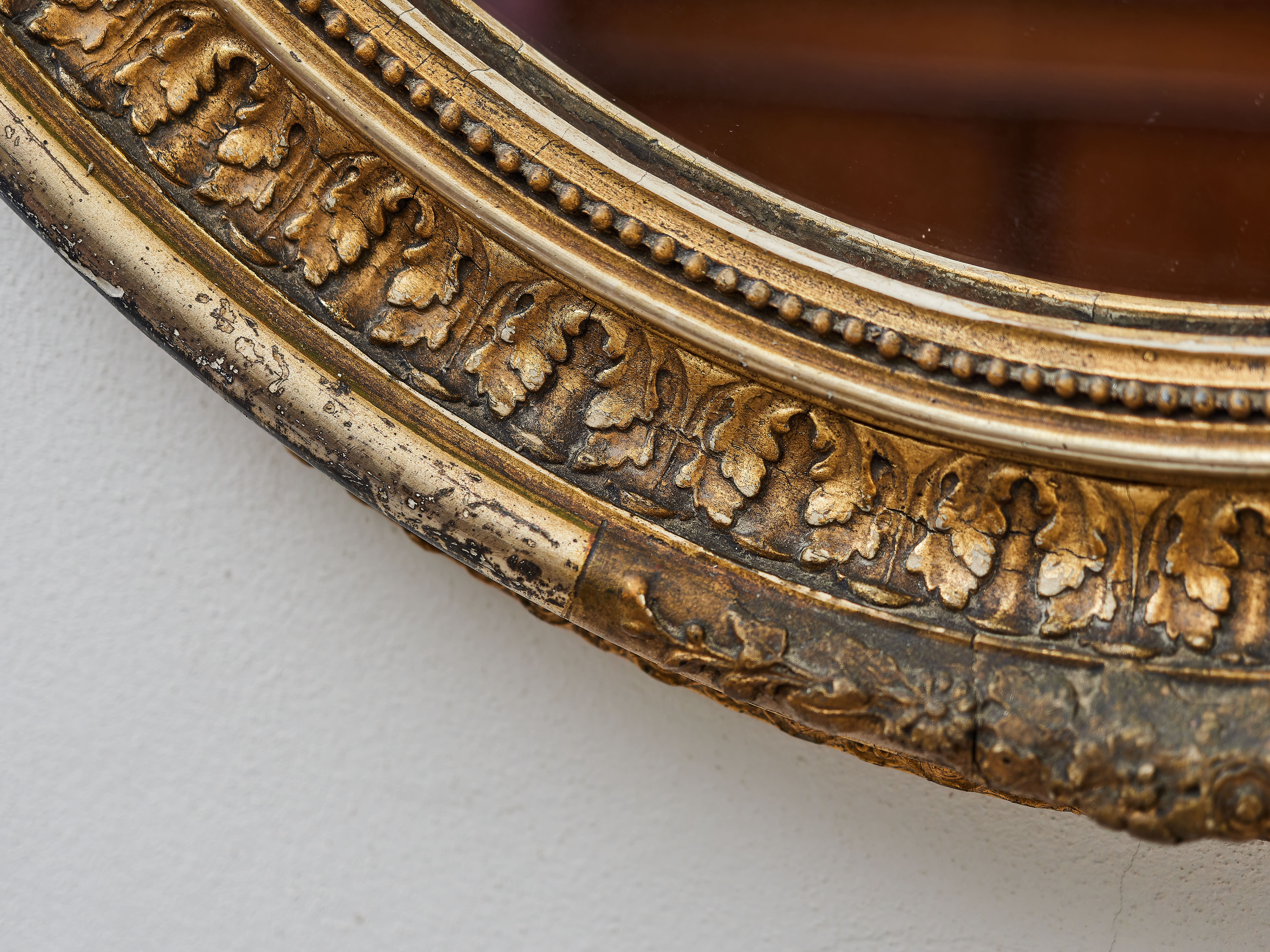 Dekorativní oválné zrcadlo z 19. století s původním zlaceným rámem, zdobeným reliéfními motivy listů a květin. Rám vykazuje přirozenou patinu a místy drobné opotřebení, které podtrhuje jeho historický charakter. Zrcadlová výplň je původní, s jemnými stopami stáří. Tento kus je reprezentativním příkladem interiérového doplňku z období historismu, vhodný jako sběratelský předmět i výrazný solitér do klasického interiéru.