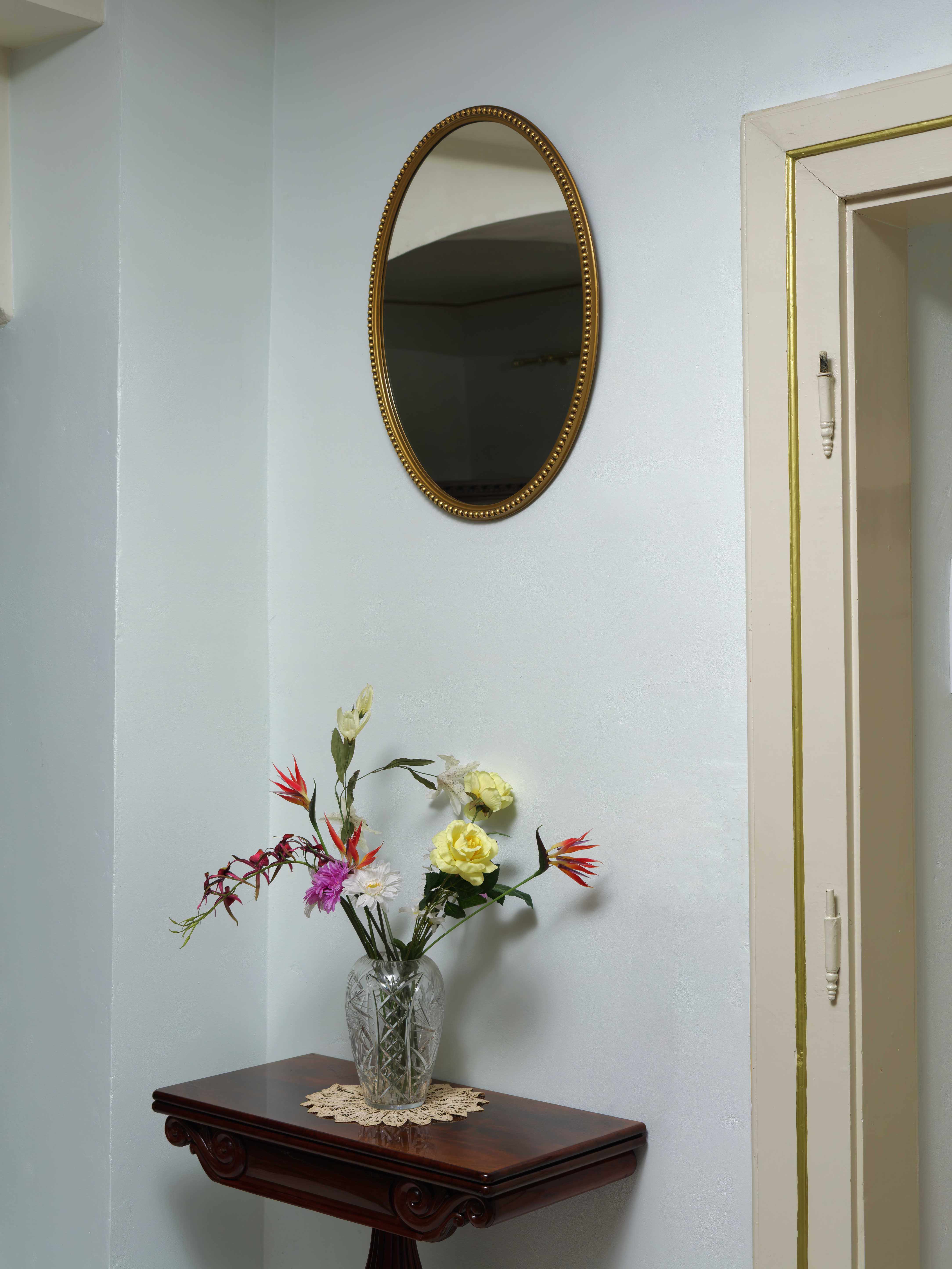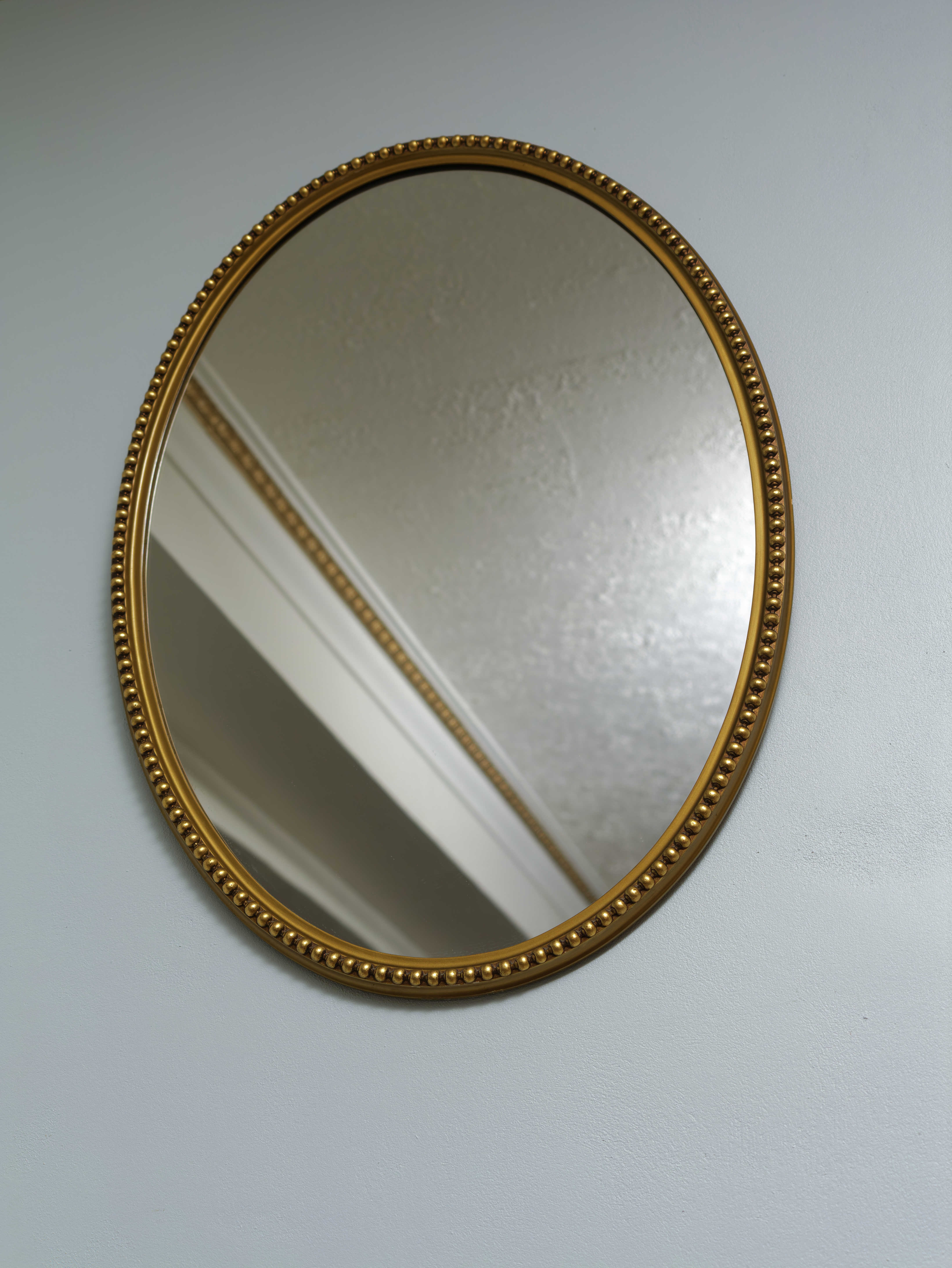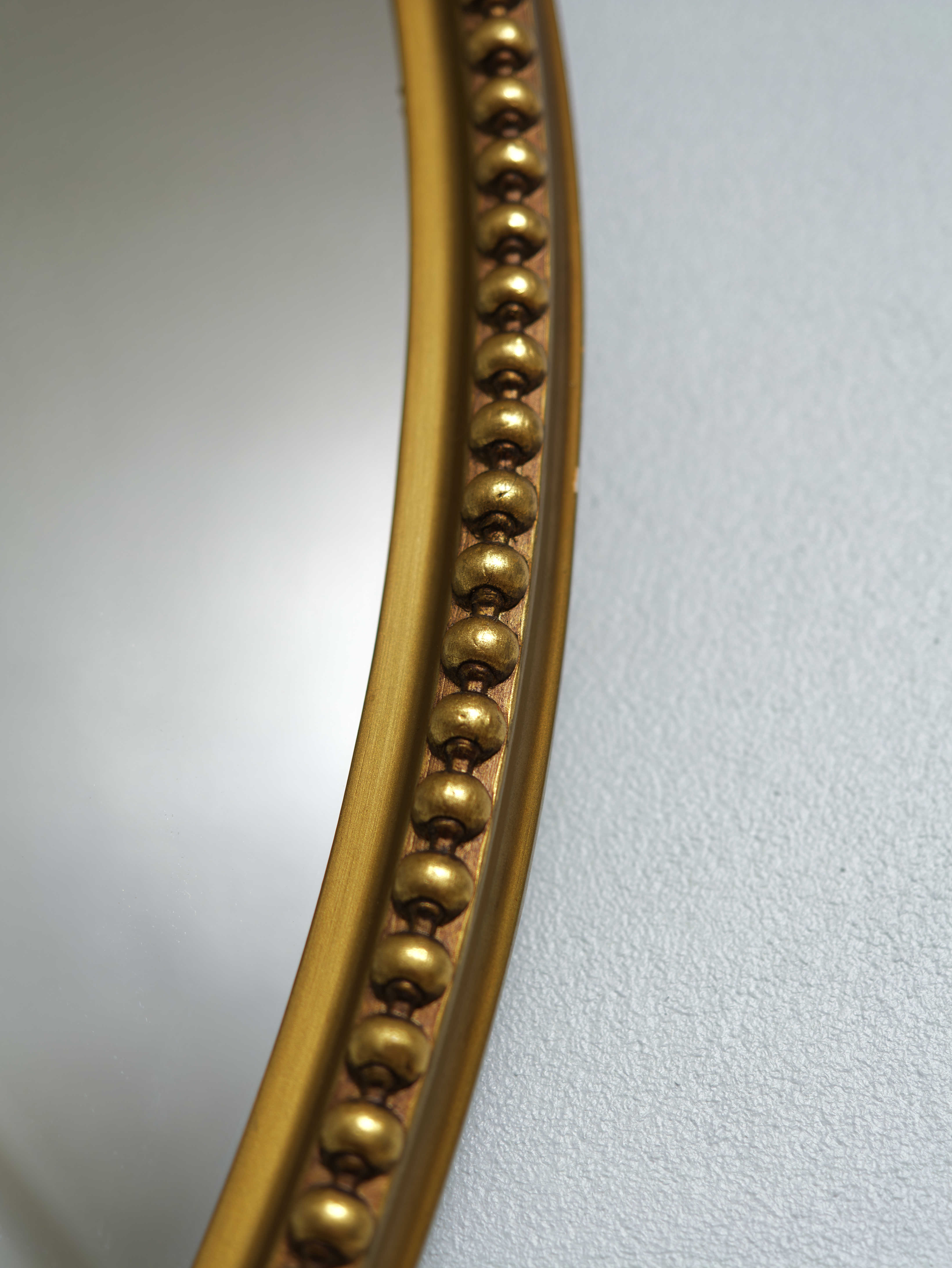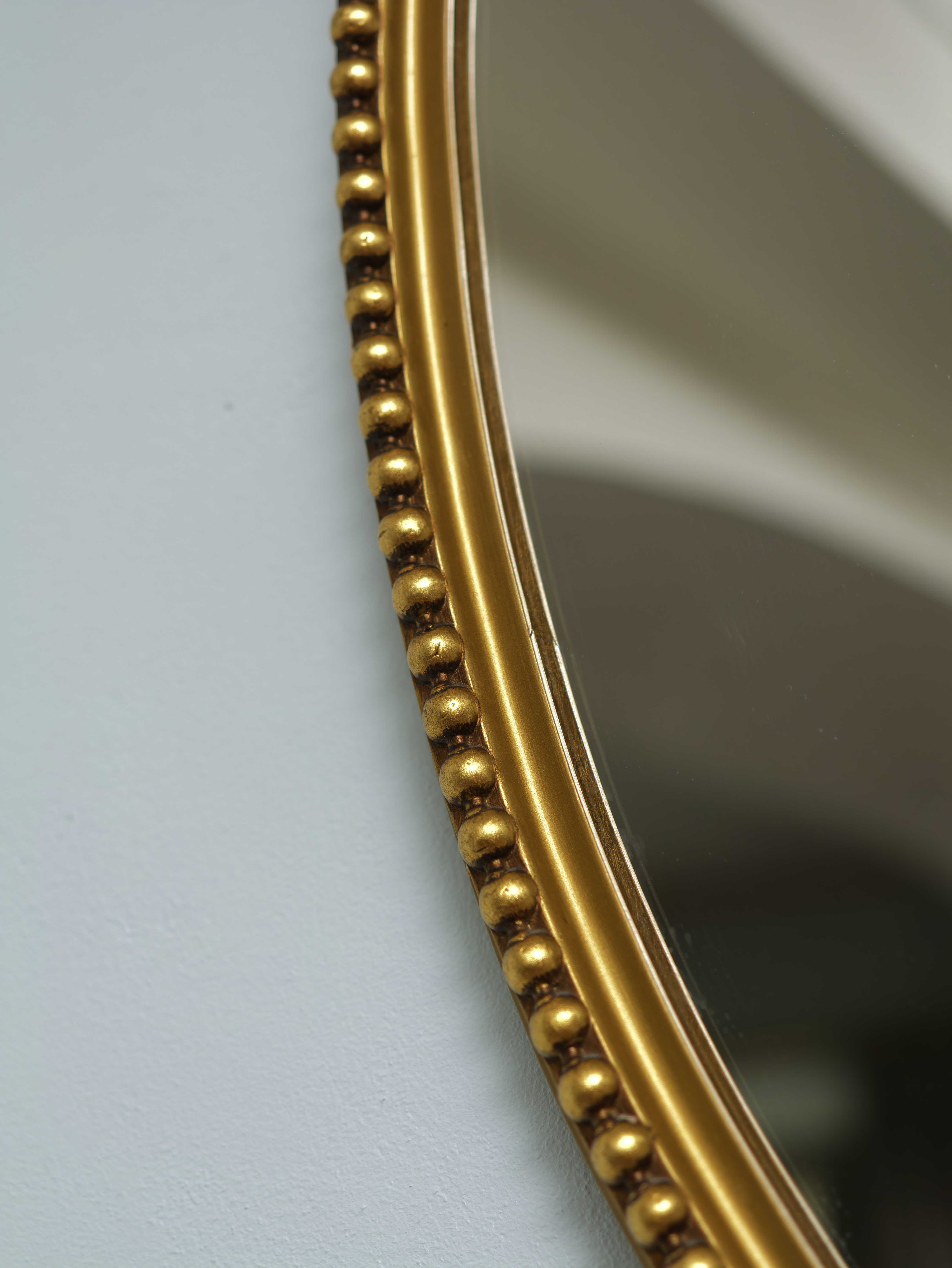 Elegantní oválné nástěnné zrcadlo v jemně zlaceném rámu s plastickým perlovcem po obvodu. Rám je štíhlý, proporčně velmi vyvážený a působí lehkým, kultivovaným dojmem, typickým pro klasicistní a raně empírové formy, které byly oblíbené i v pozdějších historizujících interiérech.