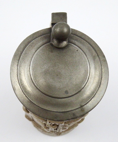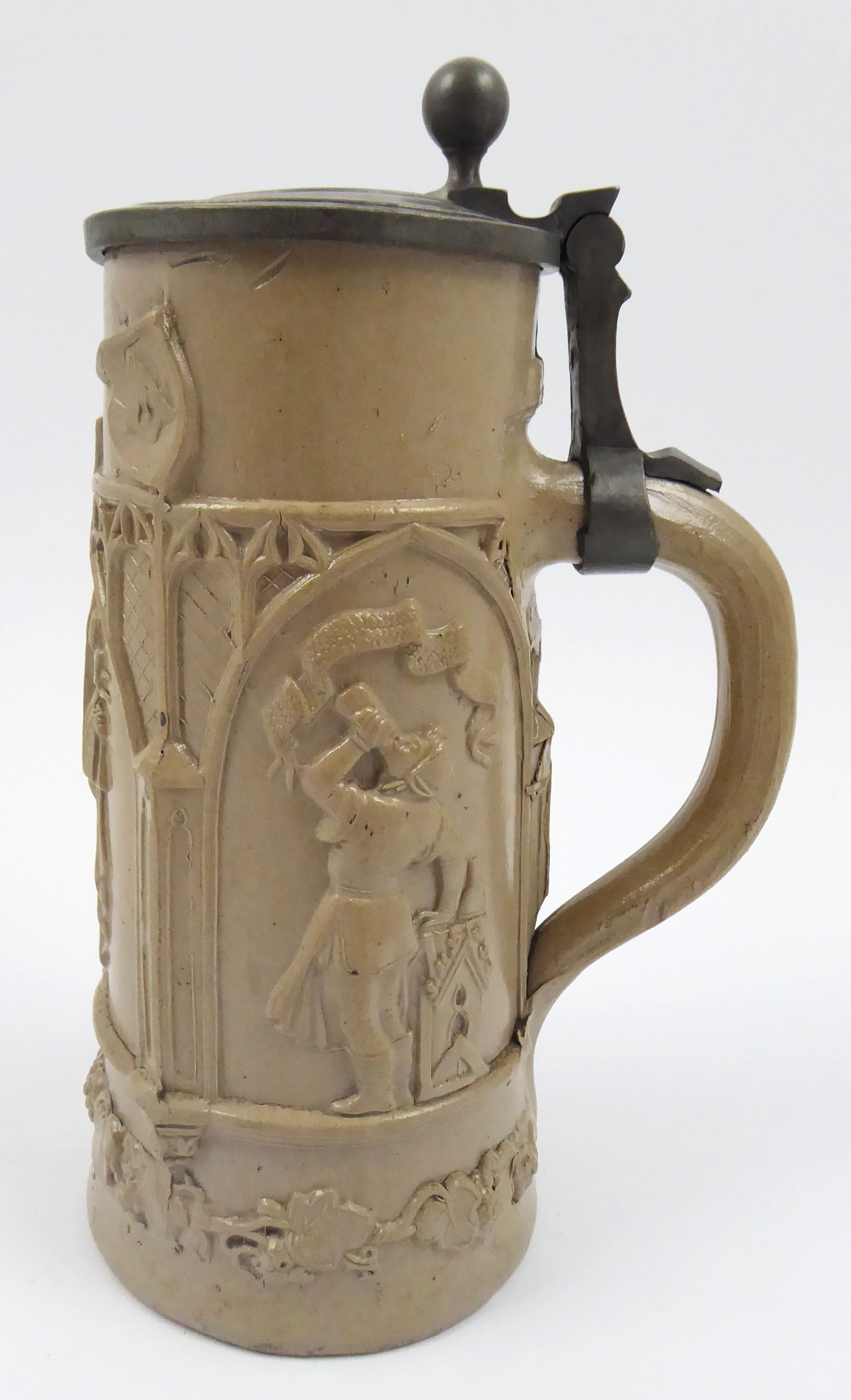 Tvrdá kamenina se solnou glazurou, cín. V gotickém historizujícím stylu. Vyšší pamětní korbel s polévanou bělavou solnou šlemovkou, s cínovým víkem, montáží a kulovitou opěrkou palce. Zdoben reliéfními výjevy v gotických oknech. V prostředním je zobrazena Panna Maria držící Katedrálu sv. Petra v Regensburgu, v krajních romantický pijácký motiv doplněný městskými znaky a věnečkem. Německo, Regensburg, třetí třetina minulého století. Výška 21 cm.