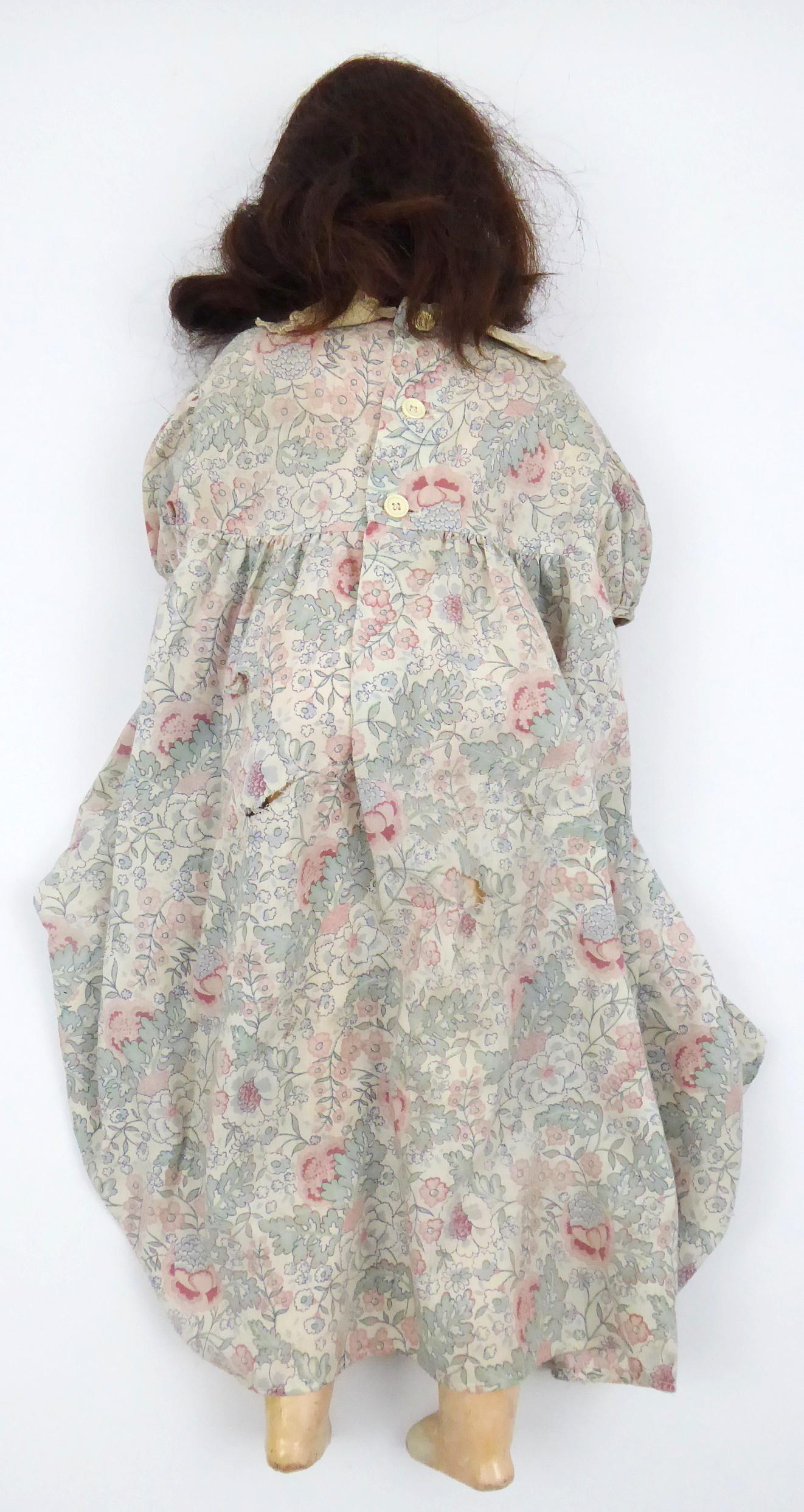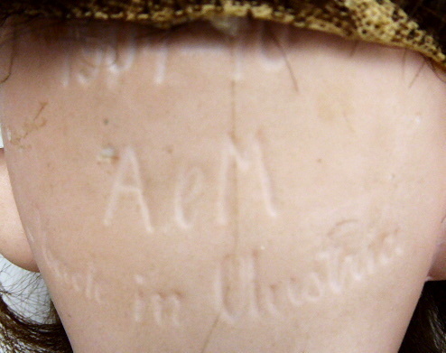 Neglazovaný ručně malovaný porcelán (biskvit), dřevo, sklo, přírodní vlasy, tkanina, kov. Výrobce: Aich Porzellanfabrik založená v roce 1848 v Doubí u Karlových Varů, později po roce 1918 působící na trhu pod názvem Aich, Menzel & Company. Forma na panenky Menzel již z roku 1904, ale vyráběna až kolem roku 1918. Velikost 10. Velmi vysoká panenka s porcelánovou hlavičkou, ručně malovaným obličejem a nehty, s přírodními tmavými vlasy a dřevěným tělem s rukama i nohama na kloub. Oděná v dobové šaty s krajkovým límečkem a s nepůvodním řetízkovým náramkem na pravém zápěstí. Značeno: na temeni hlavy pod vlasy A & M, Made in Austria, 1904, 10. Čechy, Doubí u Karlových Varů, kolem roku 1918. Výška 70 cm. Velikost 10.