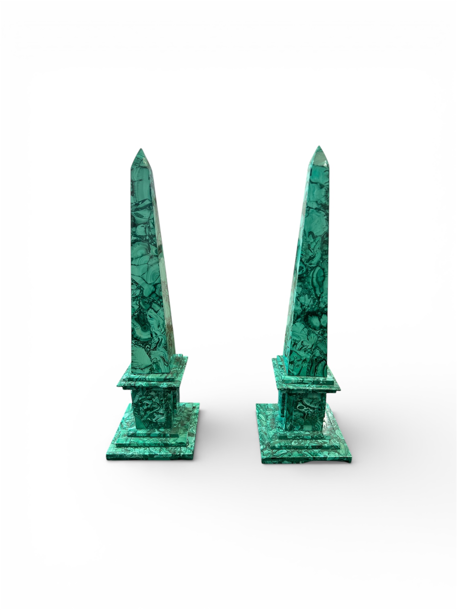 elegantní pár dekorativních sloupků z přírodního malachitu, datovaný přibližně do let 1970–1980. Kámen vyniká nádherně sytou zelenou barvou s typickou přírodní kresbou malachitu, která vytváří jedinečný a luxusní dojem. Povrch je pečlivě leštěný, což podtrhuje hloubku barvy i přirozenou strukturu kamene. Sloupky působí reprezentativně a harmonicky, skvěle se uplatní jako výrazná dekorace interiéru, ve vitríně či na komodě.