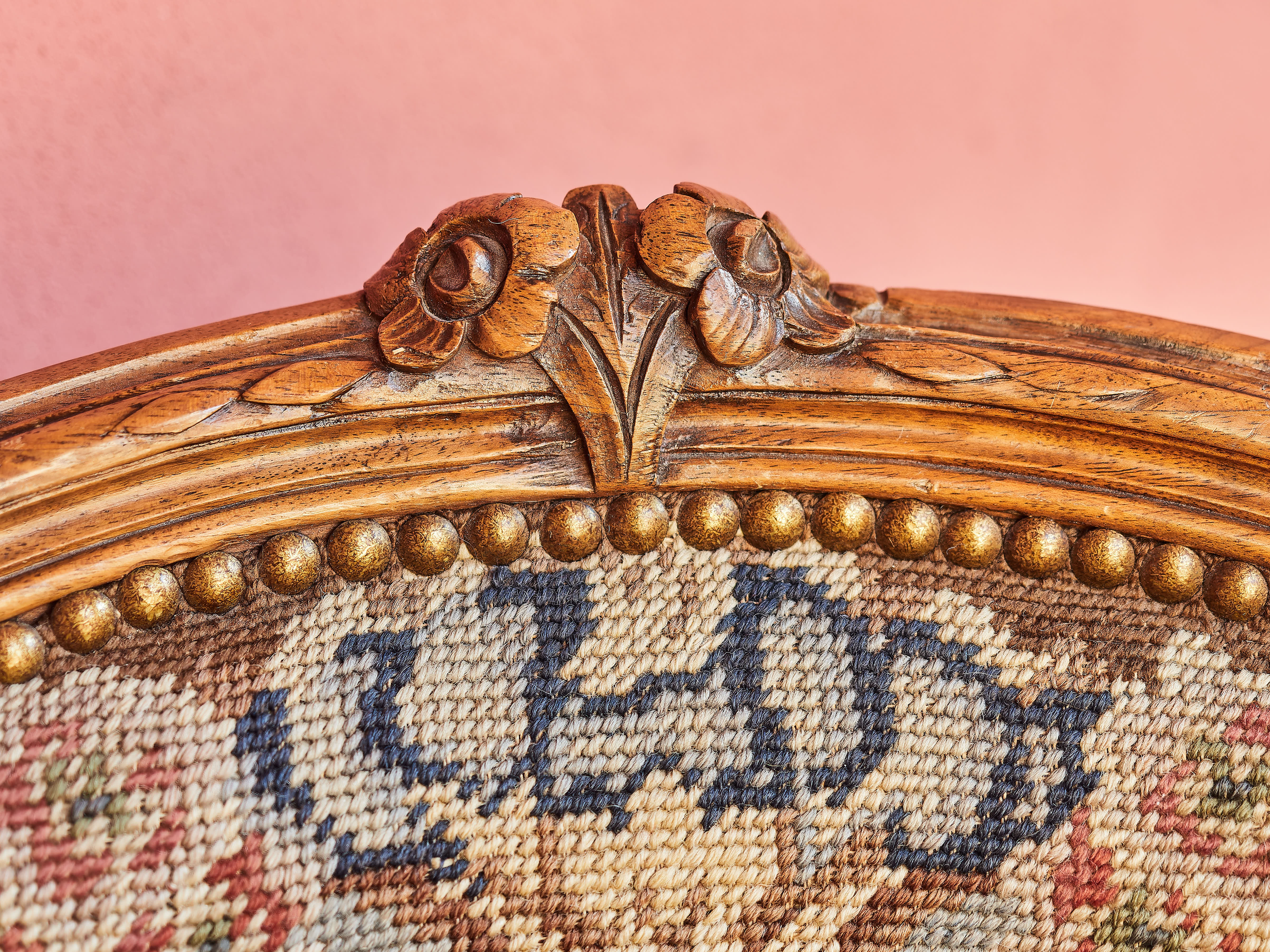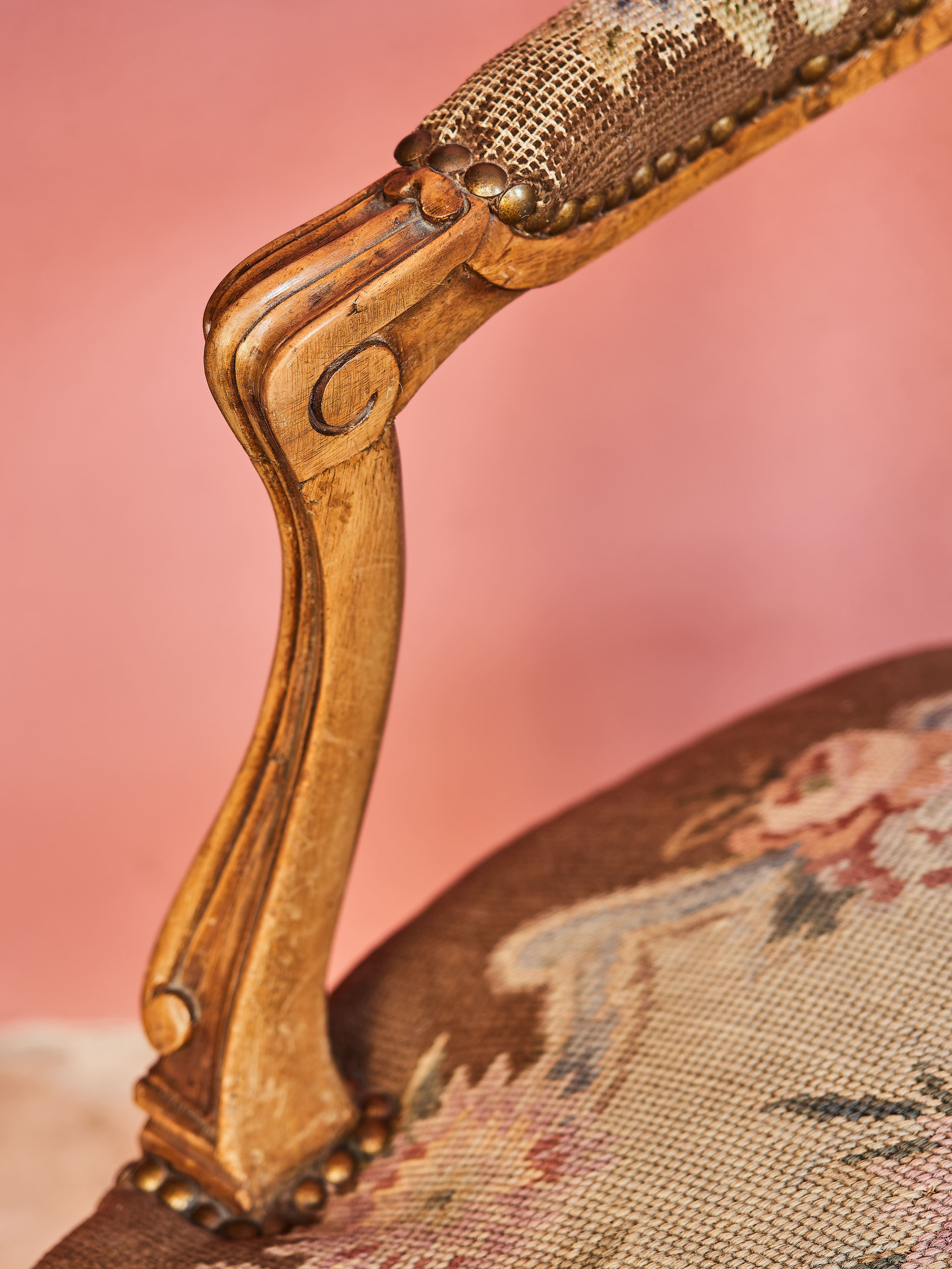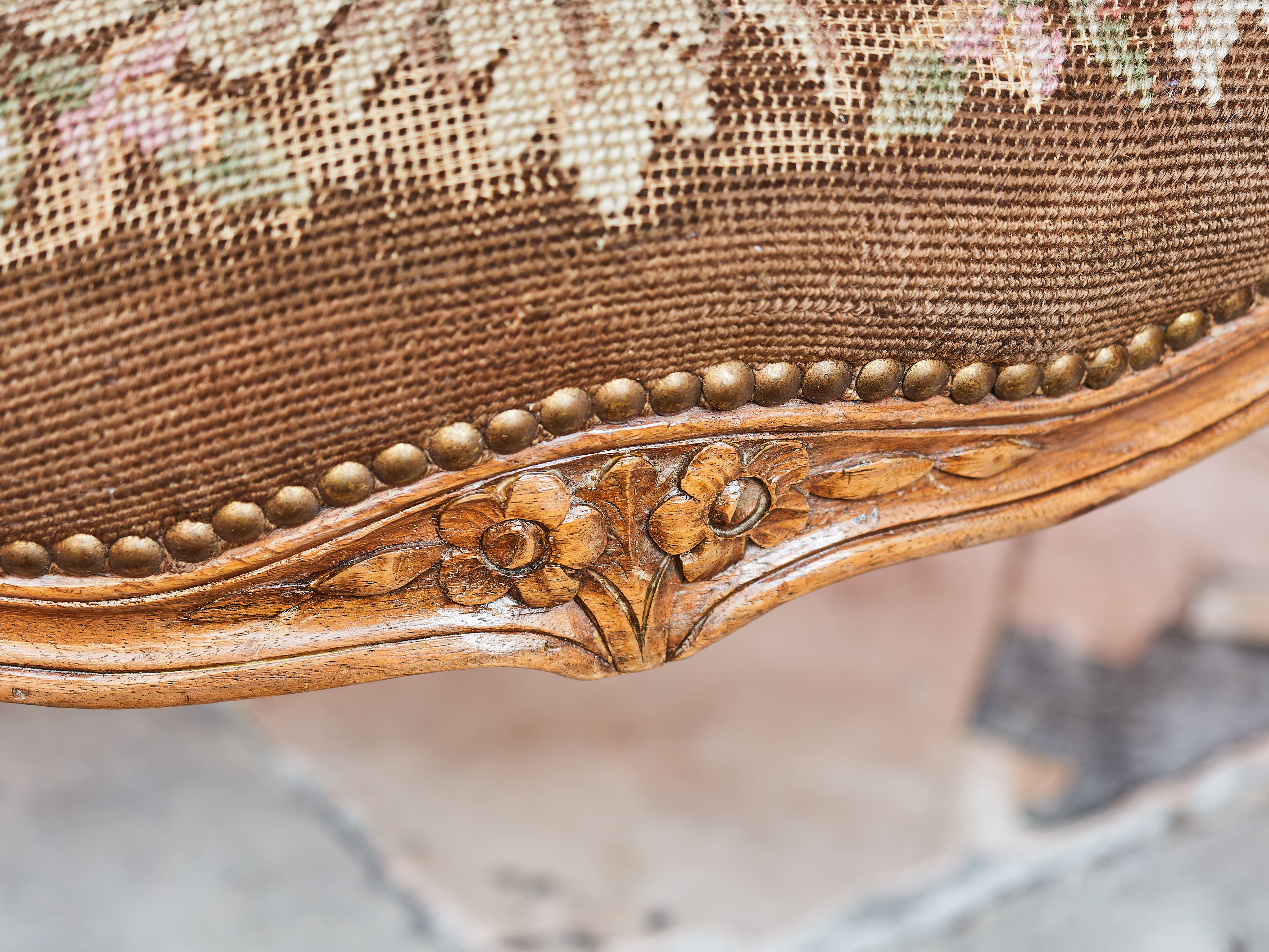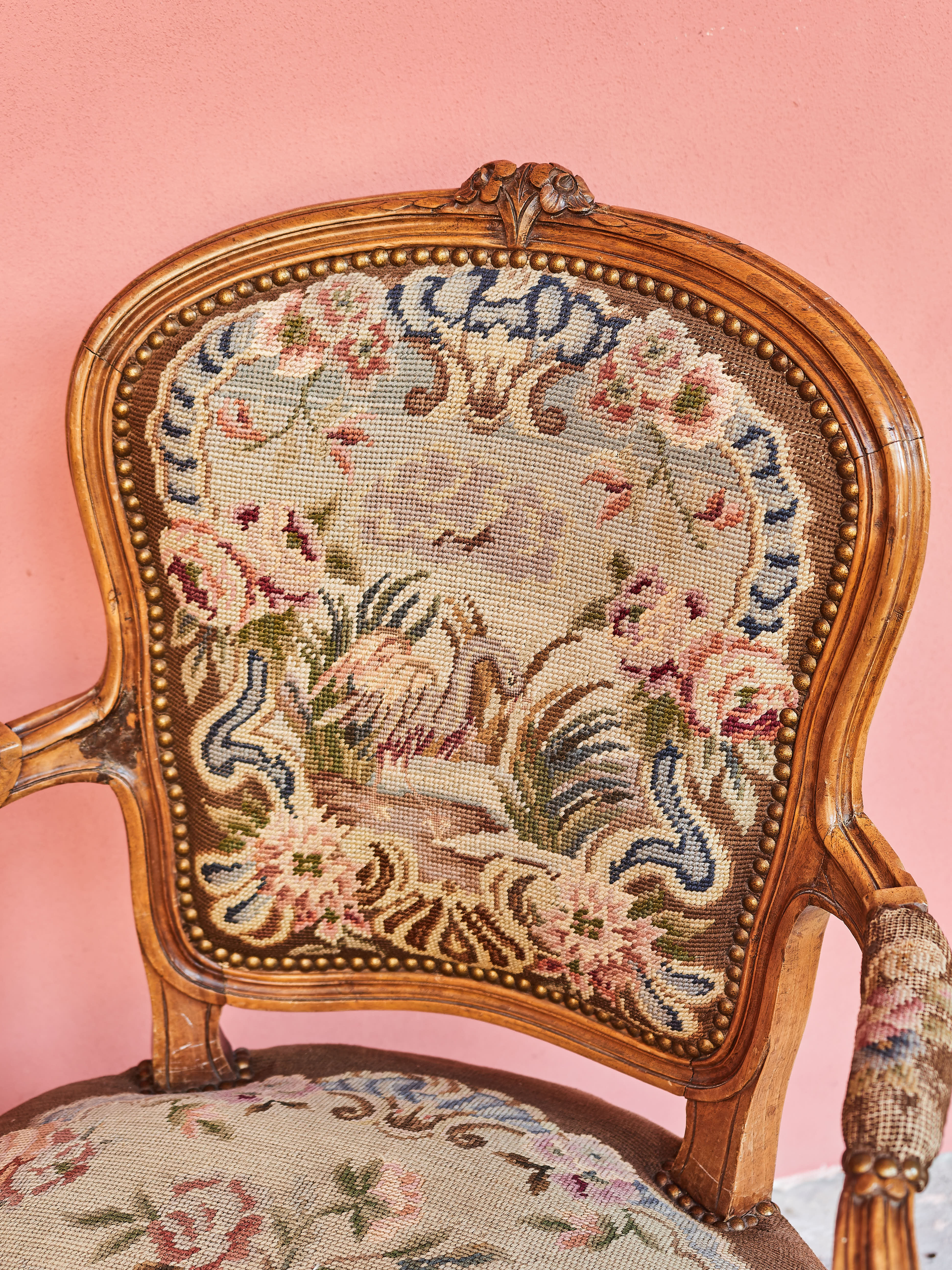 Elegantní párová křesílka v rokokovém stylu s ručně tkaným gobelínovým čalouněním s florálními motivy a výjevem s volavkami. Dřevěná konstrukce je zdobena jemnou řezbou s květinovými detaily a ladně prohnutými nohami, které podtrhují lehkost a dekorativnost rokokového designu. Křesílka nesou znaky patiny, která dokládá jejich stáří a původní charakter.