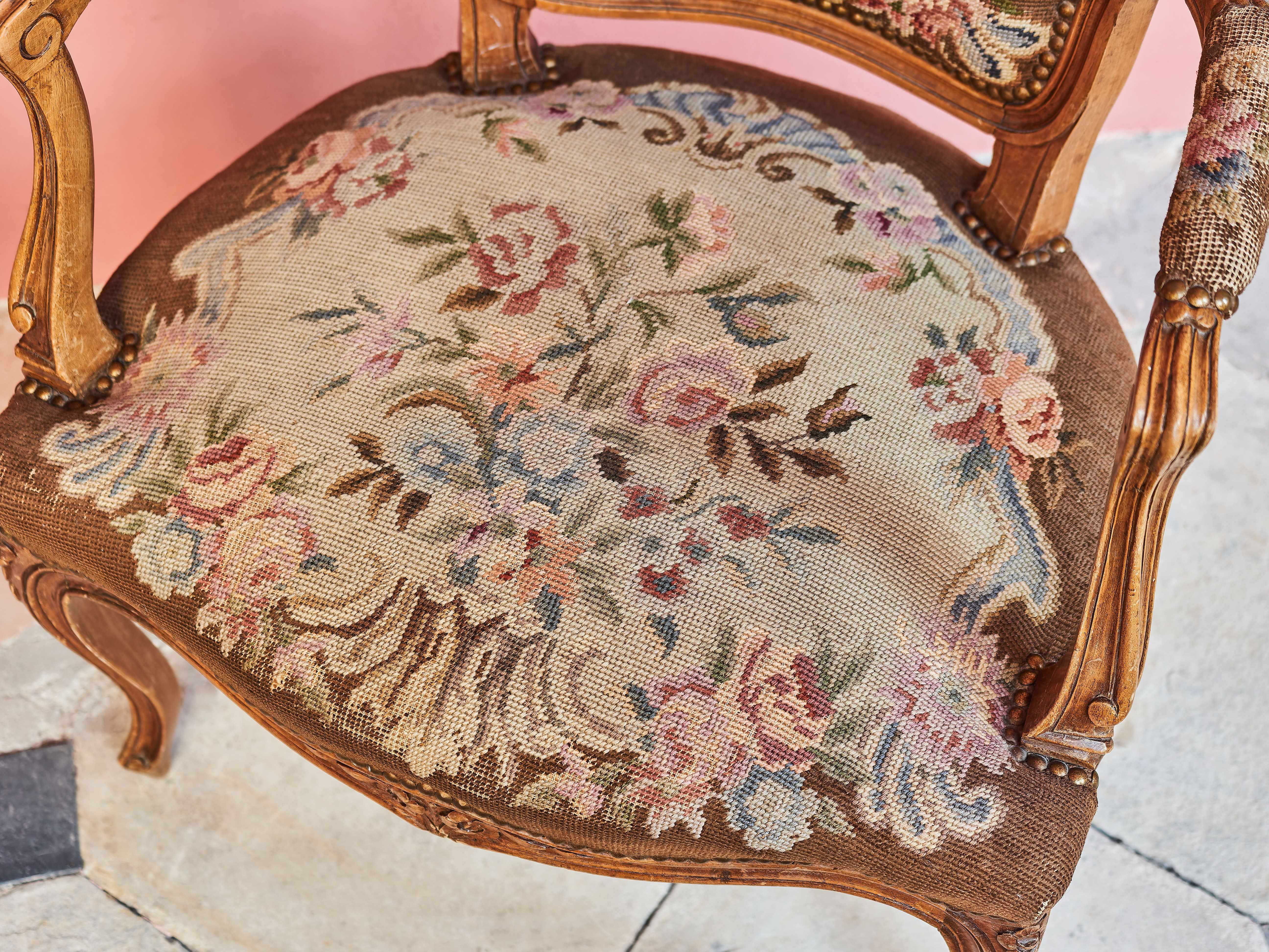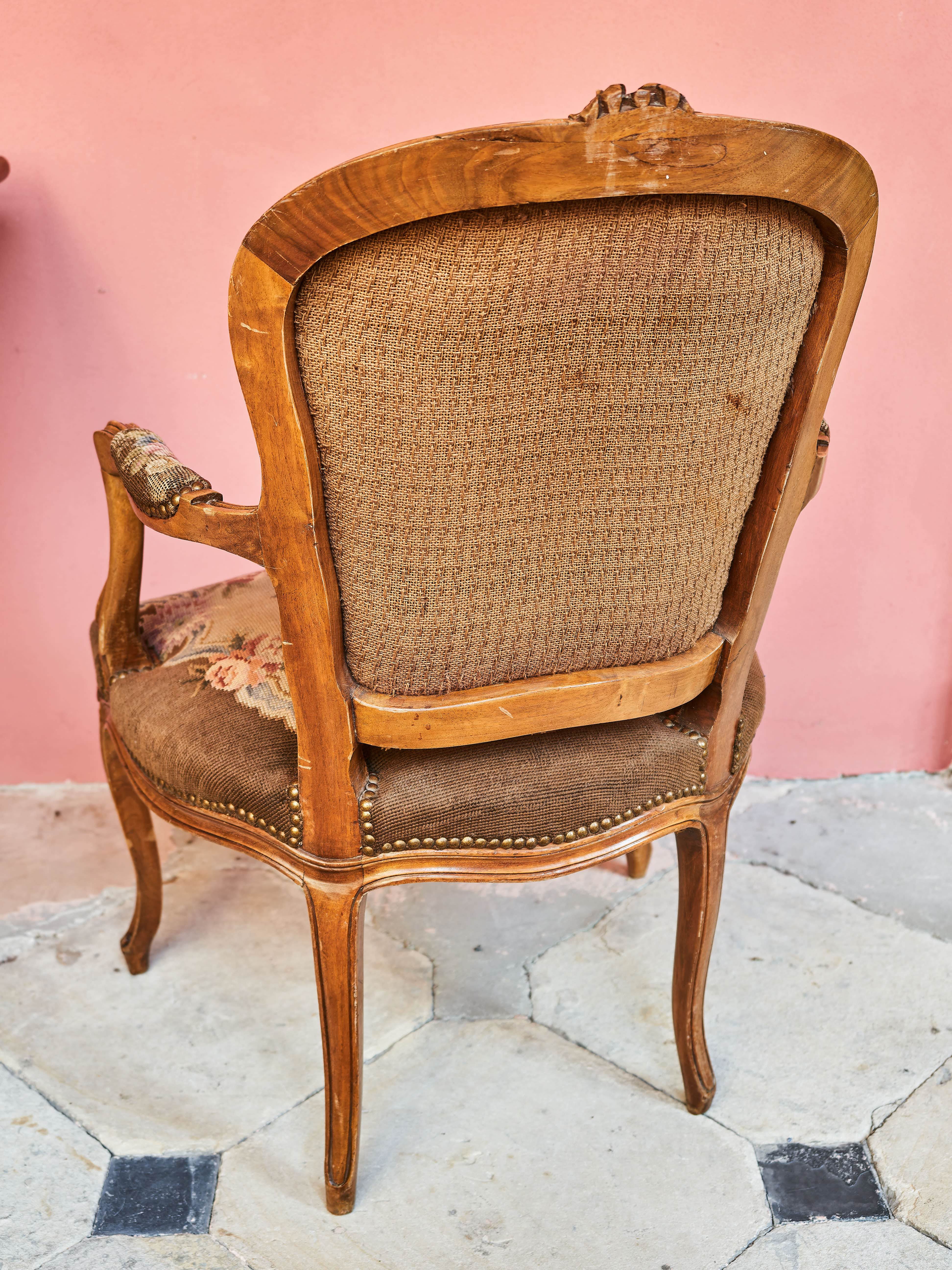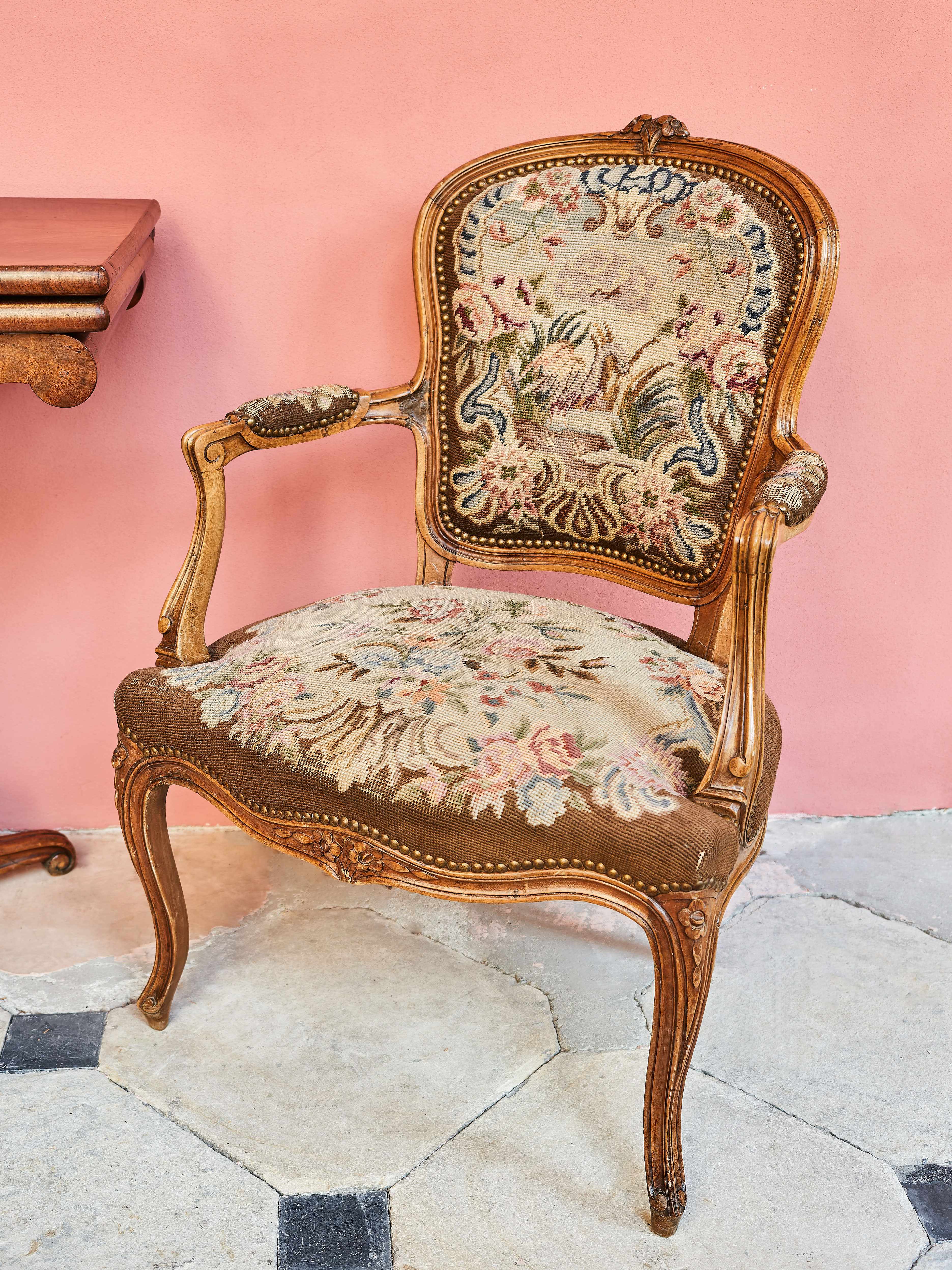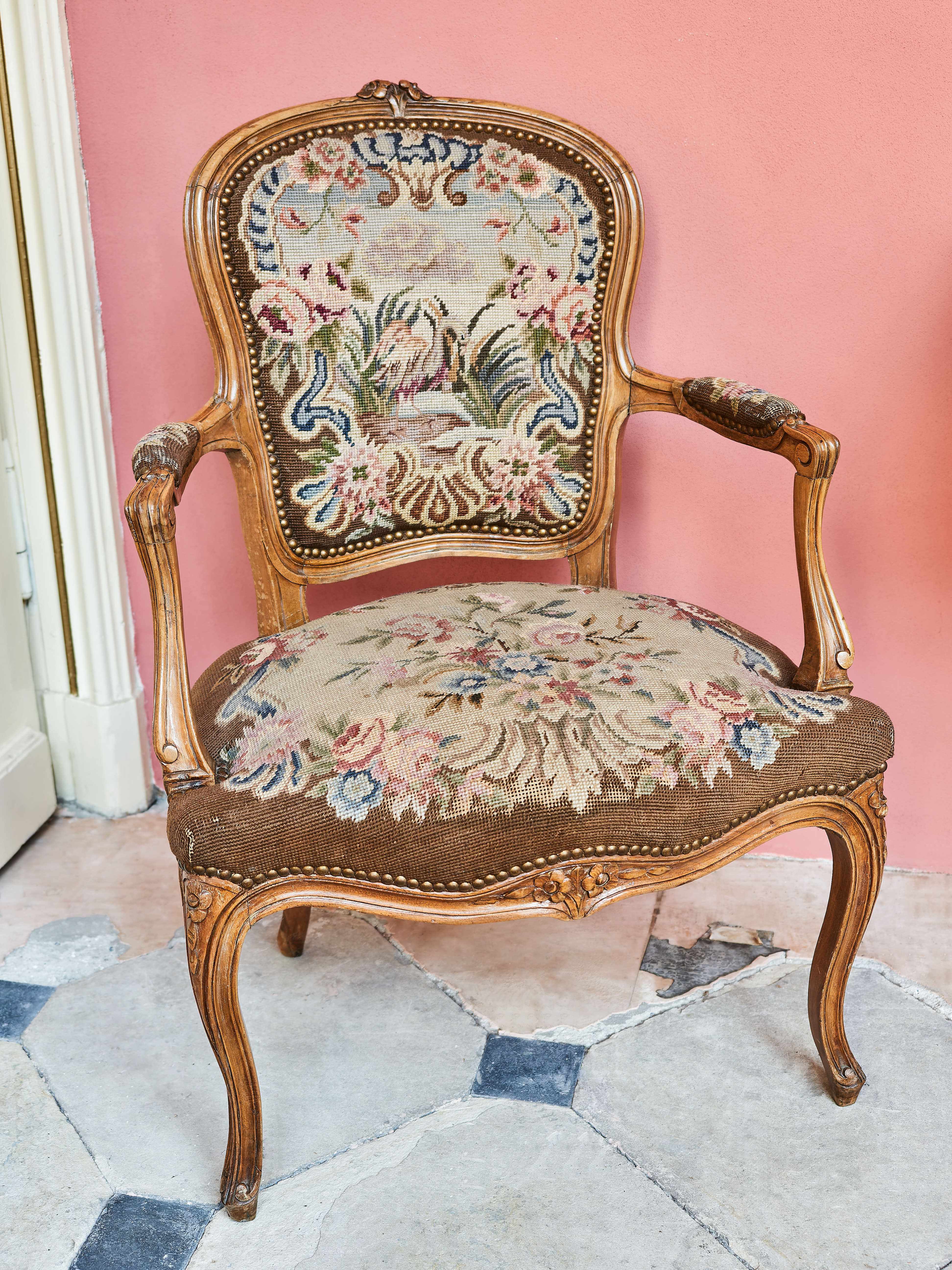 Elegantní párová křesílka v rokokovém stylu s ručně tkaným gobelínovým čalouněním s florálními motivy a výjevem s volavkami. Dřevěná konstrukce je zdobena jemnou řezbou s květinovými detaily a ladně prohnutými nohami, které podtrhují lehkost a dekorativnost rokokového designu. Křesílka nesou znaky patiny, která dokládá jejich stáří a původní charakter.