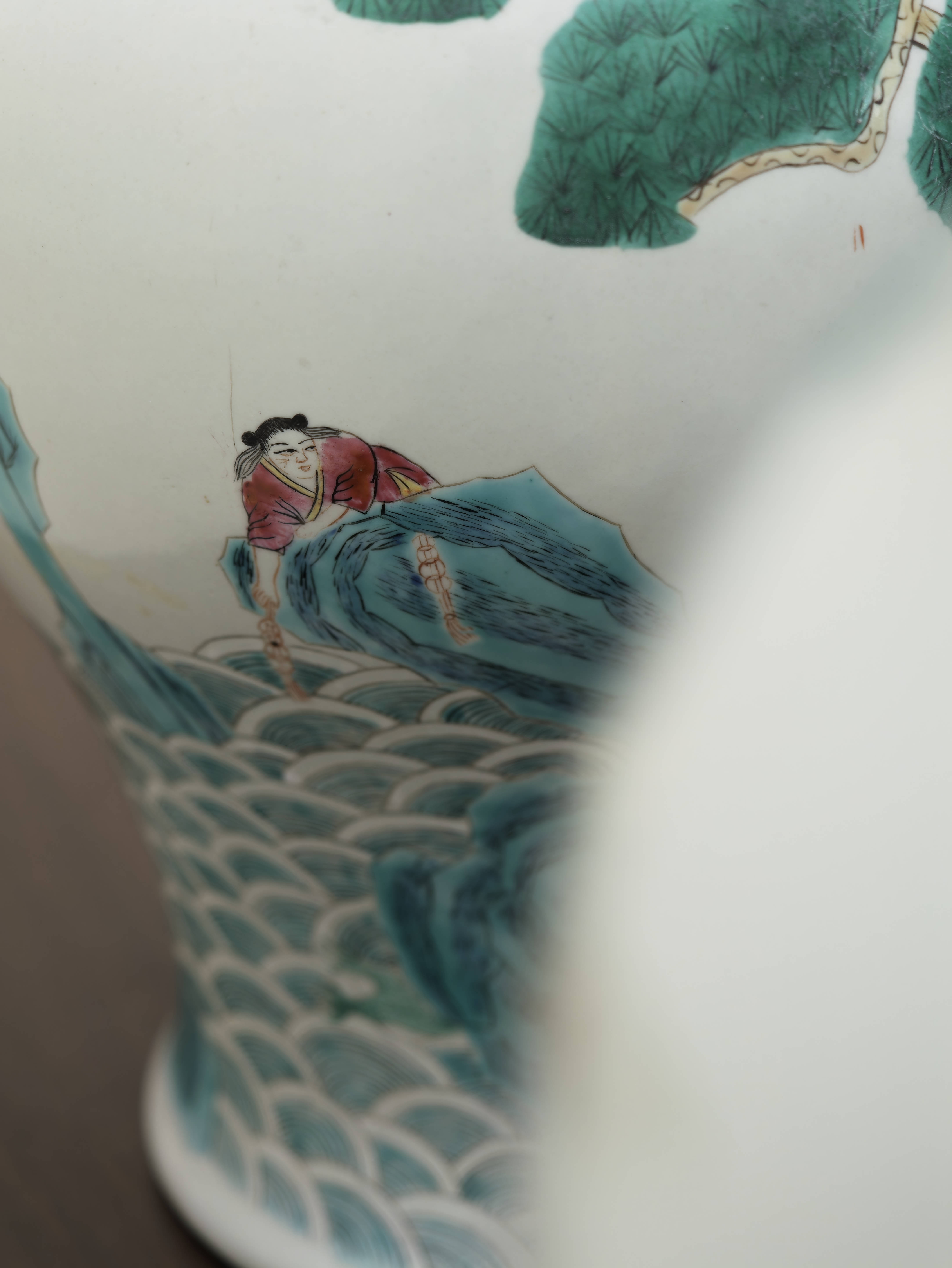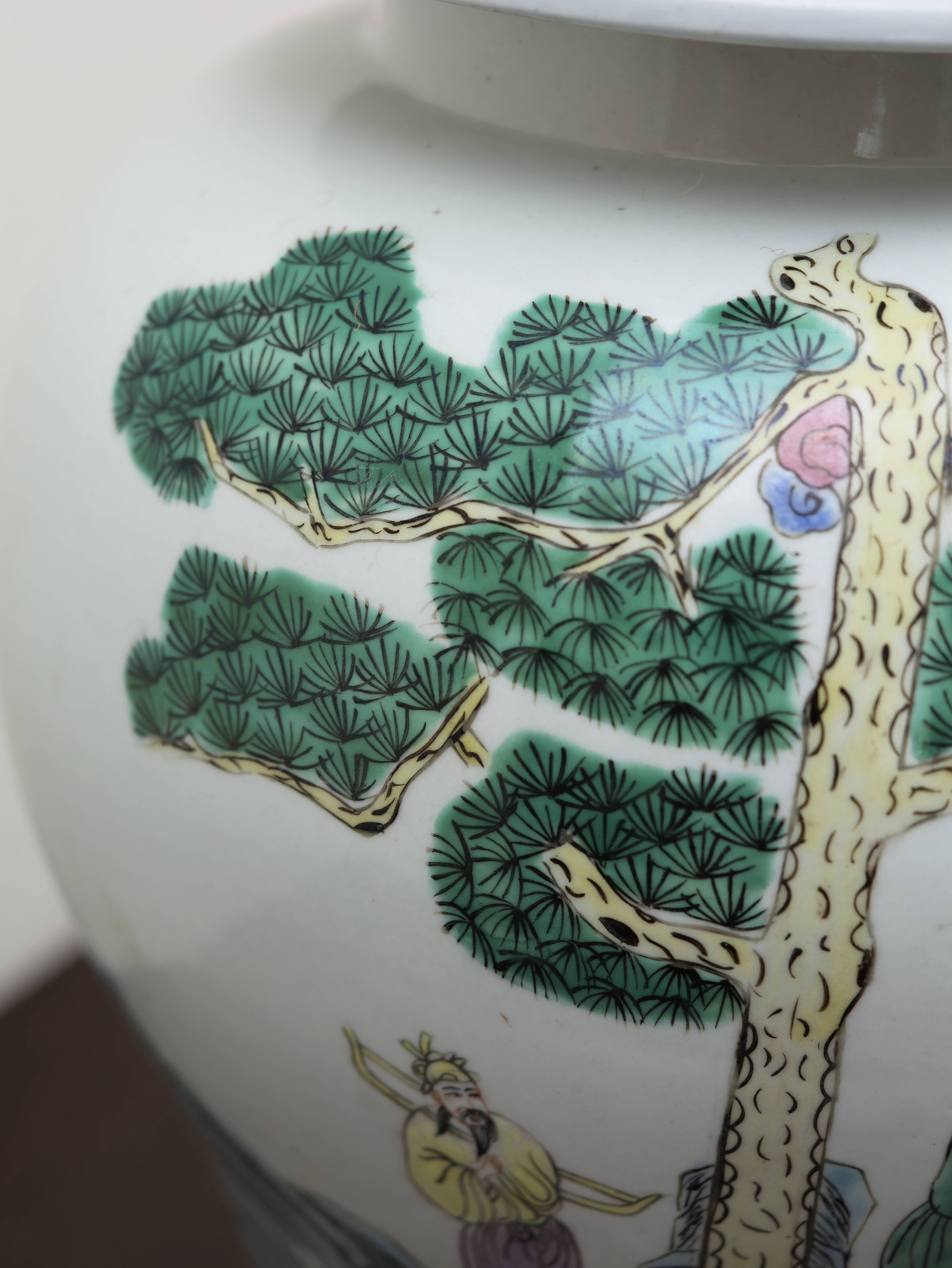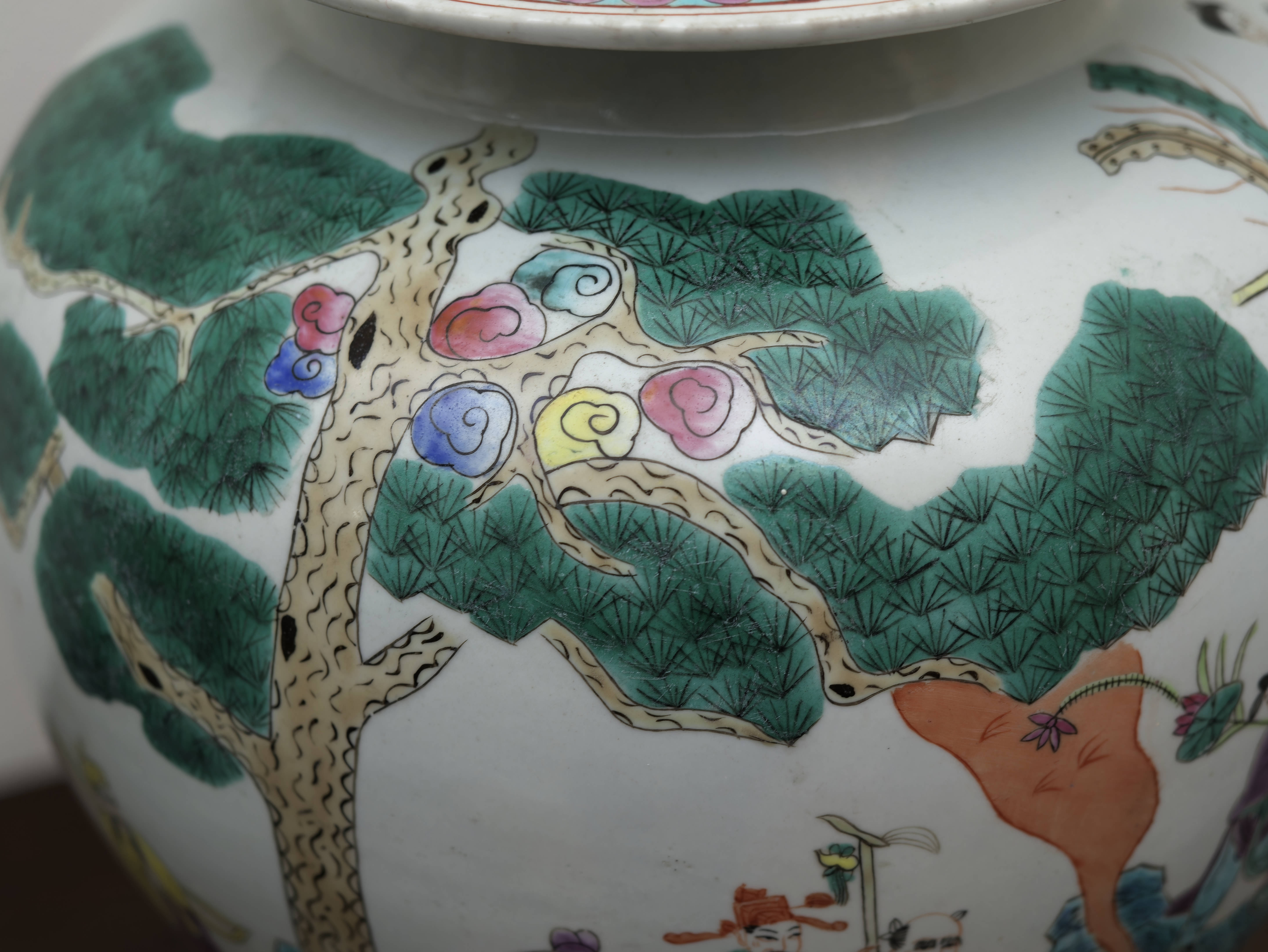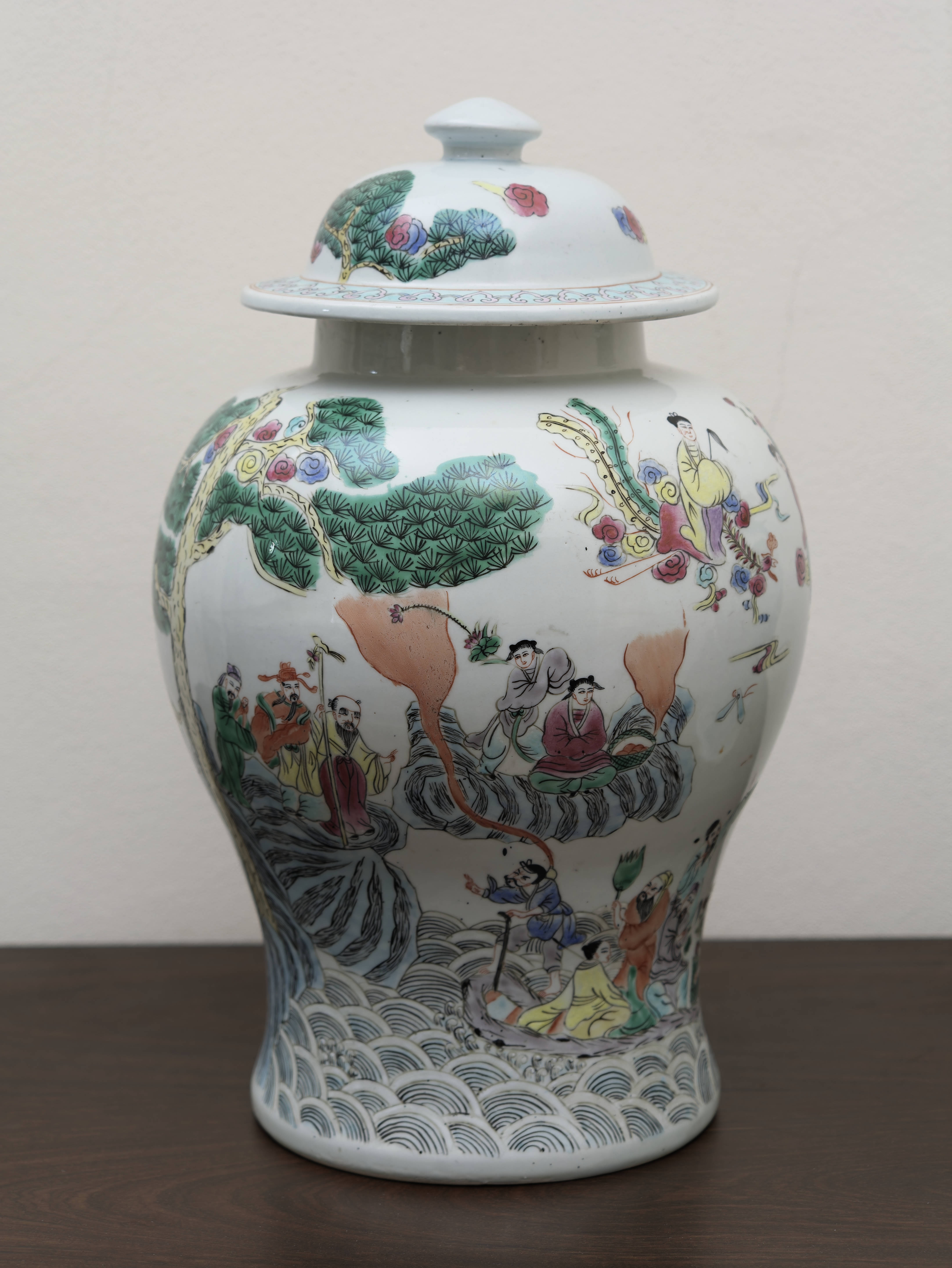 Působivý pár čínských porcelánových zásobnic s víky, ručně malovaných v dekoru famille rose jemnými polychromními emaily. Balustrovitý tvar s klenutými víky zdobí bohaté figurální výjevy zasazené do krajiny s borovicemi, skalami a stylizovanými vlnami, doplněné drobnými ornamentálními a florálními motivy. Celek zaujme jemností kresby, lehkostí barevnosti i dekorativním charakterem.