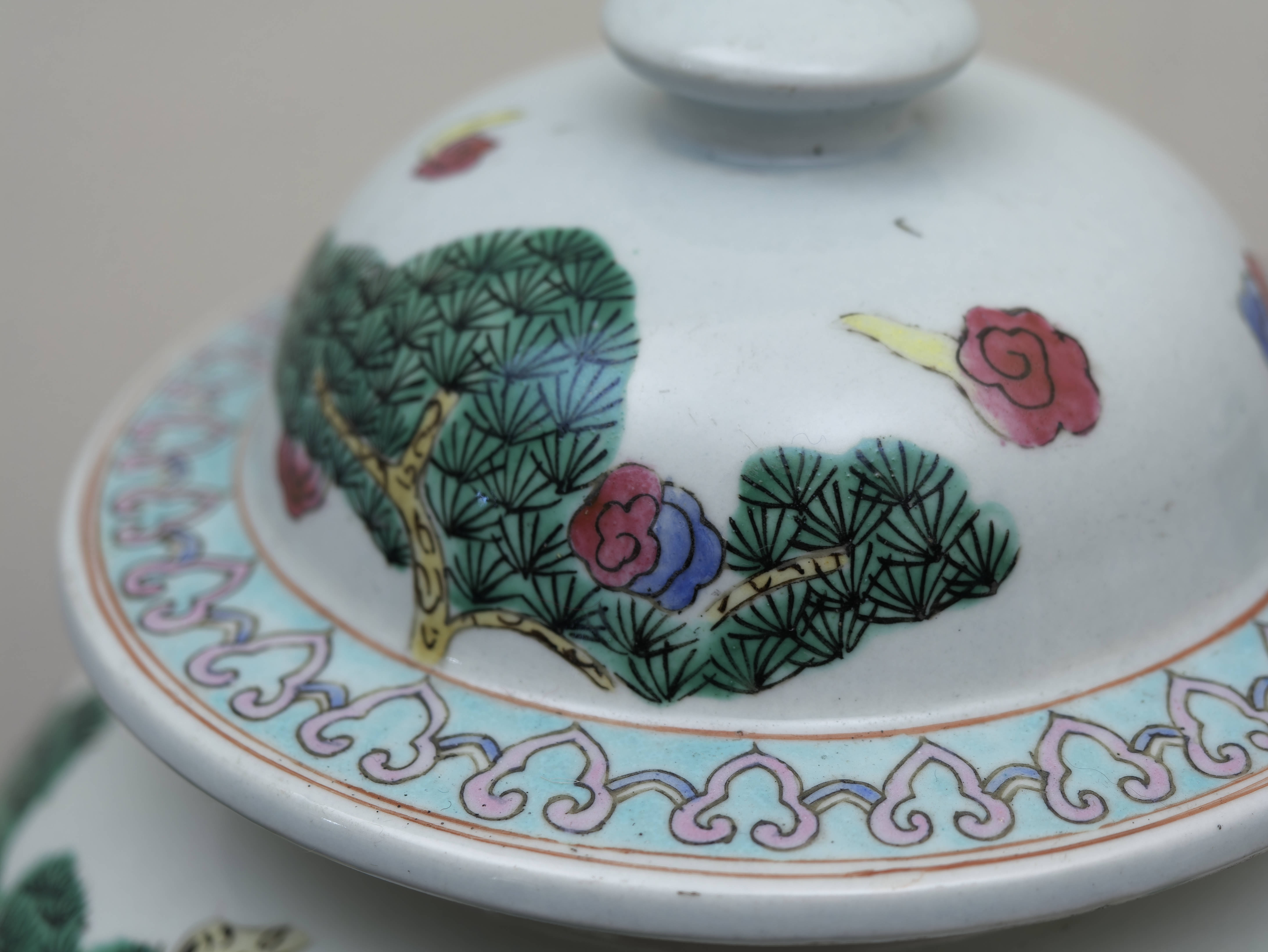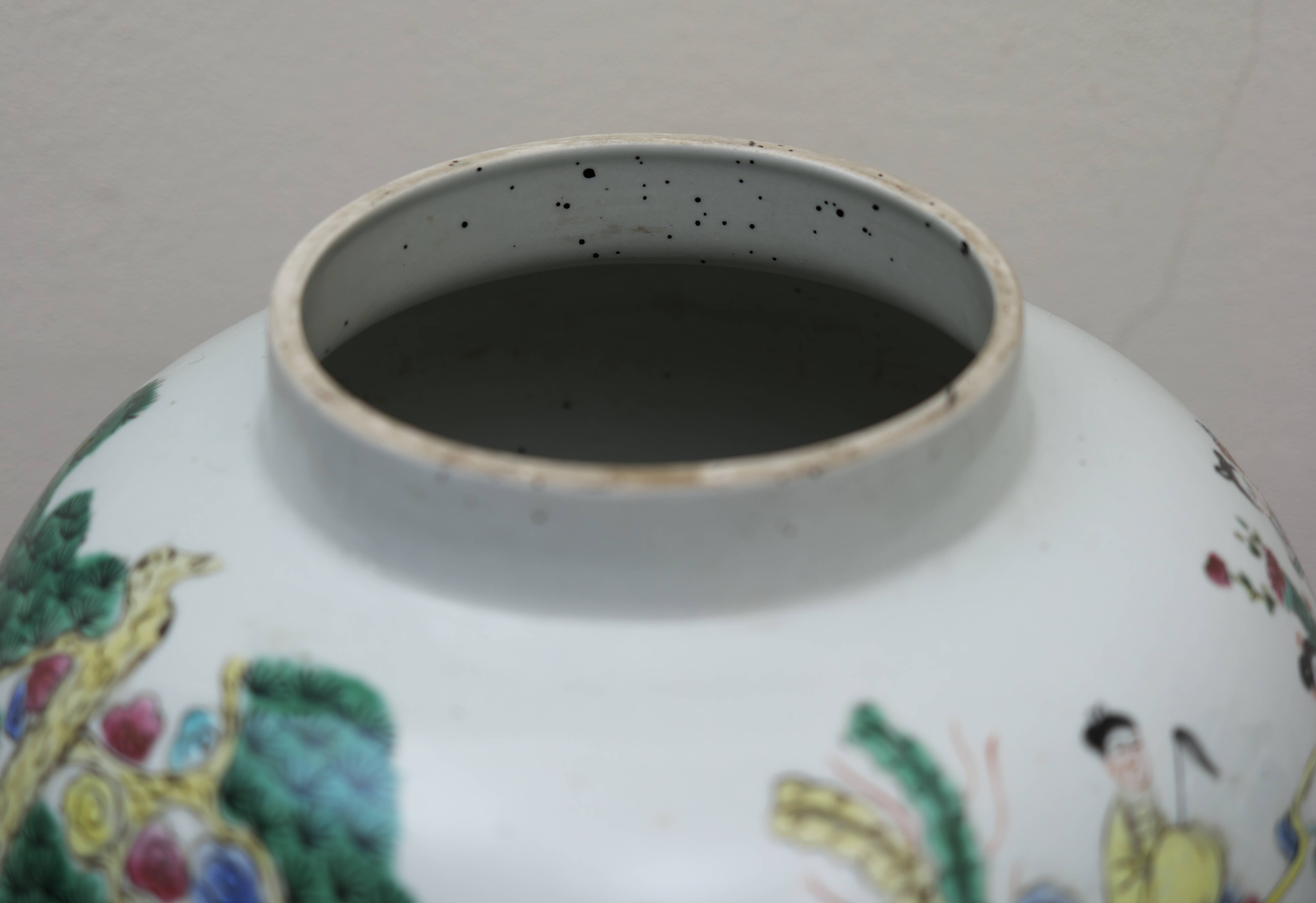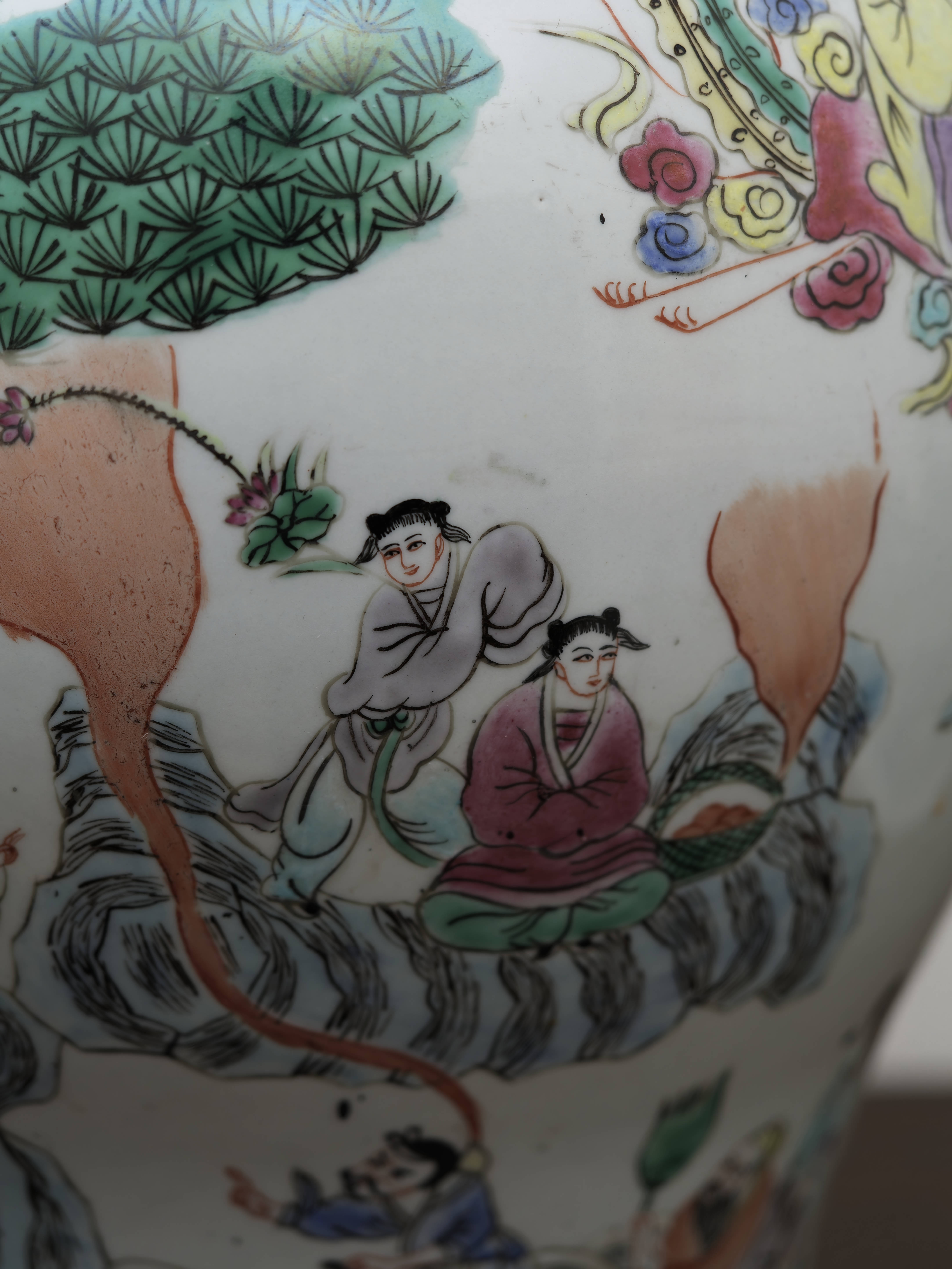 Působivý pár čínských porcelánových zásobnic s víky, ručně malovaných v dekoru famille rose jemnými polychromními emaily. Balustrovitý tvar s klenutými víky zdobí bohaté figurální výjevy zasazené do krajiny s borovicemi, skalami a stylizovanými vlnami, doplněné drobnými ornamentálními a florálními motivy. Celek zaujme jemností kresby, lehkostí barevnosti i dekorativním charakterem.