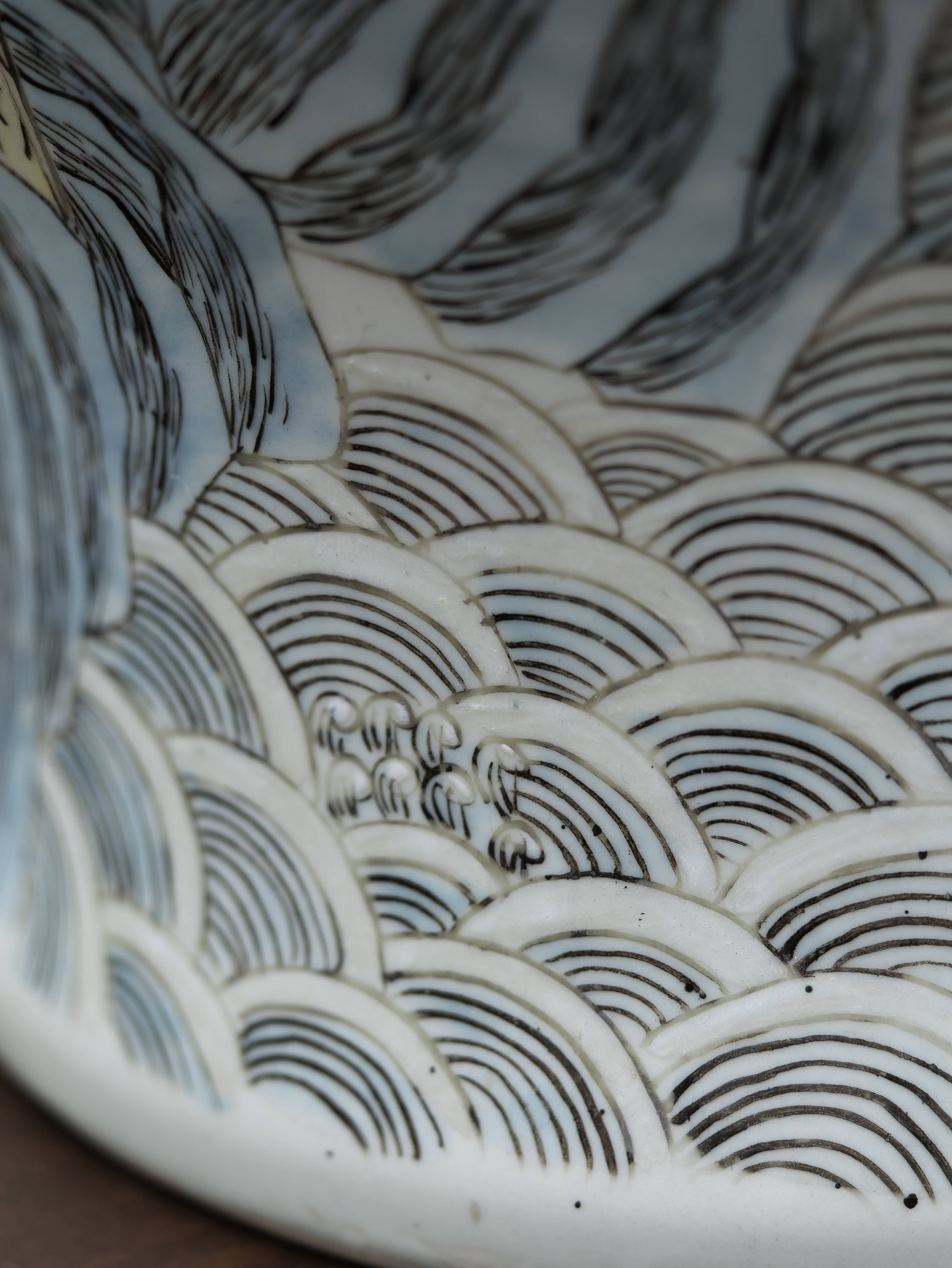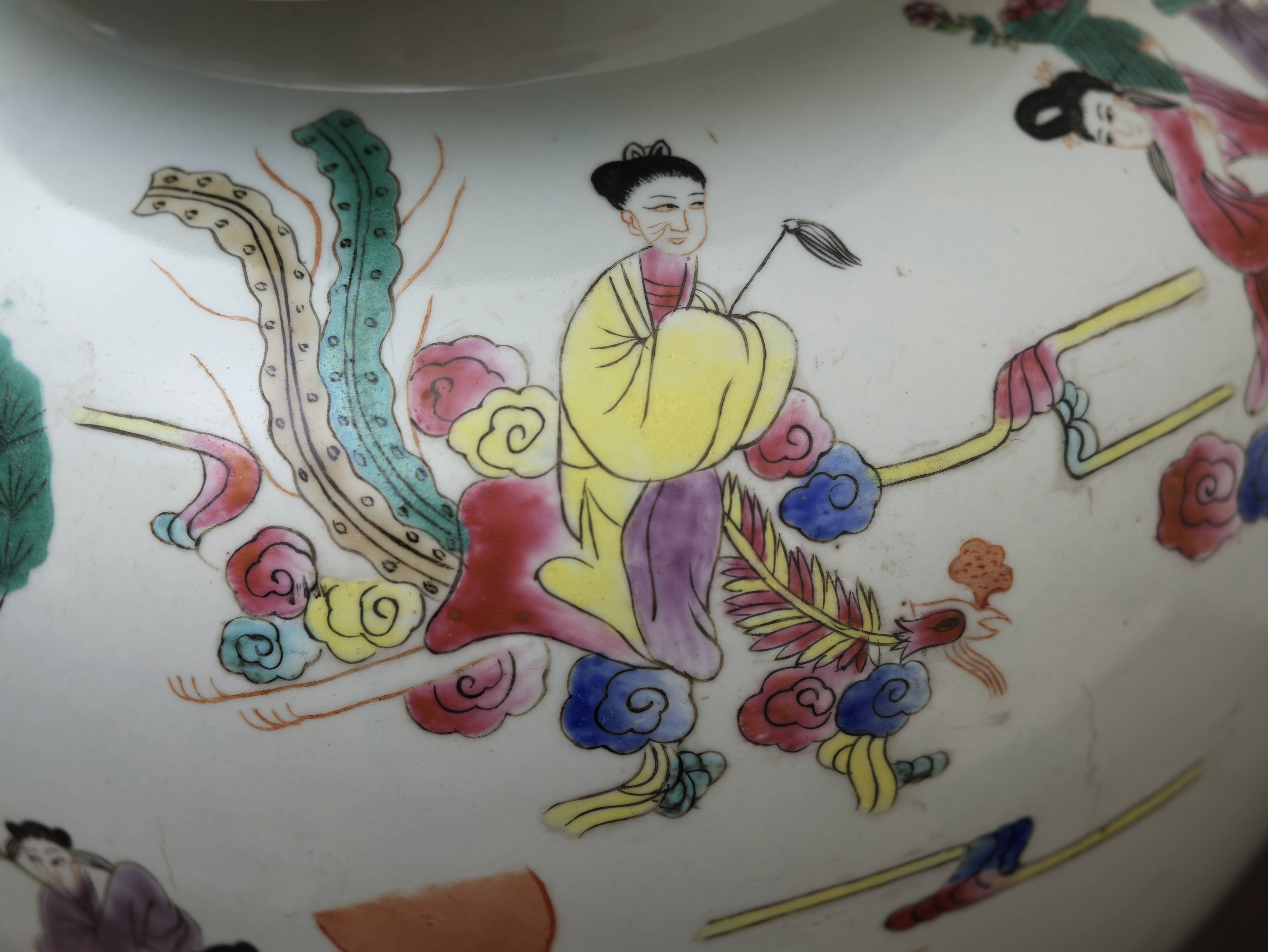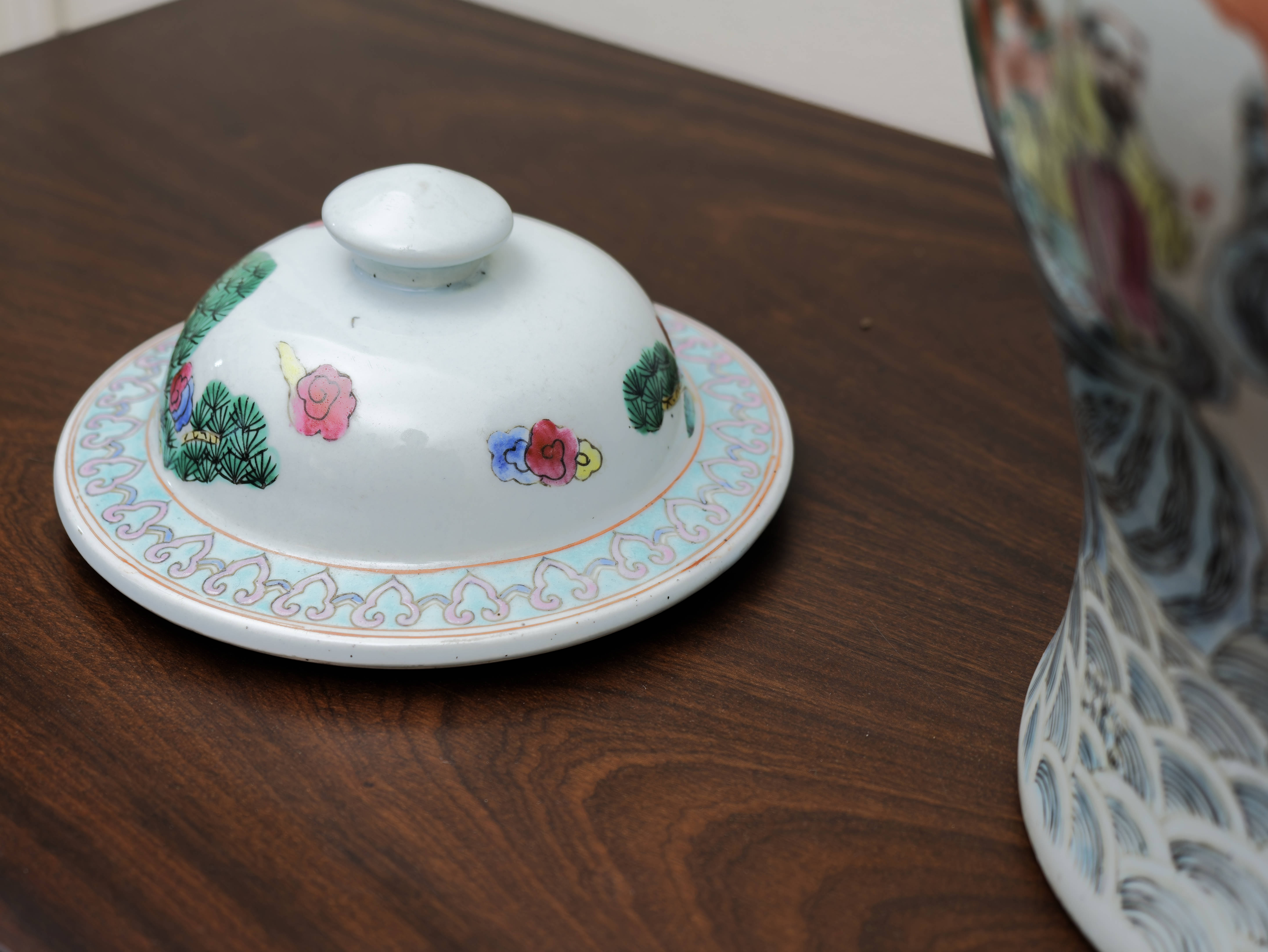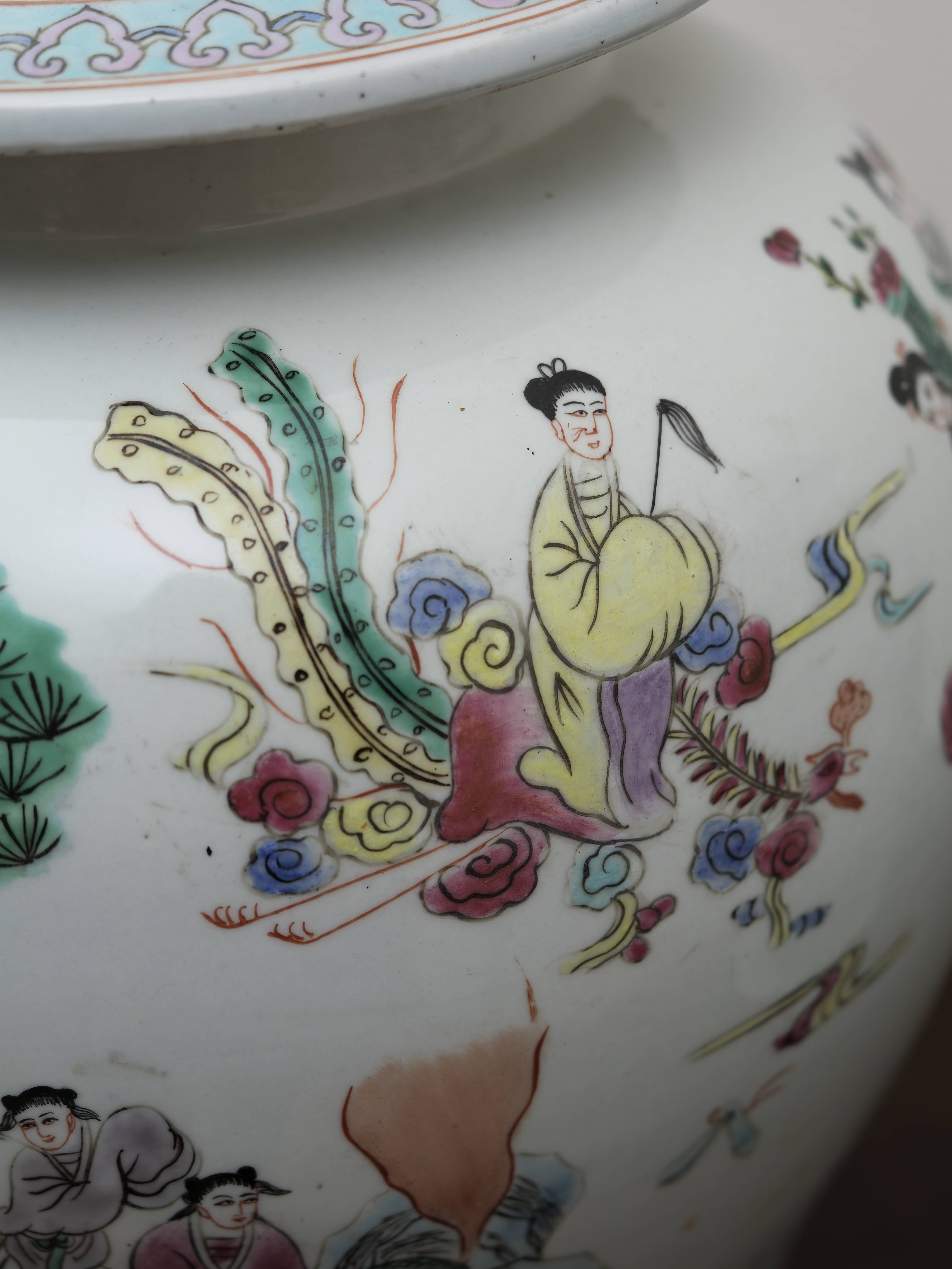 Působivý pár čínských porcelánových zásobnic s víky, ručně malovaných v dekoru famille rose jemnými polychromními emaily. Balustrovitý tvar s klenutými víky zdobí bohaté figurální výjevy zasazené do krajiny s borovicemi, skalami a stylizovanými vlnami, doplněné drobnými ornamentálními a florálními motivy. Celek zaujme jemností kresby, lehkostí barevnosti i dekorativním charakterem.