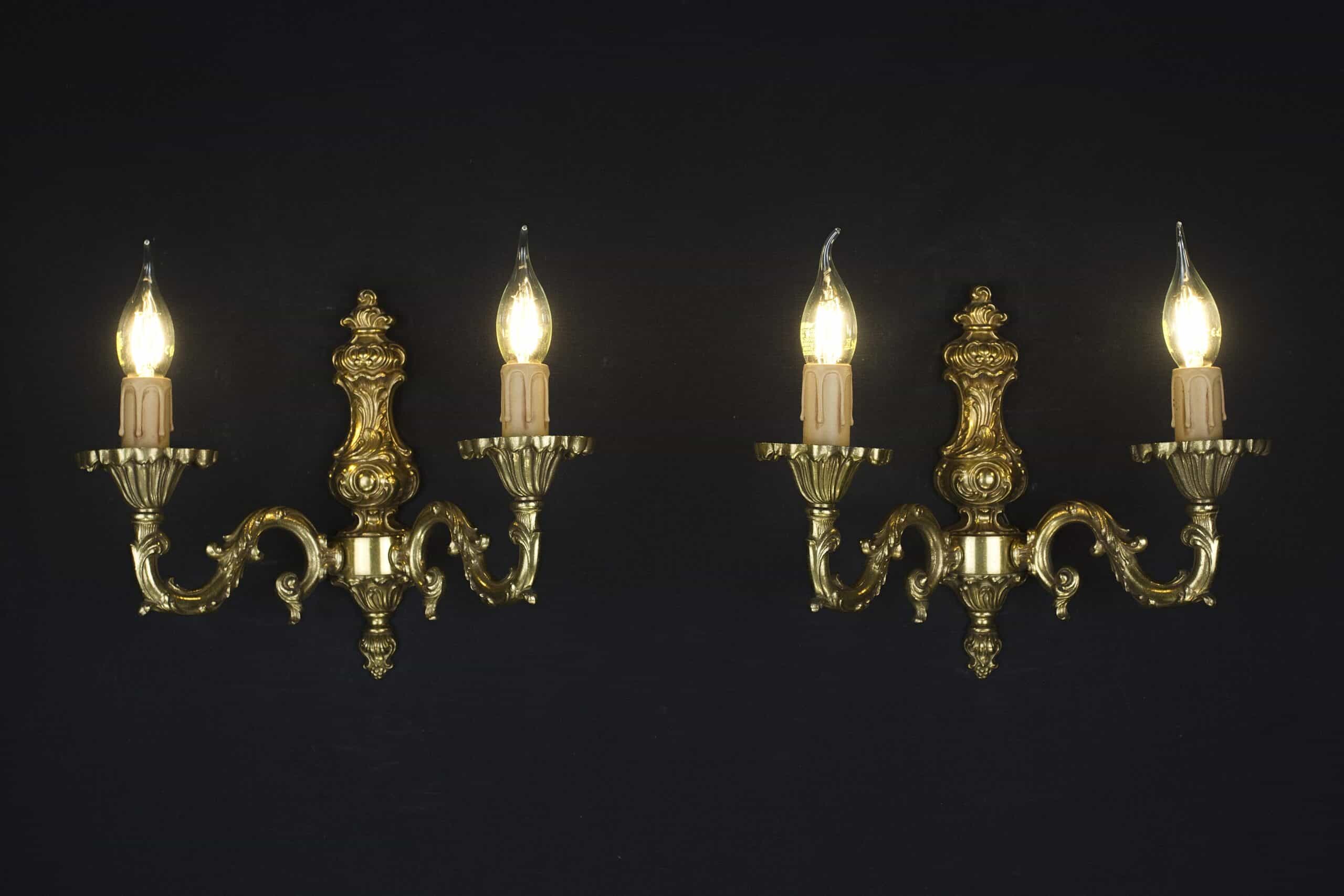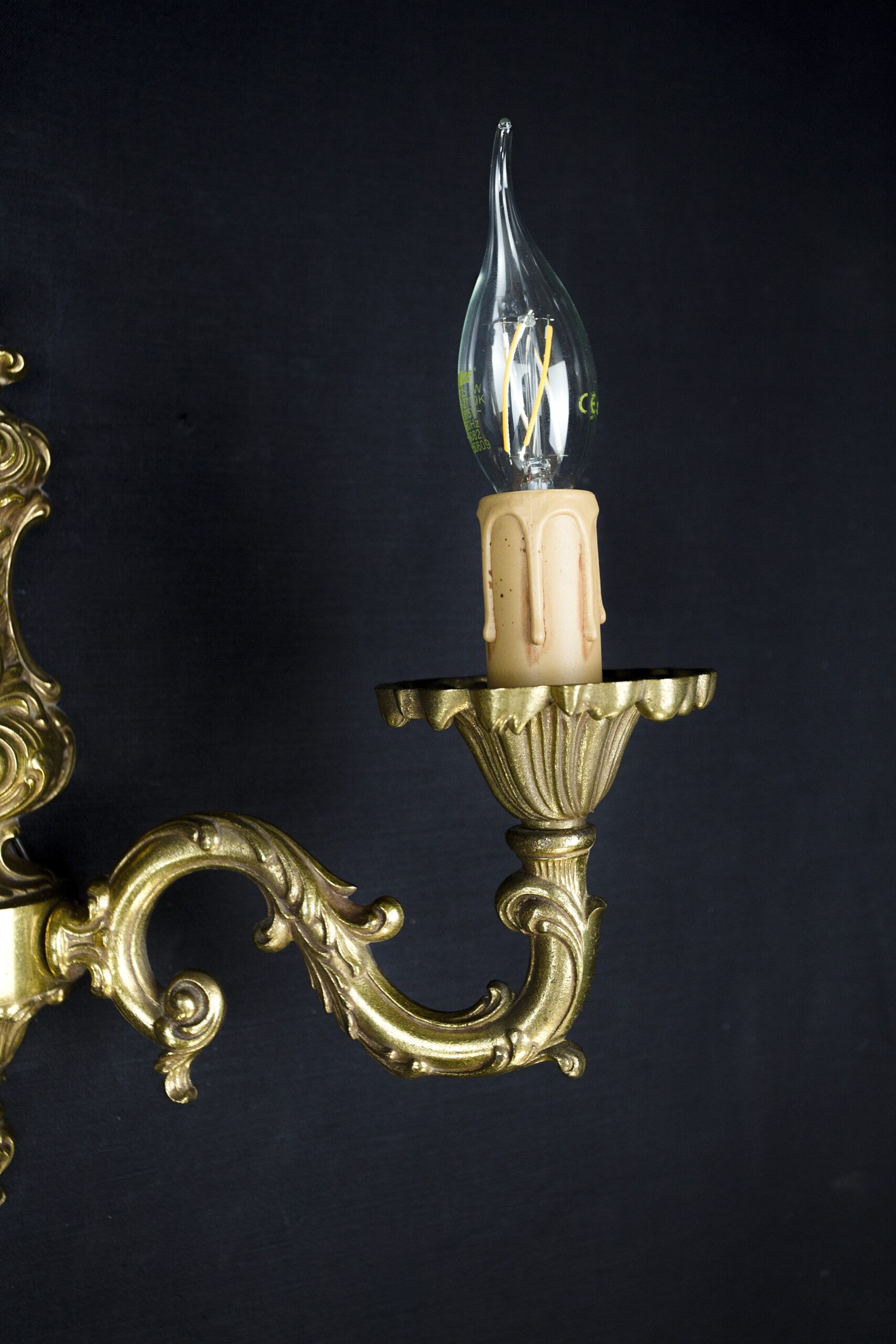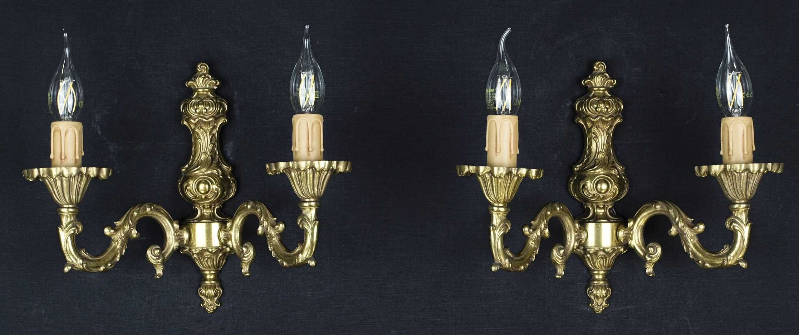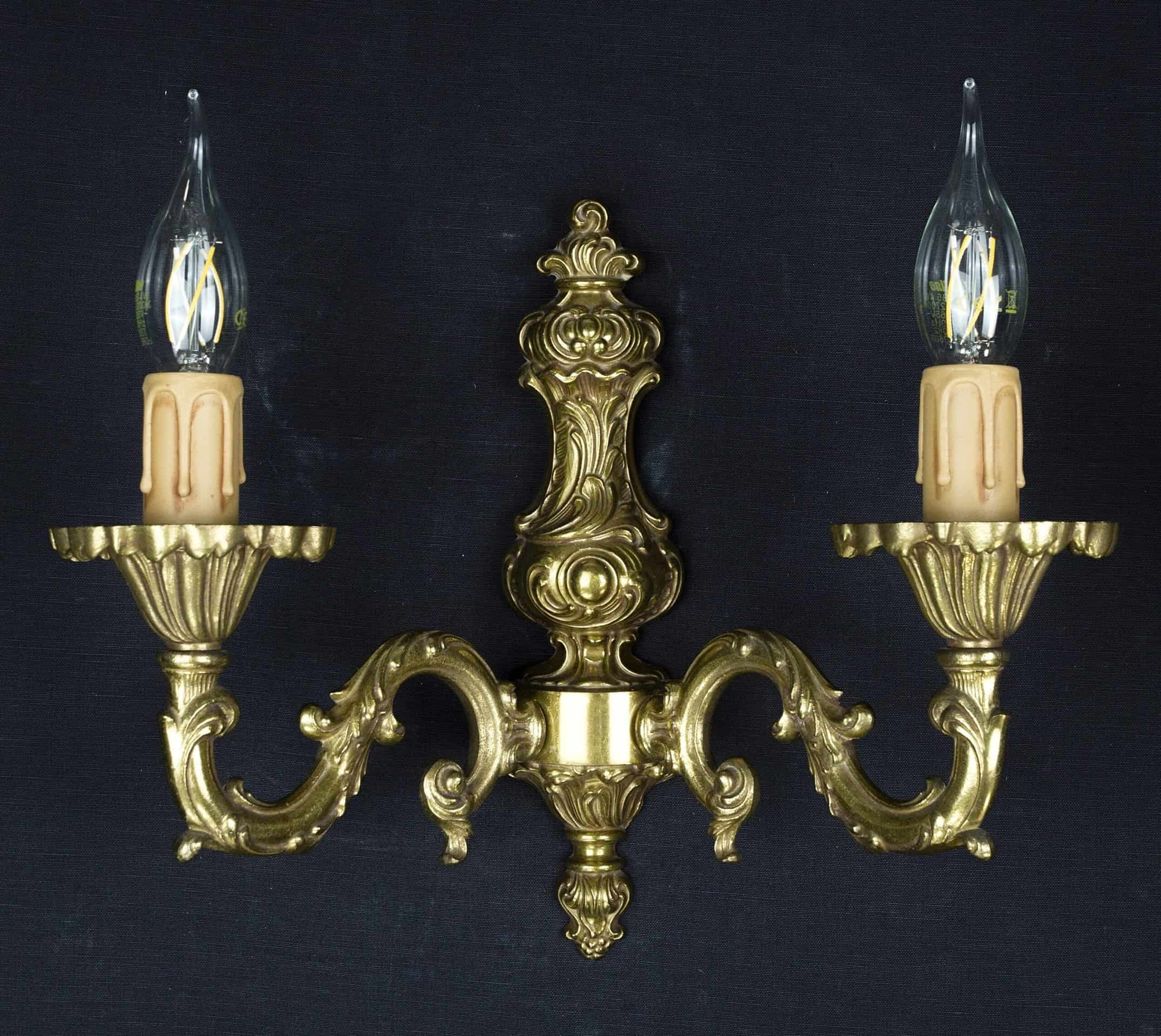 Kvalitní nástěnné lampy z leštěné mosazi – těžké. Elektroinstalace v mědi + nové vnitřní části a nové šešule (krytky pod žárovkou). Lampy jsou plně funkční – ihned k užívání. Každá lampa je na dvě žárovky s klasickým svíčkovým závitem E14 do 60W – vhodné jsou normální i led žárovky. Stav: výborný. Provenience: Evropa. Datace: kolem roku 1960. Cena za oba kusy.