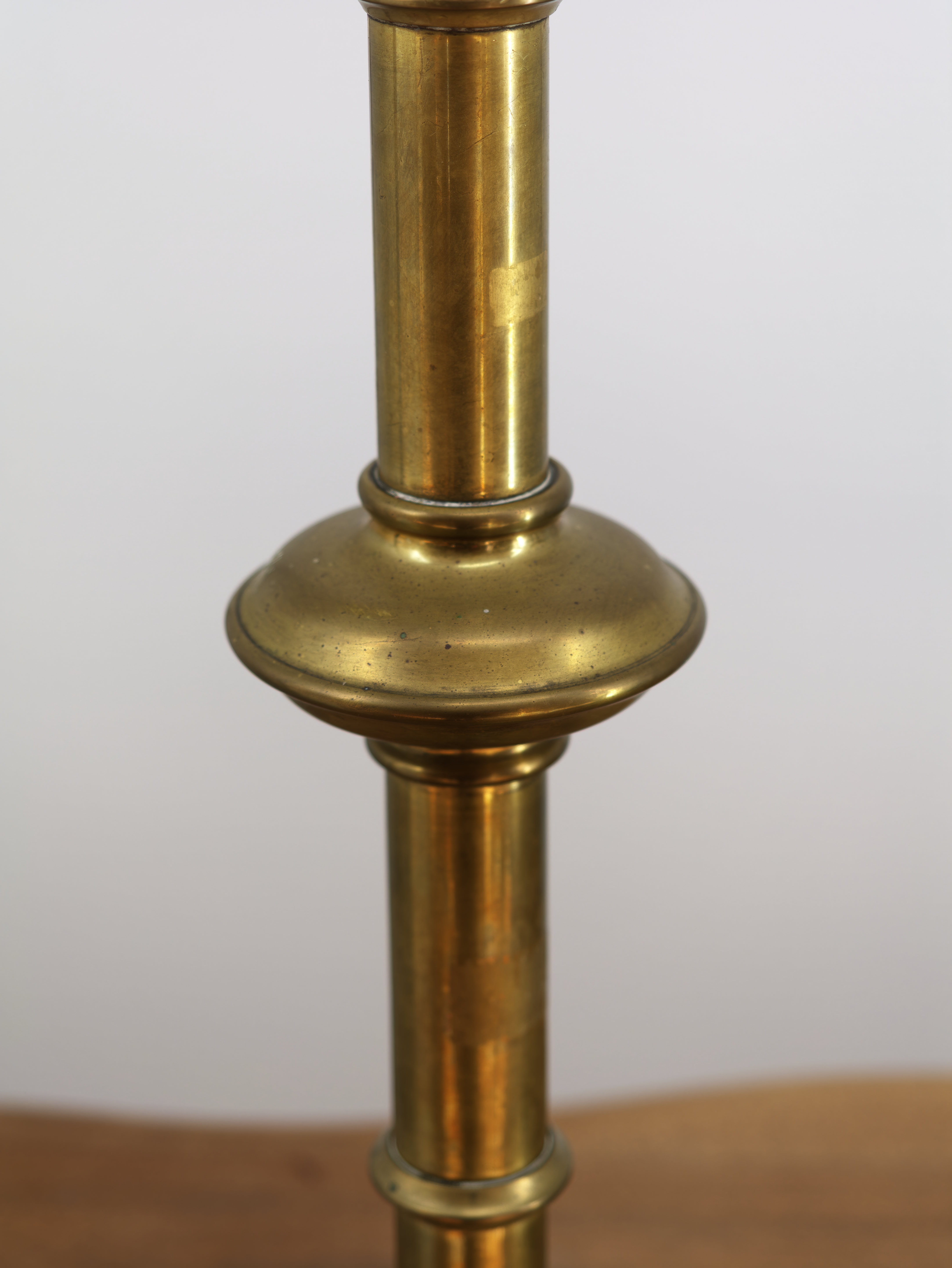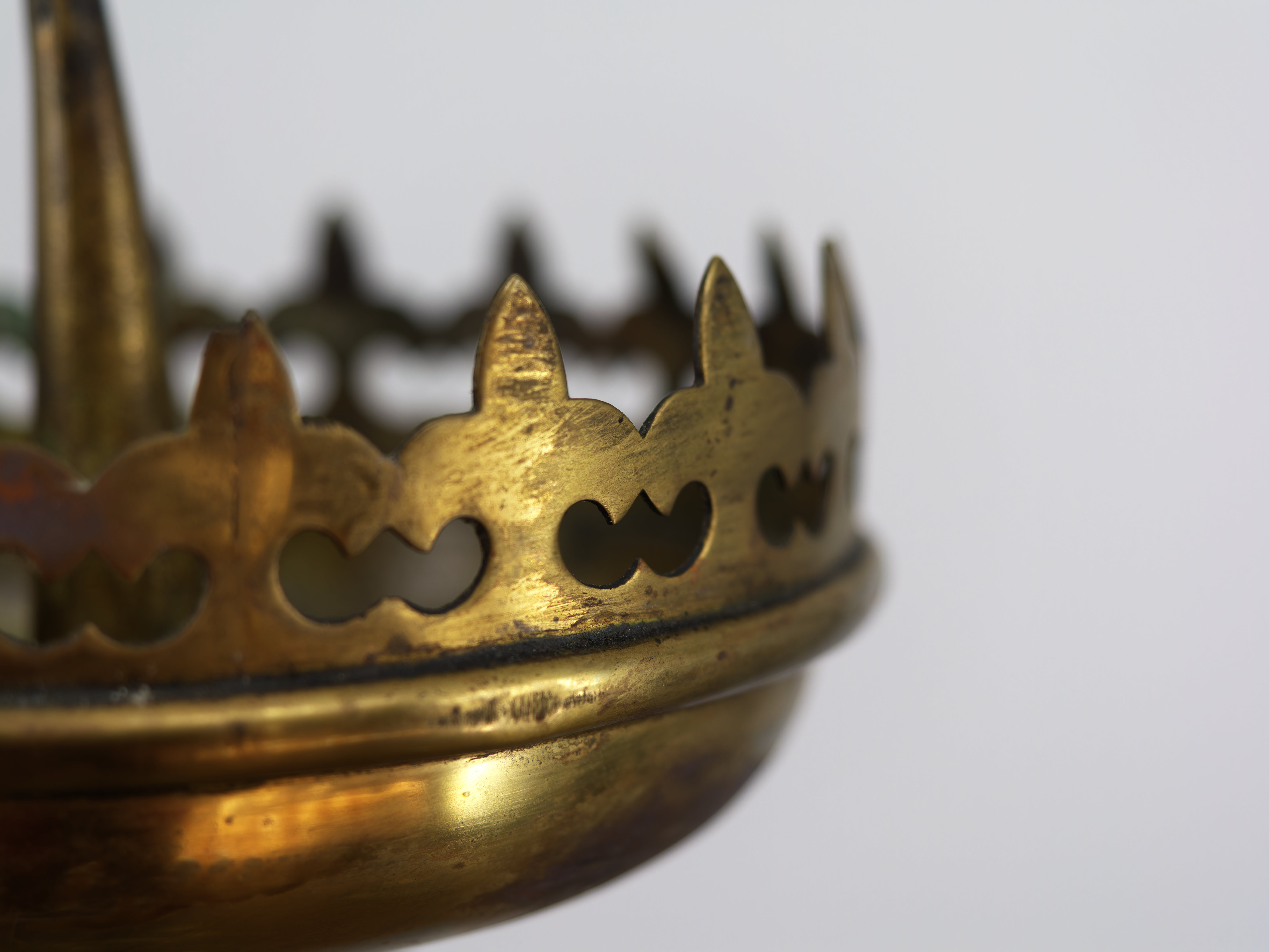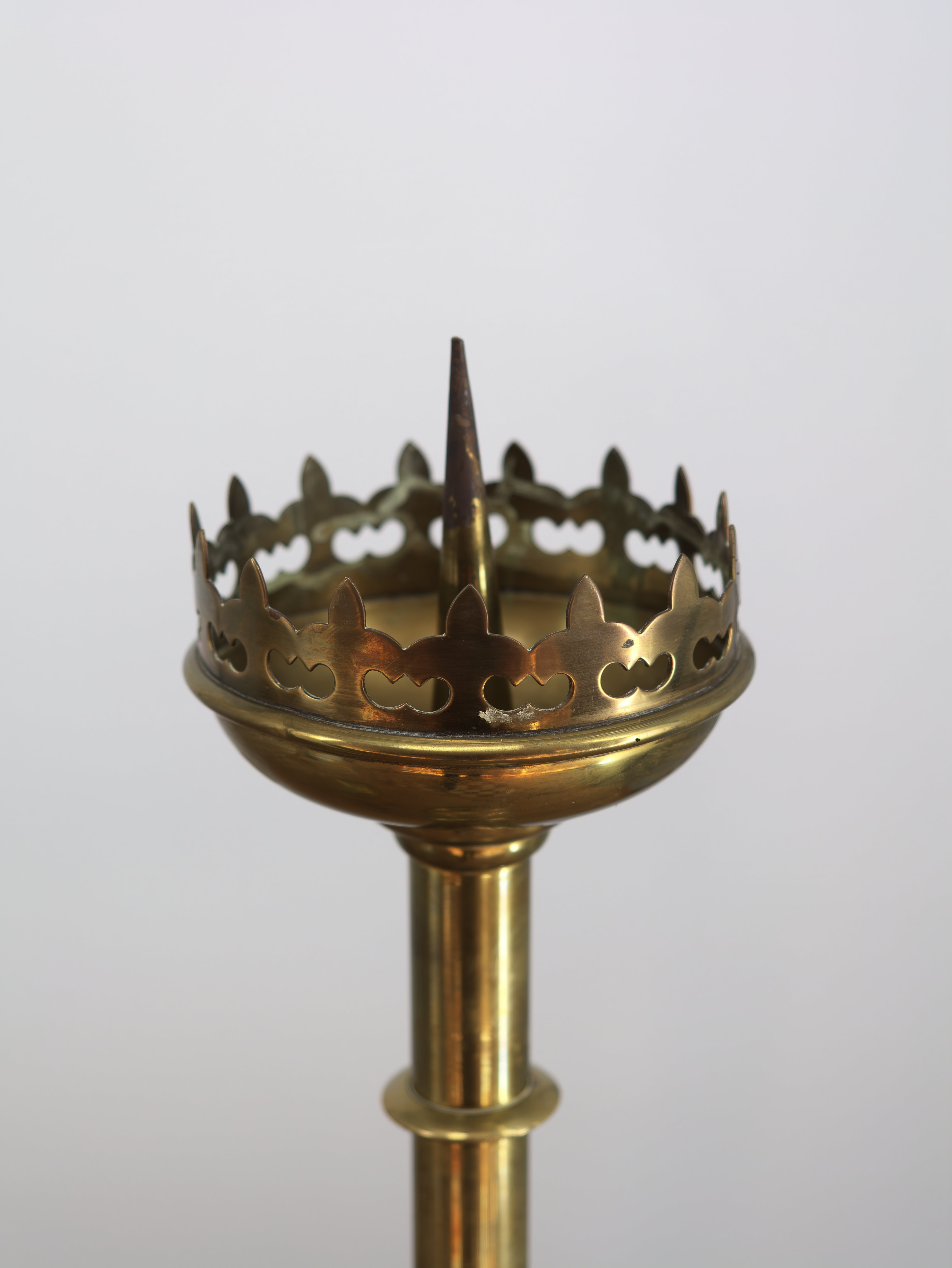 Párové mosazné svícny v gotickém stylu, pocházející z 19. století. Sloupkové svícny s odstupňovanou nohou a miskou zakončenou korunkovým lemem se stylizovanými výřezy. Typické gotizující proporce a dekorativní silueta odkazují na historizující vkus 19. století. Povrch s přirozenou patinou, bez pozdějších úprav. Svícny jsou ve velmi dobrém stavu a tvoří harmonický, reprezentativní pár vhodný do historického interiéru.