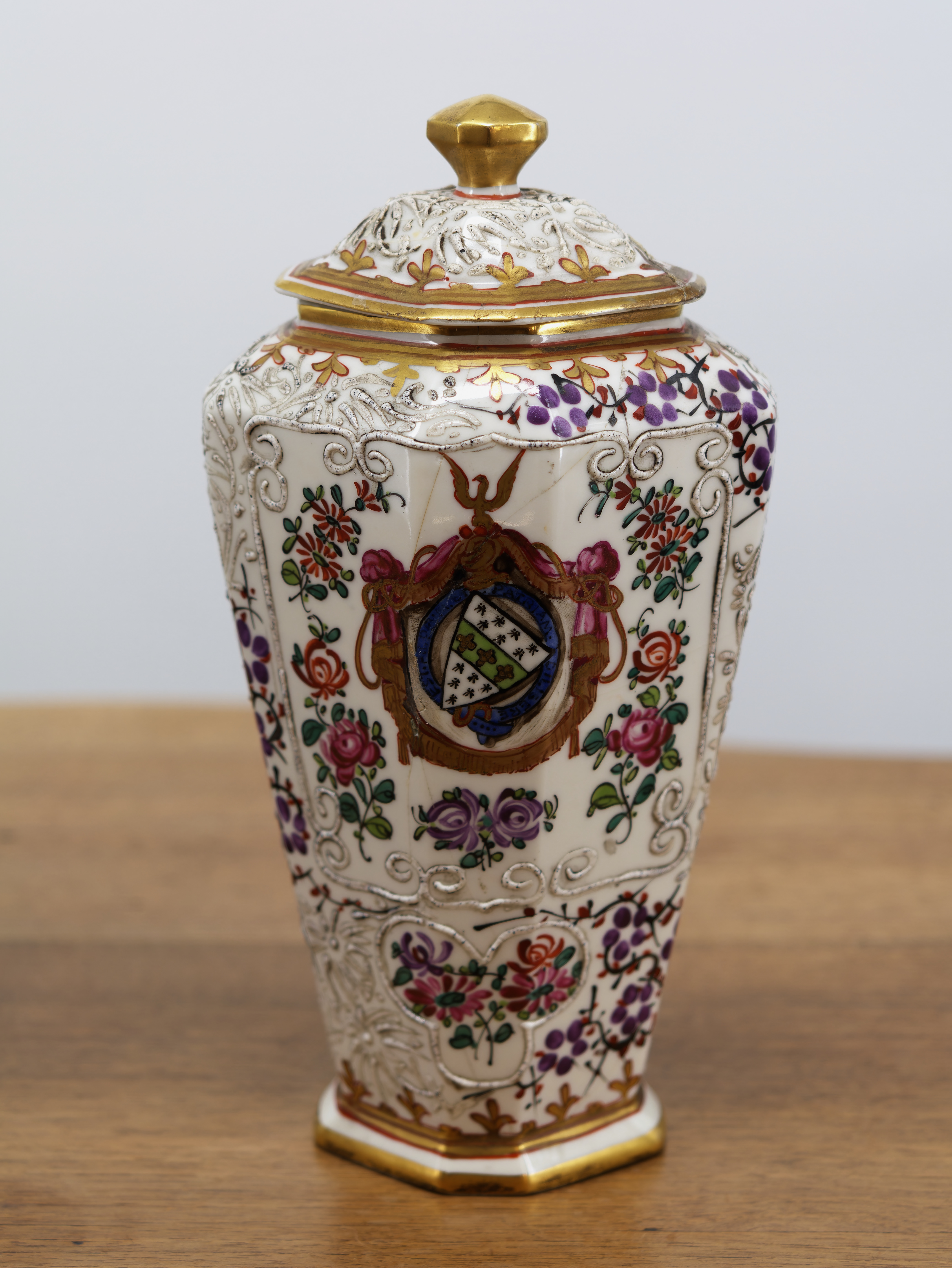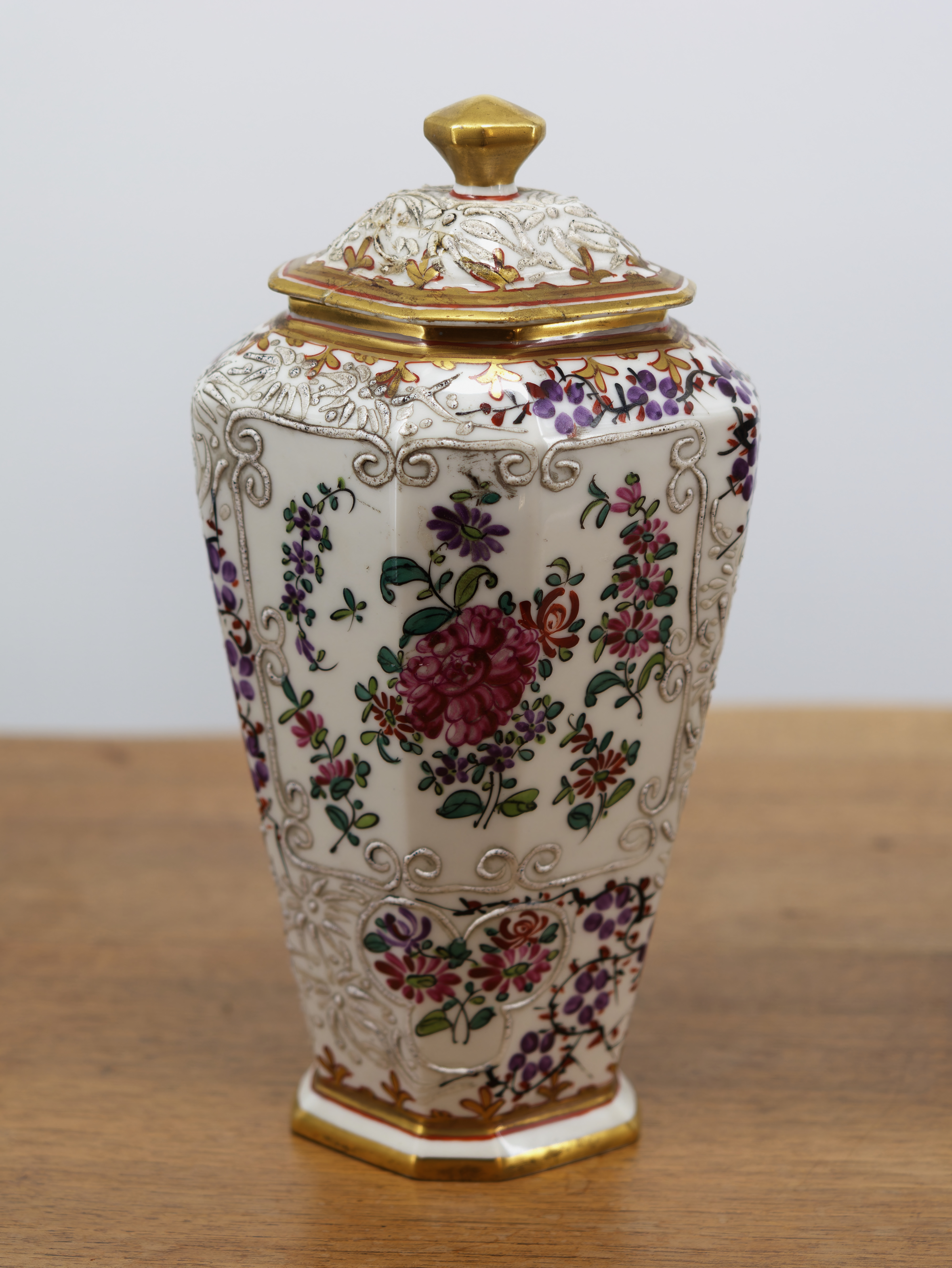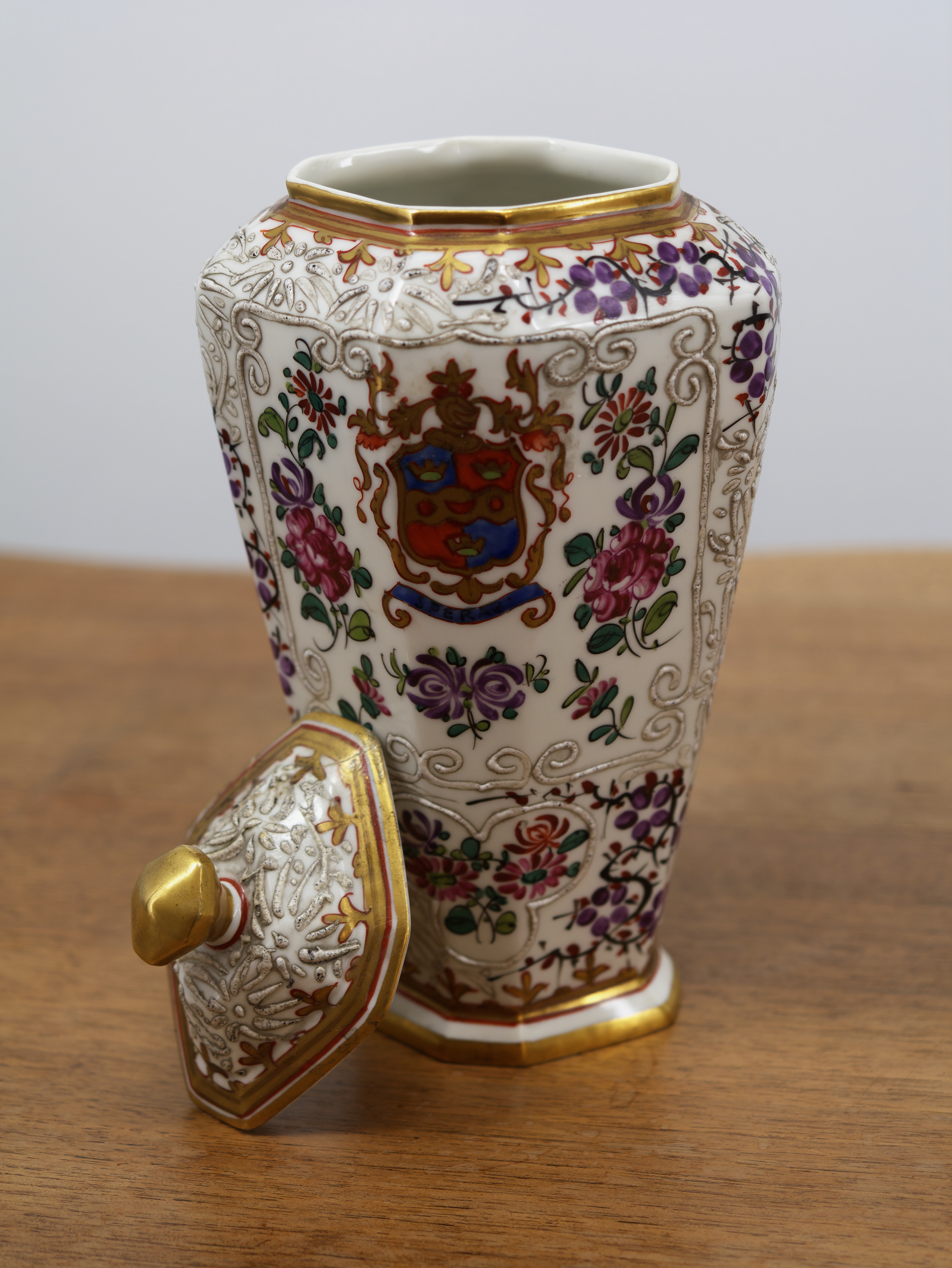 Elegantní pár porcelánových váz s víky z dílny Samson, bohatě ručně malované jemným květinovým dekorem v polychromii. Vázy mají výrazný plastický reliéfní ornament, zlacené okraje a kartuše s malovanými erby, což jim dodává reprezentativní a šlechtický charakter. Typický je mnohostěnný tvar, kvalitní porcelán a precizní ruční práce.
