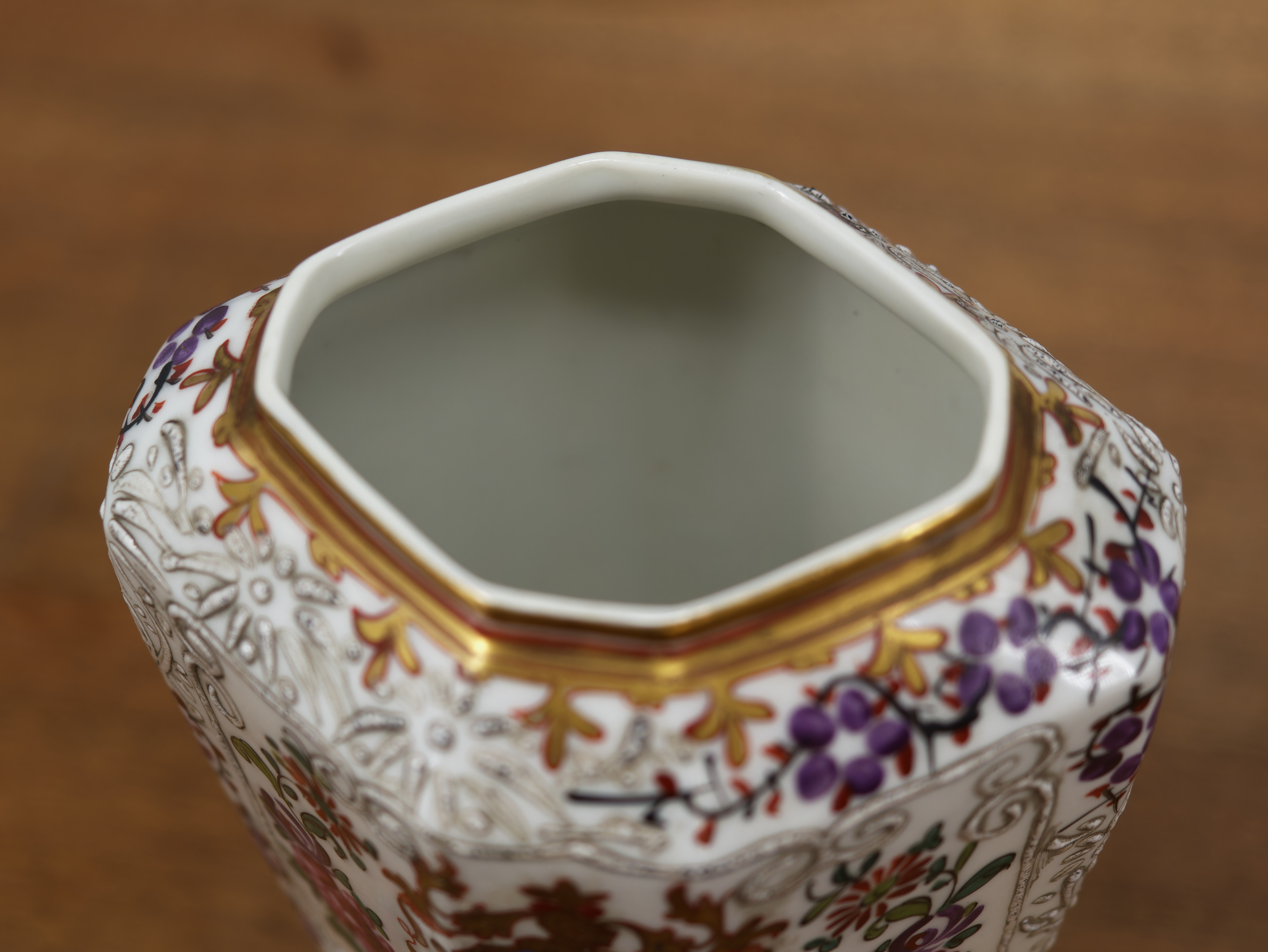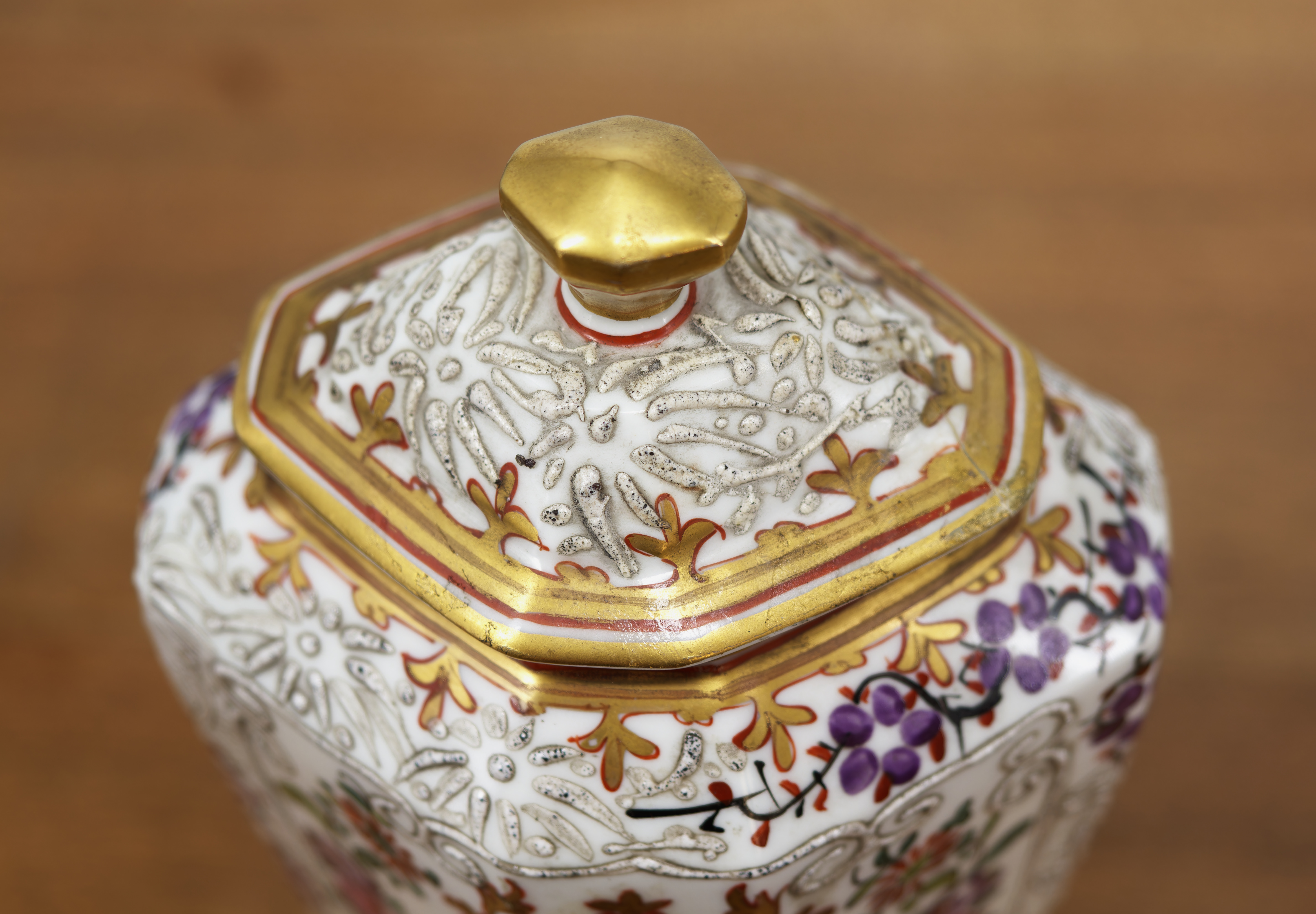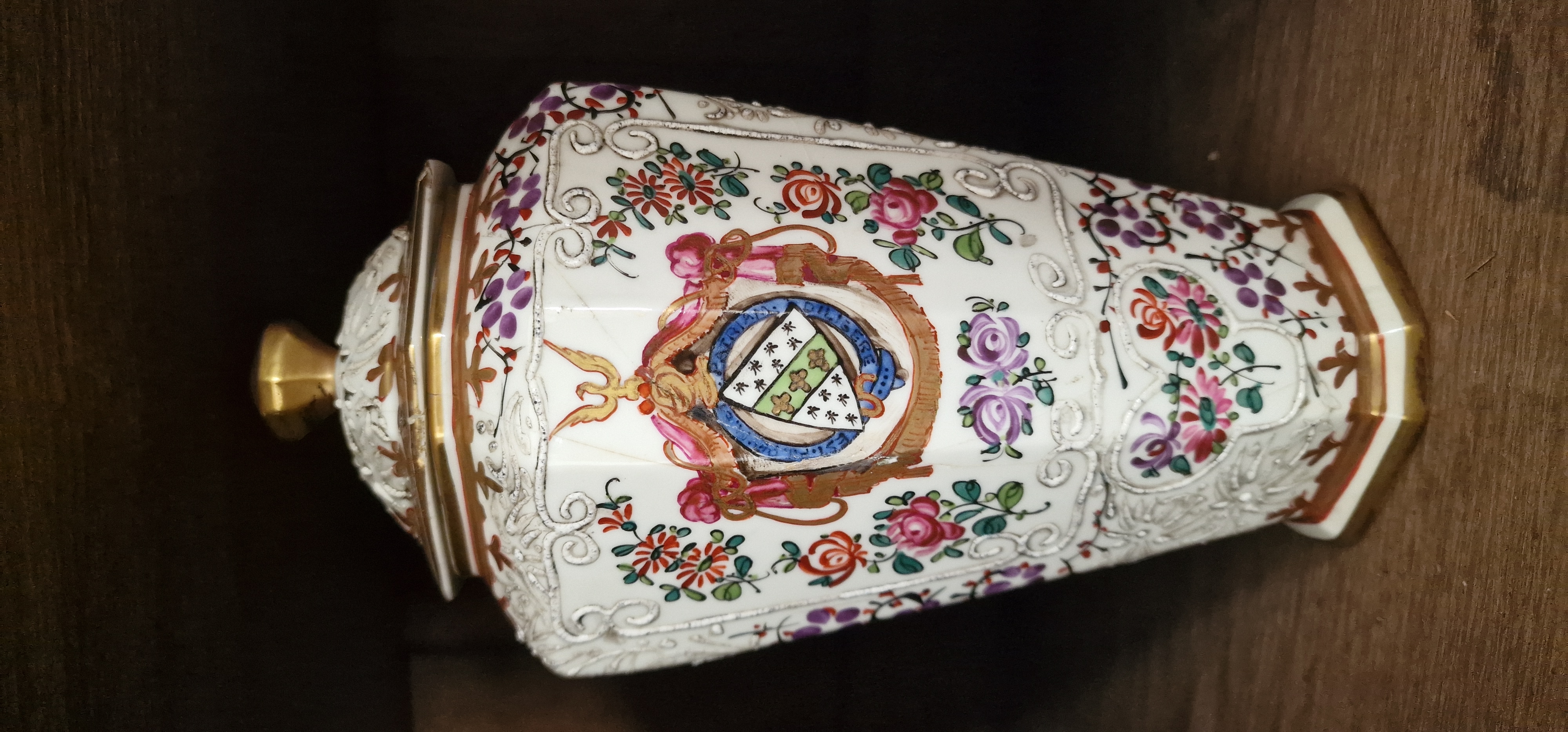 Elegantní pár porcelánových váz s víky z dílny Samson, bohatě ručně malované jemným květinovým dekorem v polychromii. Vázy mají výrazný plastický reliéfní ornament, zlacené okraje a kartuše s malovanými erby, což jim dodává reprezentativní a šlechtický charakter. Typický je mnohostěnný tvar, kvalitní porcelán a precizní ruční práce.