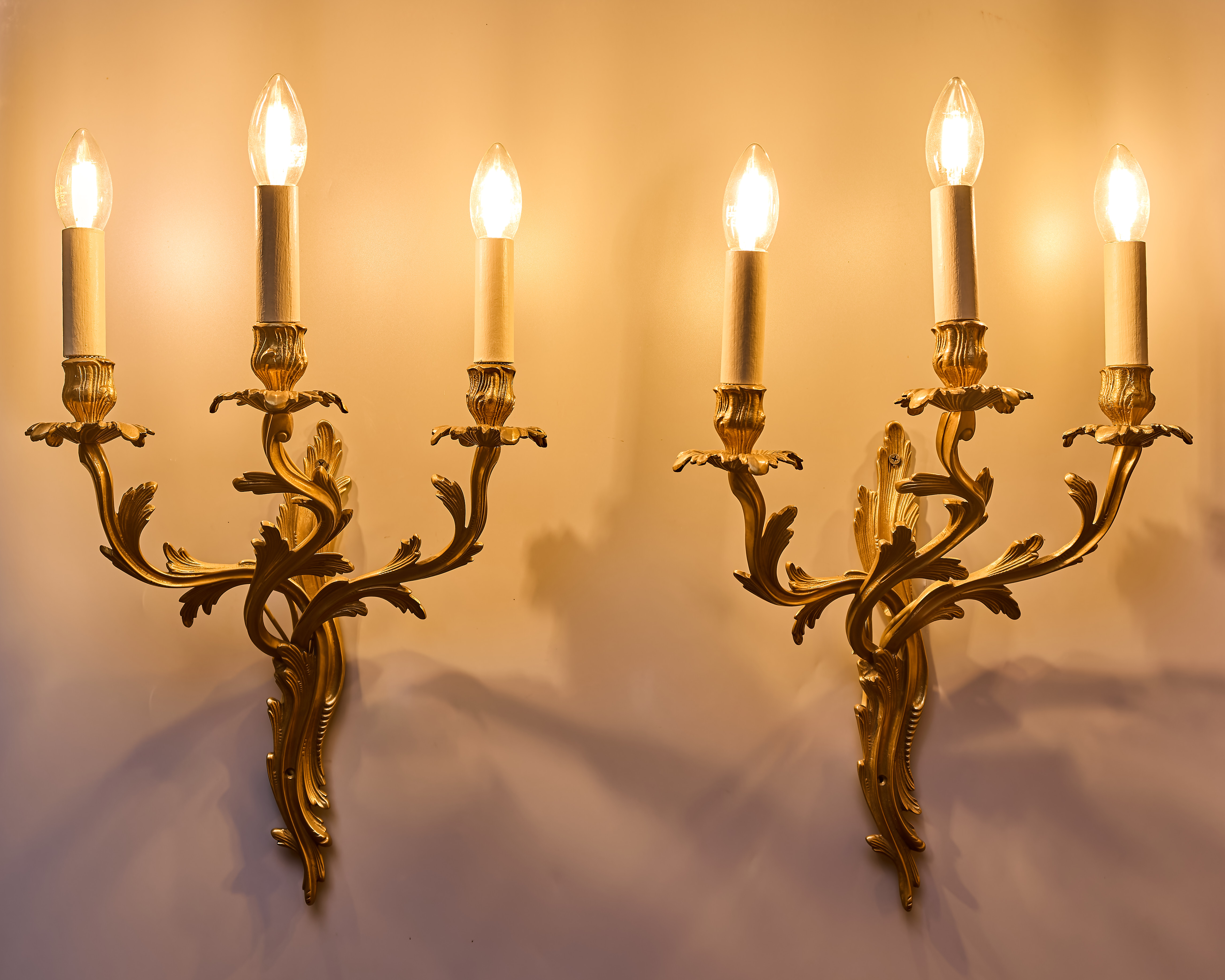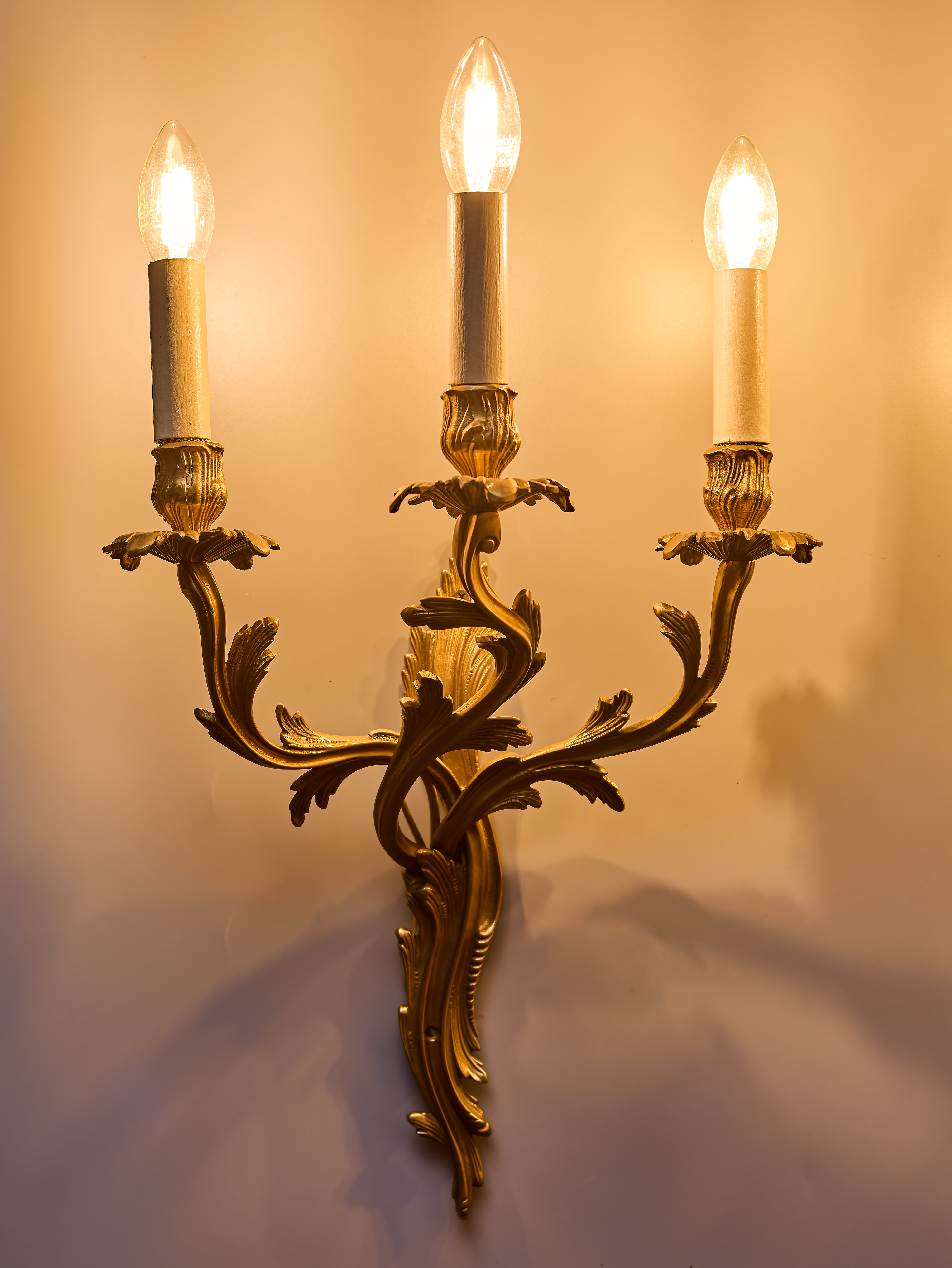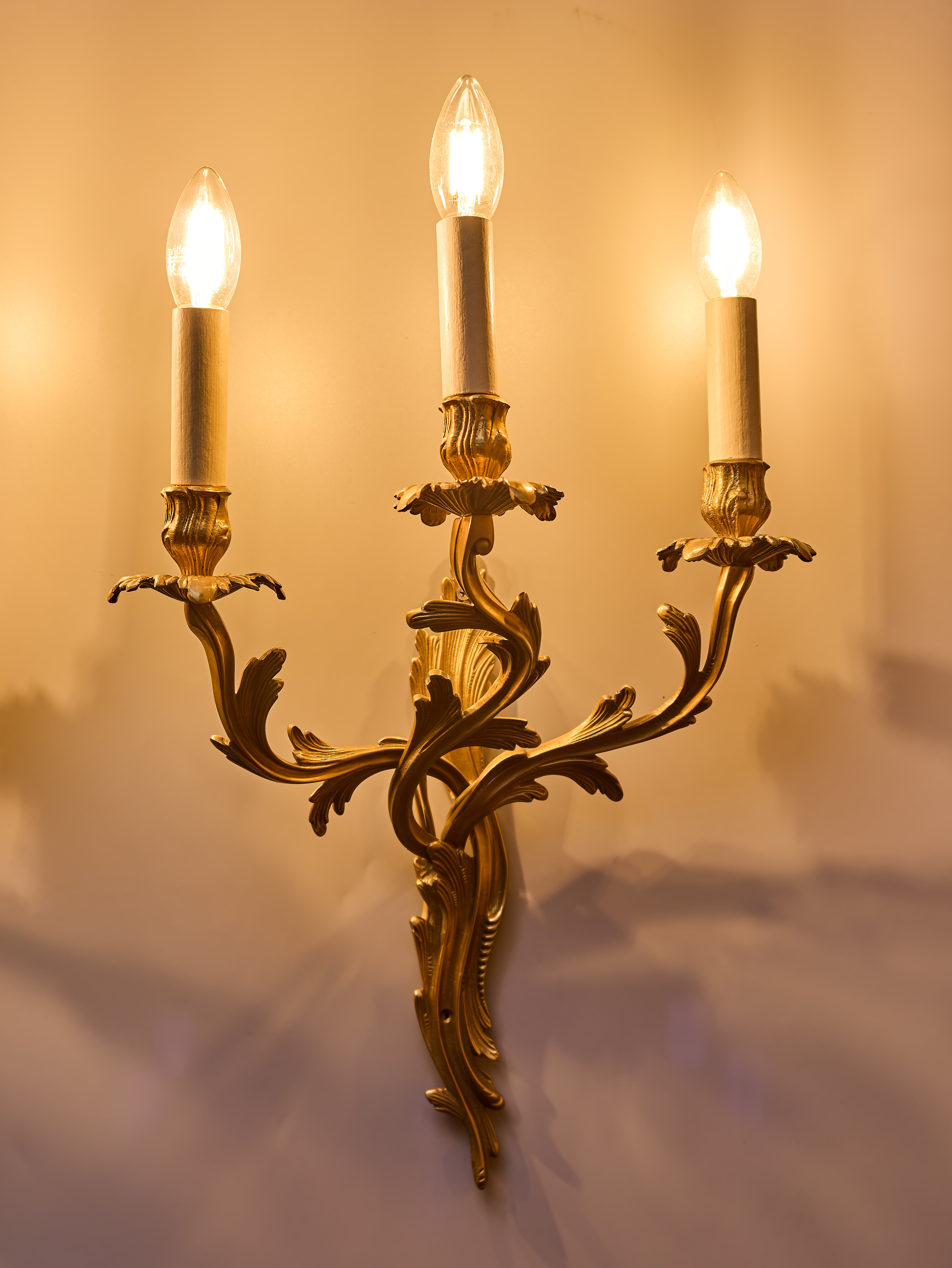 Nástěnné lampy z lité mosazi ve stylu Ludvíka XV. Těžké. Detailní zpracování. Lampy jsou každá na tři žárovky se svíčkovým závitem E14 – vhodné jsou normální, halogenové i led žárovky do 40W (nejsou součástí). Stav: výborný, plně funkční, elektroinstalace už je vyměněná za měděnou. Datace: kolem roku 1980. Provenience: Francie. Cena za kus 13.200 Kč a cena za obě 21.200 Kč