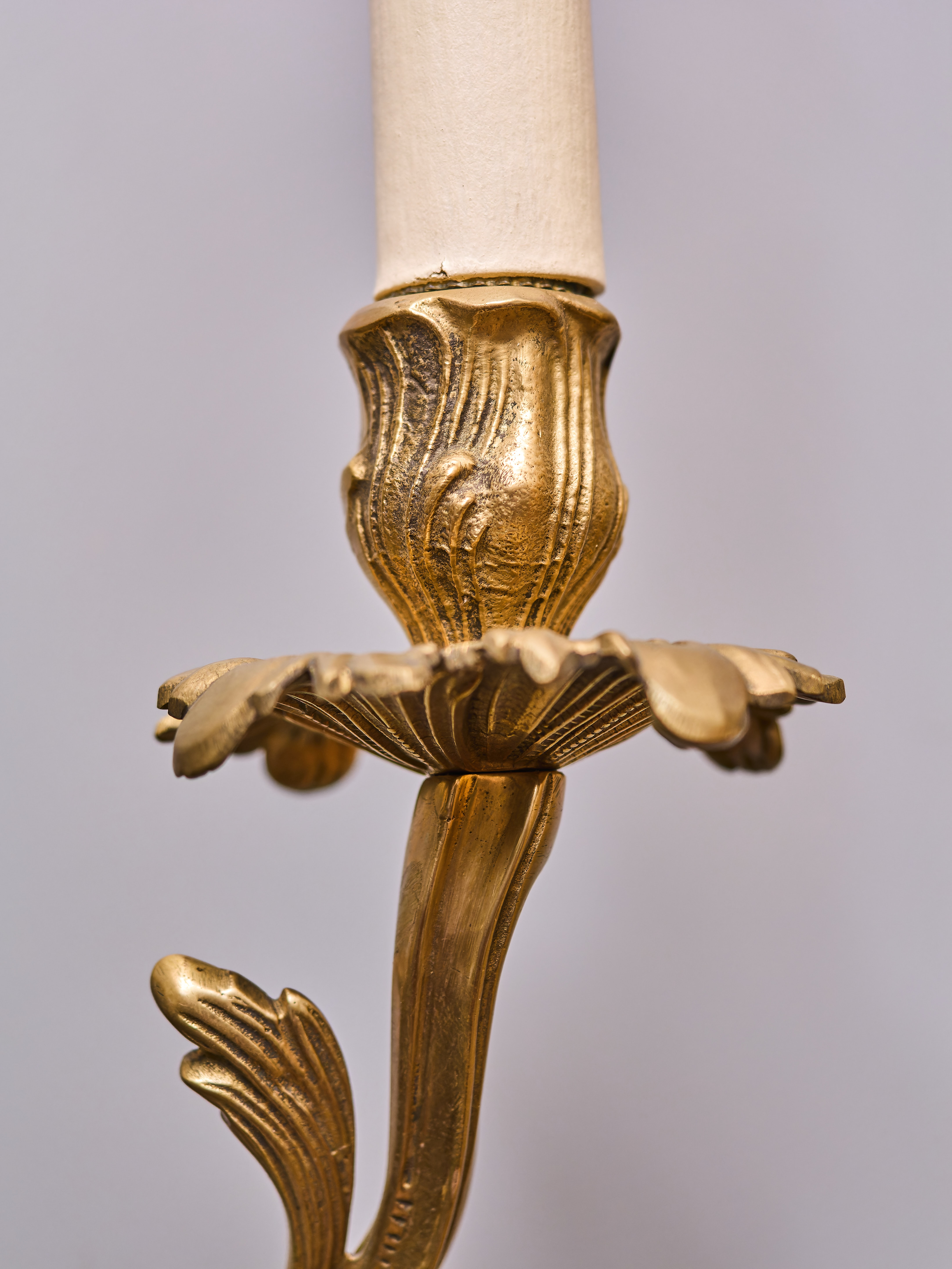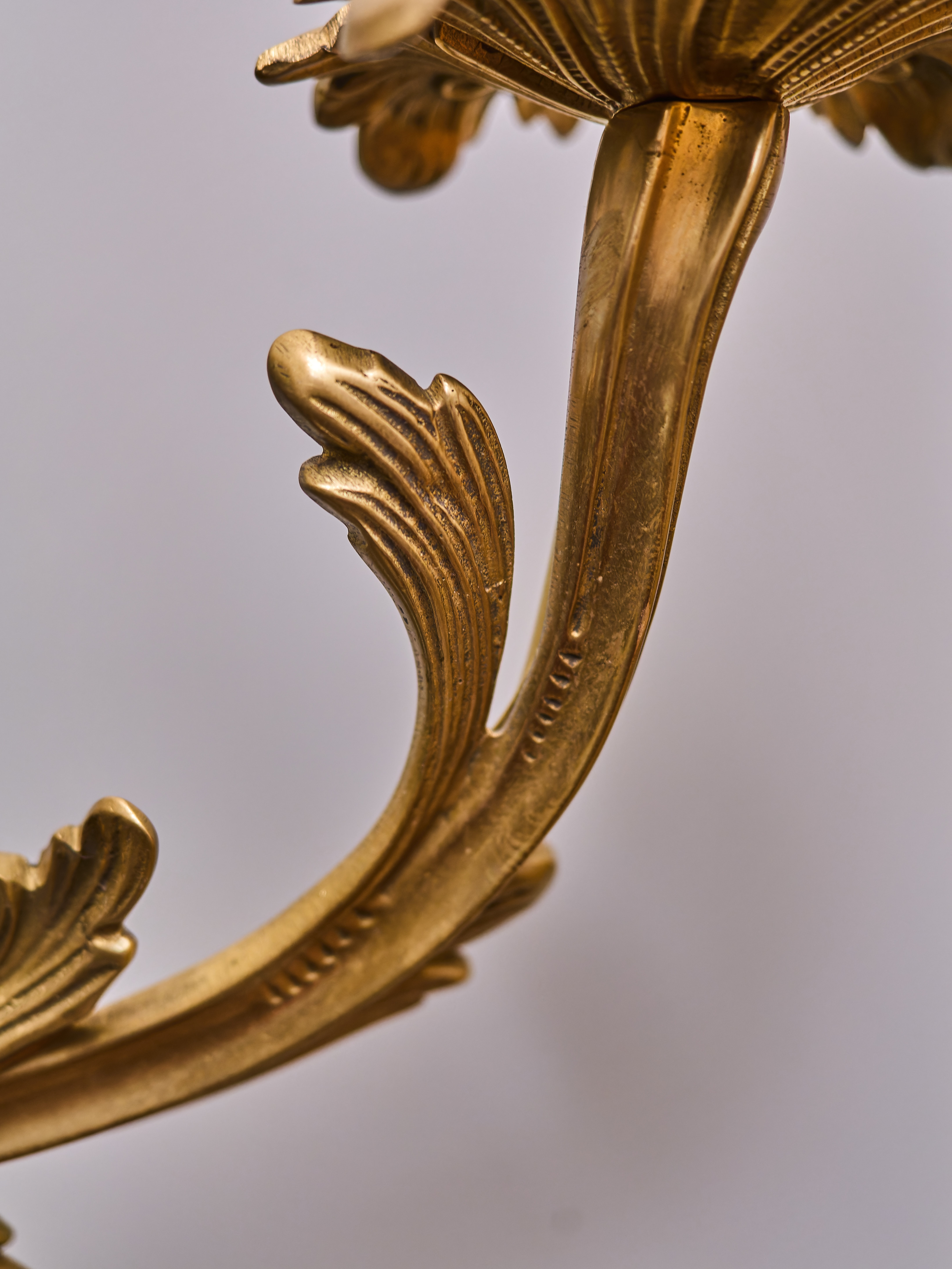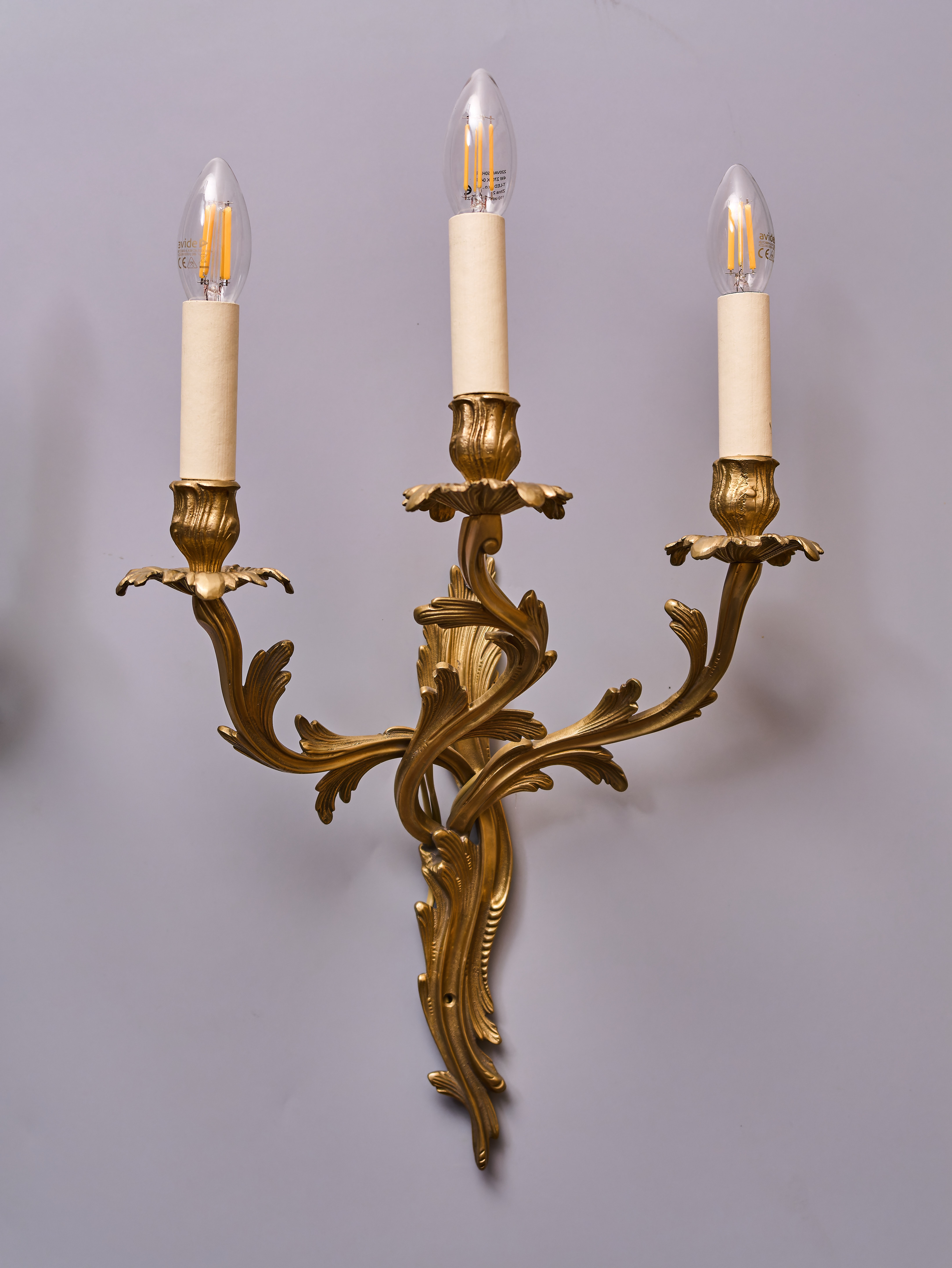 Nástěnné lampy z lité mosazi ve stylu Ludvíka XV. Těžké. Detailní zpracování. Lampy jsou každá na tři žárovky se svíčkovým závitem E14 – vhodné jsou normální, halogenové i led žárovky do 40W (nejsou součástí). Stav: výborný, plně funkční, elektroinstalace už je vyměněná za měděnou. Datace: kolem roku 1980. Provenience: Francie. Cena za kus 13.200 Kč a cena za obě 21.200 Kč