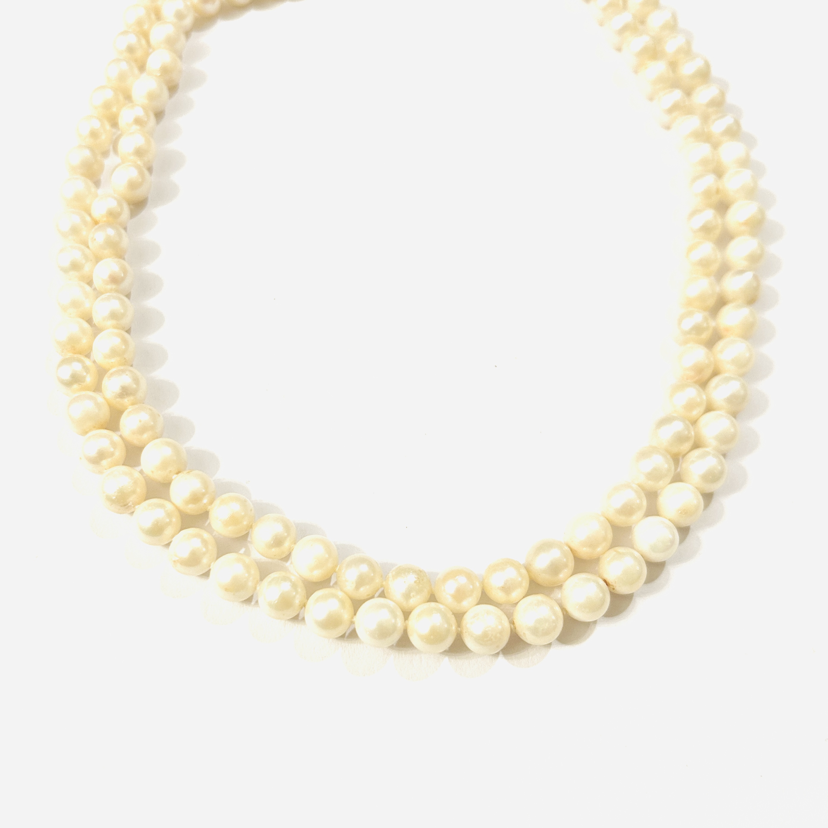 Tradiční náhrdelník se šňůry přírodních kultivovaných smetanově bílých perel, jež vynikají svou kulatostí a průměrem 6,5-7 mm. Vhodné k dennímu nošení i večerní příležitosti, netuzemská práce z 2. poloviny 20. století.