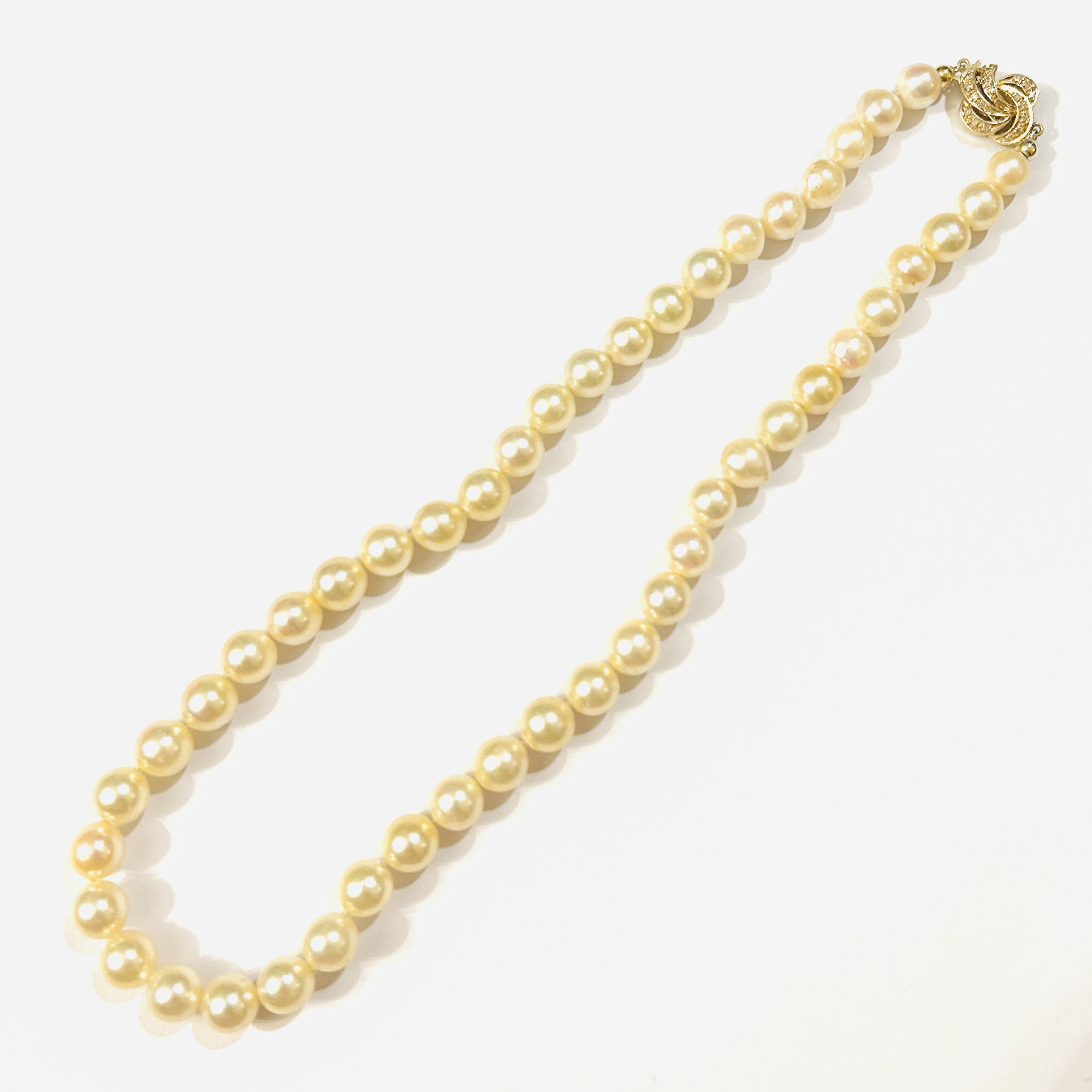 Výrazný náhrdelník se šňůry přírodních kultivovaných smetanově bílých mořských perel, které vynikají svou mírnou organickou asymterií, leskem a větším průměrem 8-9 mm. Zapínání ve tvaru stylizovaného prořezávaného pletence, oboustranně osazeno přírodními diamanty kulatého jednoduchého brusu o celkové cca váze 0,54 ct (0,015 ct – 36 ks). Vkusný, tradiční šperk vhodný k dennímu nošení i večerní příležitosti, západoevropská práce z 50. až 80. let 20. století.