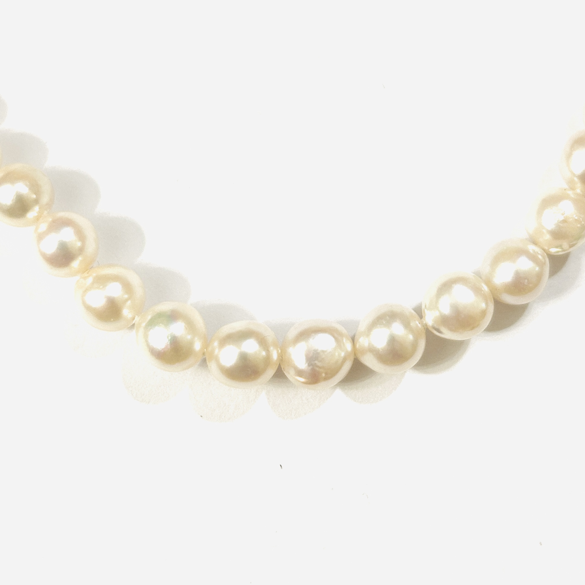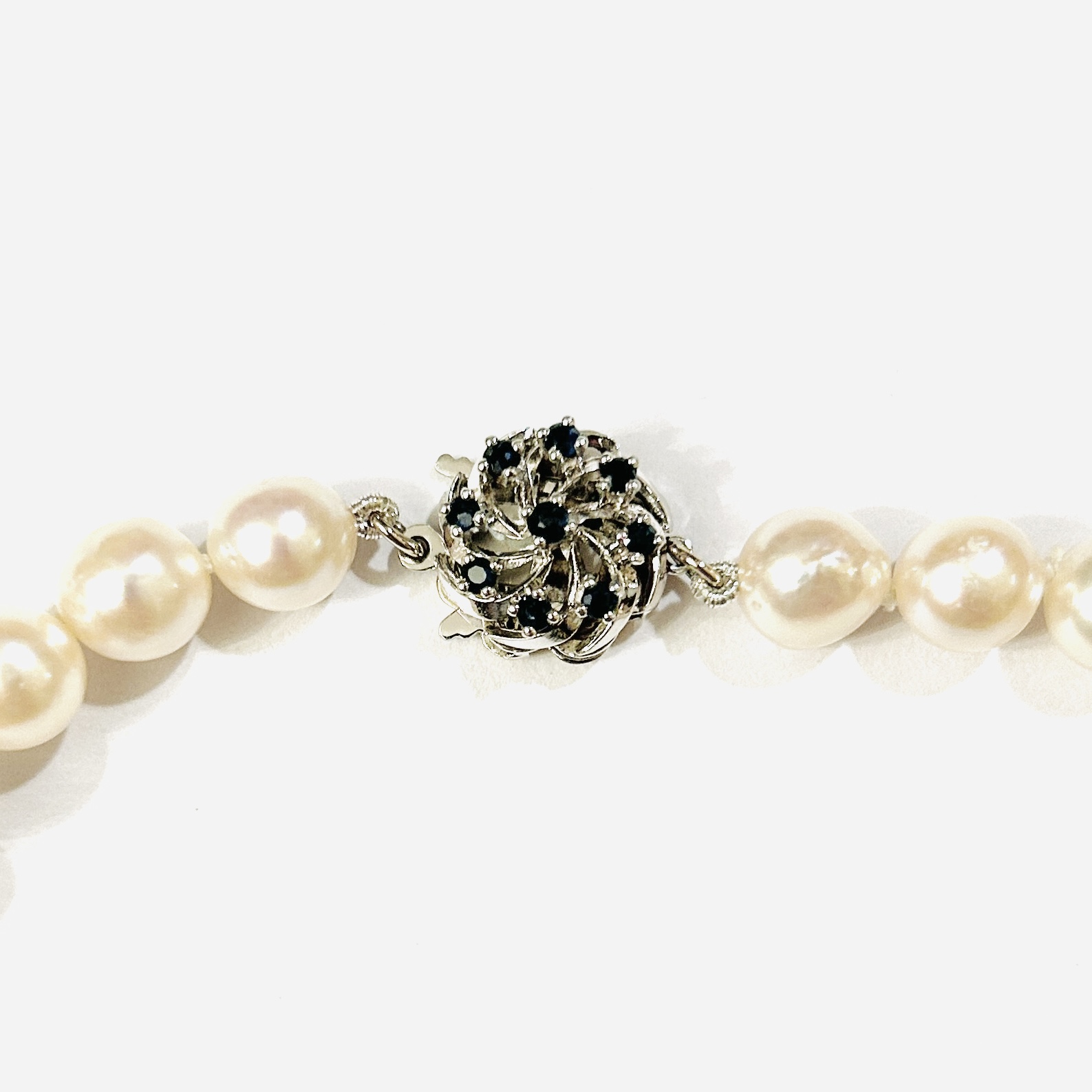 Výrazný náhrdelník se šňůry přírodních kultivovaných mořských Akoya bílých perel, které vynikají svou organickou asymteričností, vysokým leskem a větším průměrem okolo 8 mm. Kulaté zapínání v podobě točitého květu osazeno 9 přírodními modrými safíry kulatého brusu. Vkusný, tradiční šperk vhodný k dennímu nošení i večerní příležitosti, západoevropská práce z 60. až 80. let 20. století.