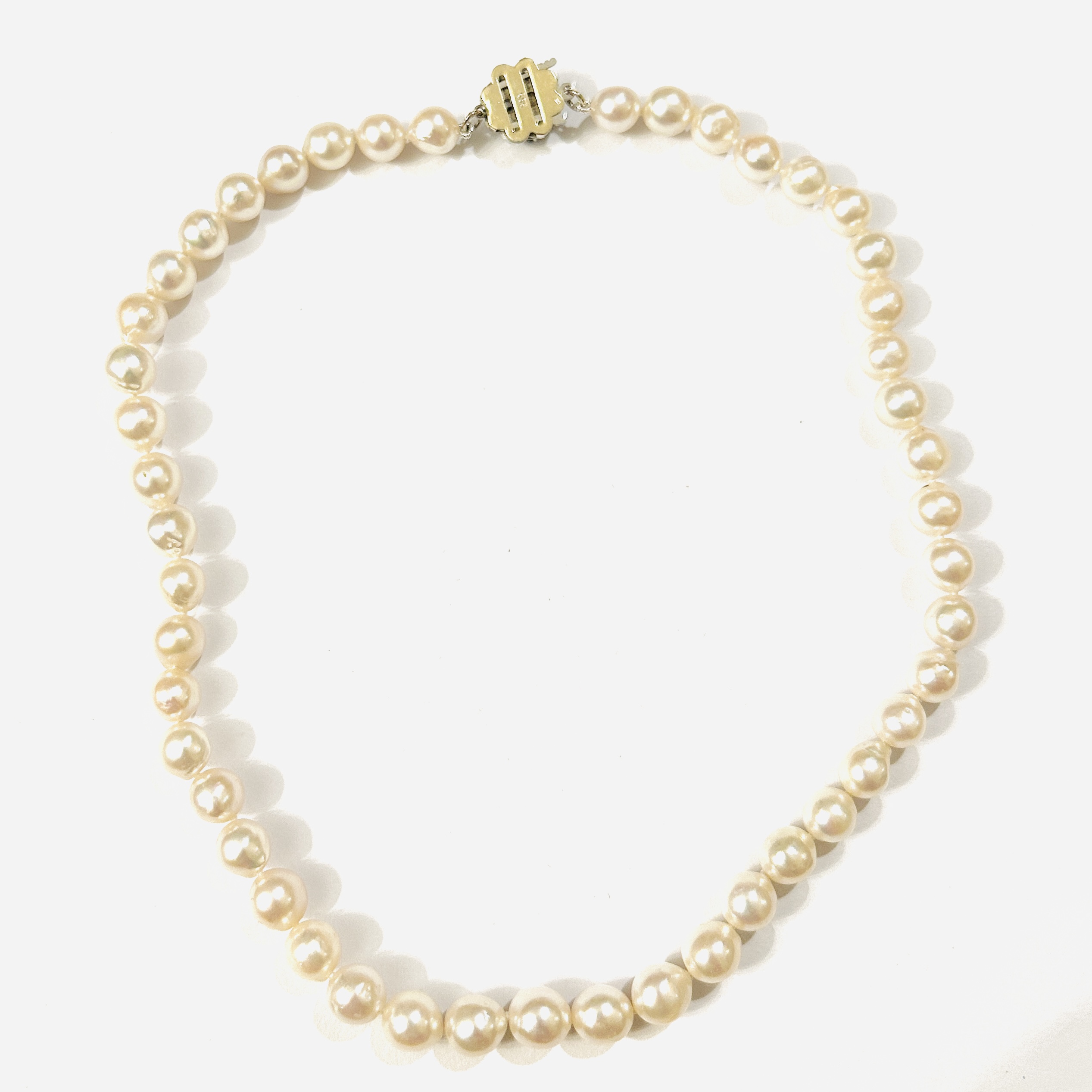 Zapínání zhotoveno z bílého a žlutého 14 karátového zlata, tj. o ryzosti 585/1000; nově opatřeno puncem Z-58 (labuť 4) zespod, ryzostní číslo též a na zapínacím háčku. Hmotnost 40,24 g, délka 44 cm, průměr zapínání 13 mm. Nově převlečeno, perly jsou mezi sebou pečlivě uzlíkovány. Zapínání v pořádku, celkově ve velmi zachovalém stavu.