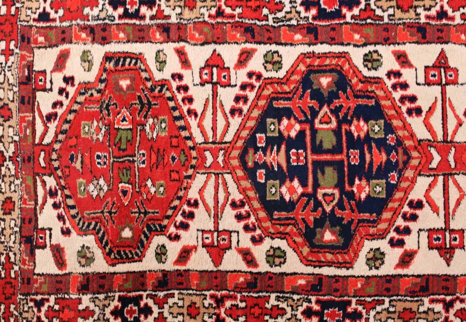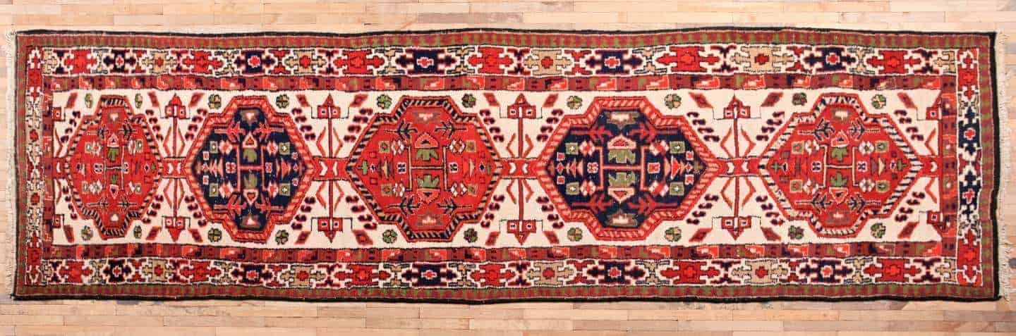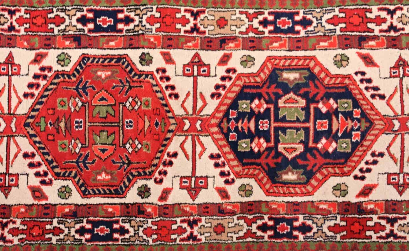 Ručně vázaný koberec z Hamedánské oblasti – Írán. Venkovská tvorba. Zajímavý geometrický motiv se středovými medailony. Osnova a útek z bavlny, vlas tvoří kvalitní vlna. Odolný koberec vhodný i do frekventovaných míst. Koberec je v dobrém stavu s patinou. Stáří koberce je asi 40 let. Hustota vazby +/- 90.000 uzlů na m2.