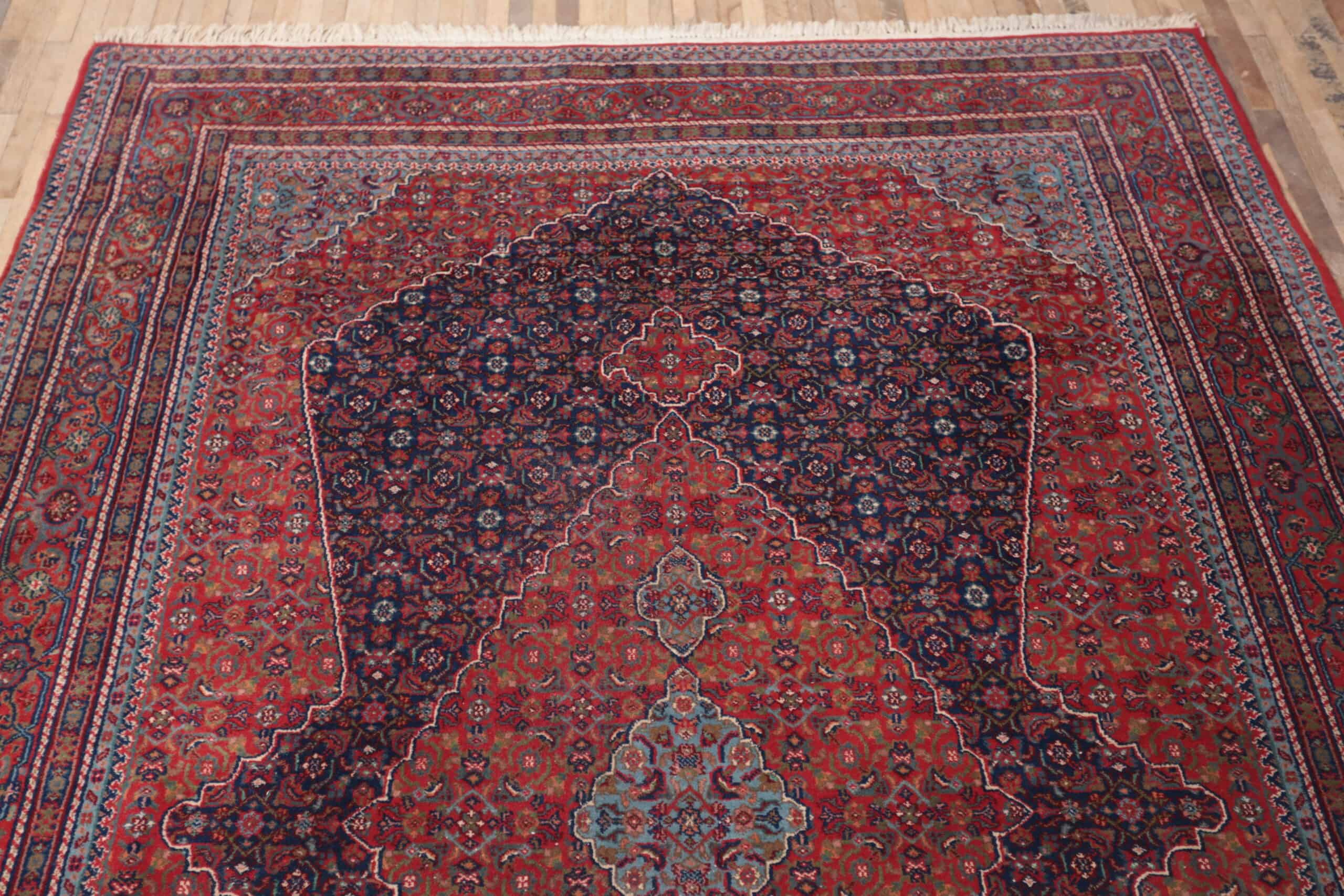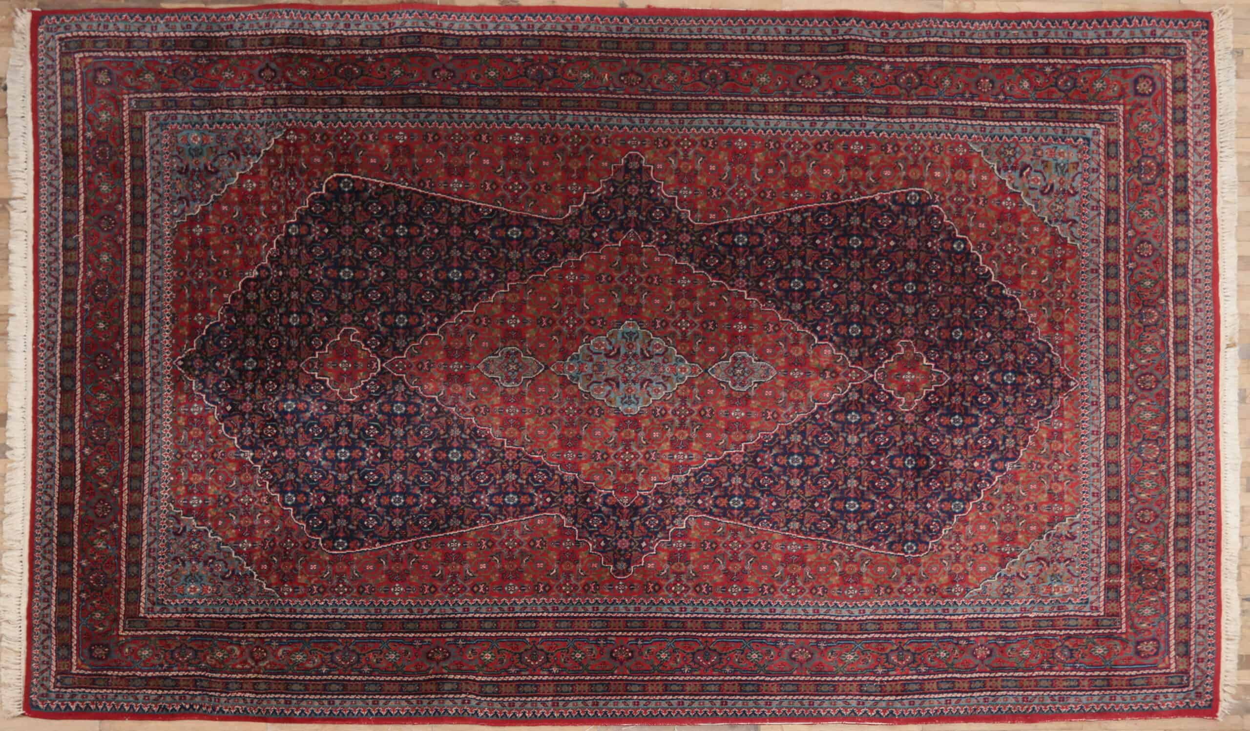 Ručně vázaný perský koberec z oblasti Bidjaru. Velmi kvalitní vysokohorská vlna na bavlněné osnově. Hustota vazby kolem 160.000 uzlů na m2. Koberec je vázán velmi hustě a je dost těžký. Koberce z této oblasti jsou proslulé kvalitou a dlouhou životností. Tlumená barevnost koberce je příjemná a nebude v interiéru rušit. Stav: velmi dobrý, čistý, ihned k užívání. Datace: Kolem roku 1990. Provenience: Írán.