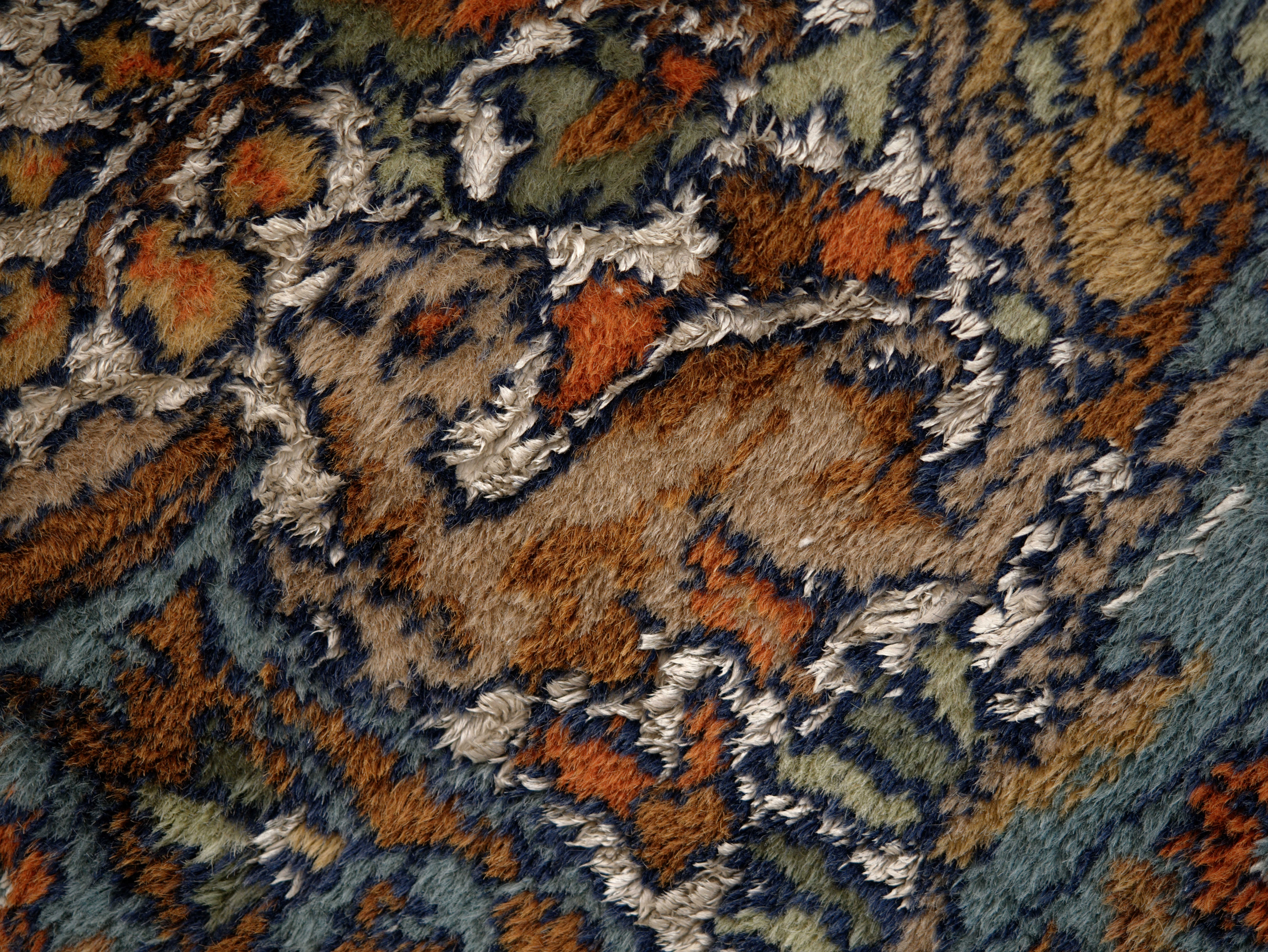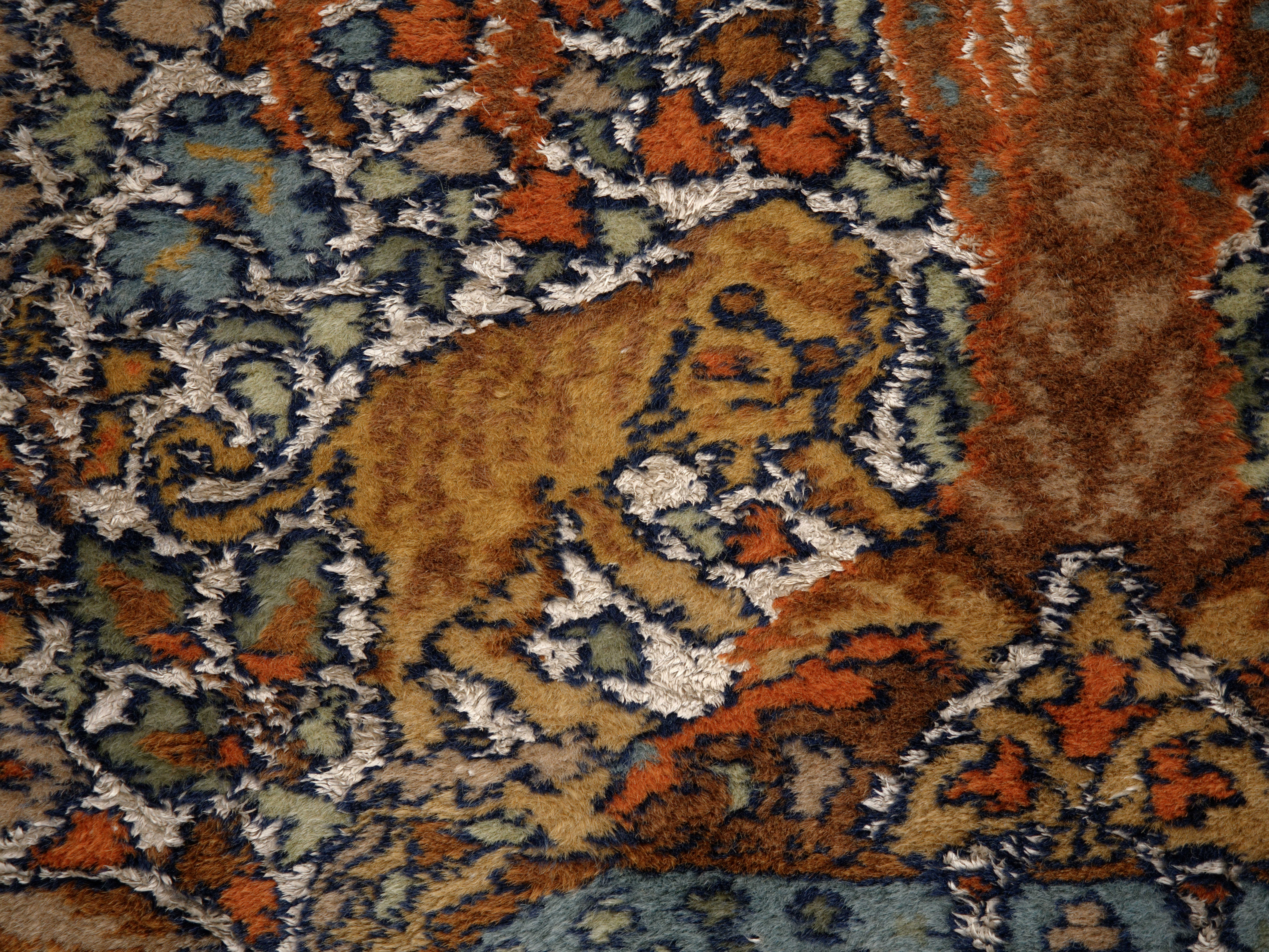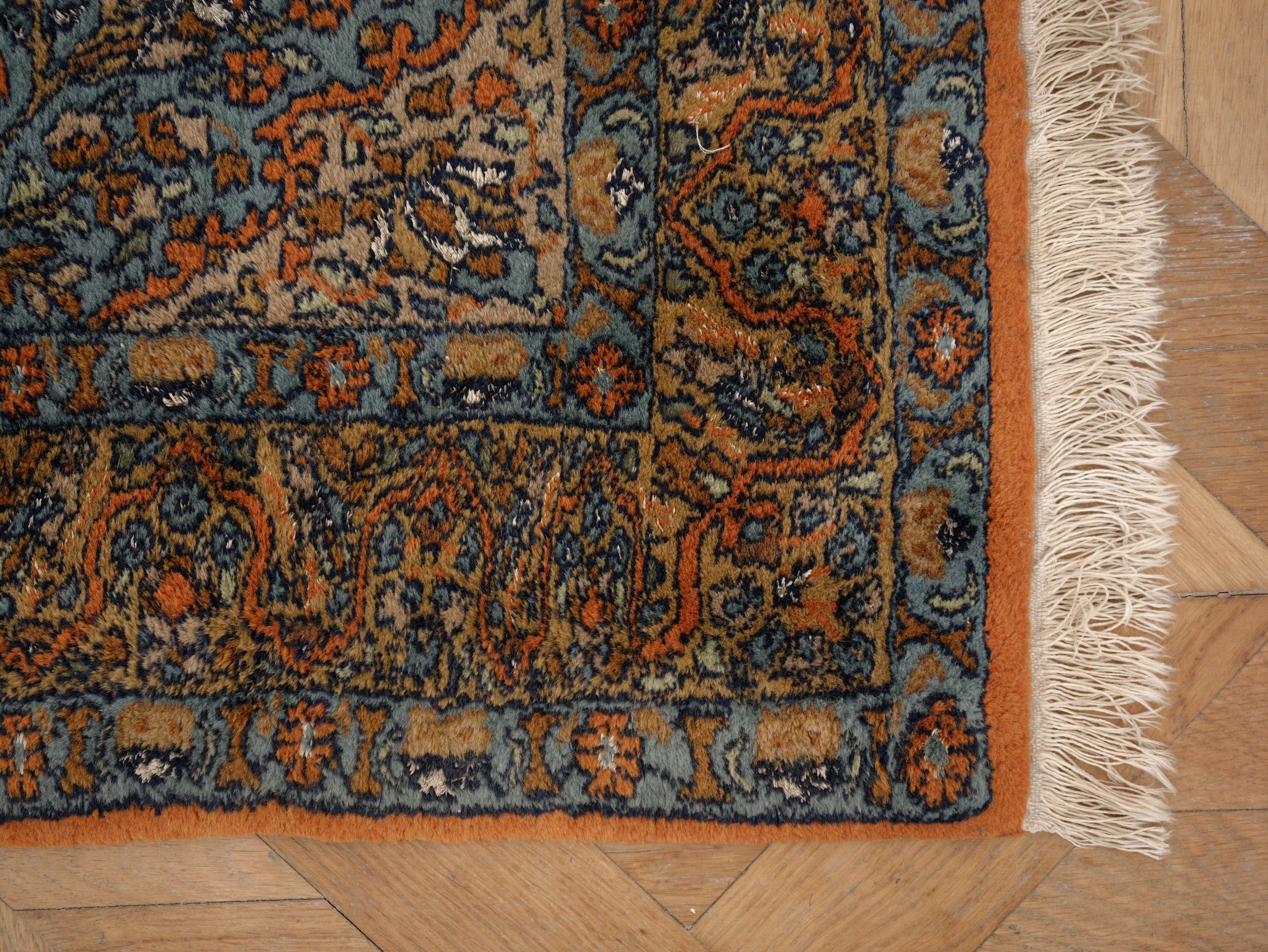 Velmi jemná a detailní vazba umožňuje propracovaný dekor s výraznou kresbou. Kombinace s hedvábím dodává koberci jemný lesk, který se mění podle dopadu světla. Barevnost je harmonická, s převahou teplých tónů doplněných modrými a zelenými akcenty.