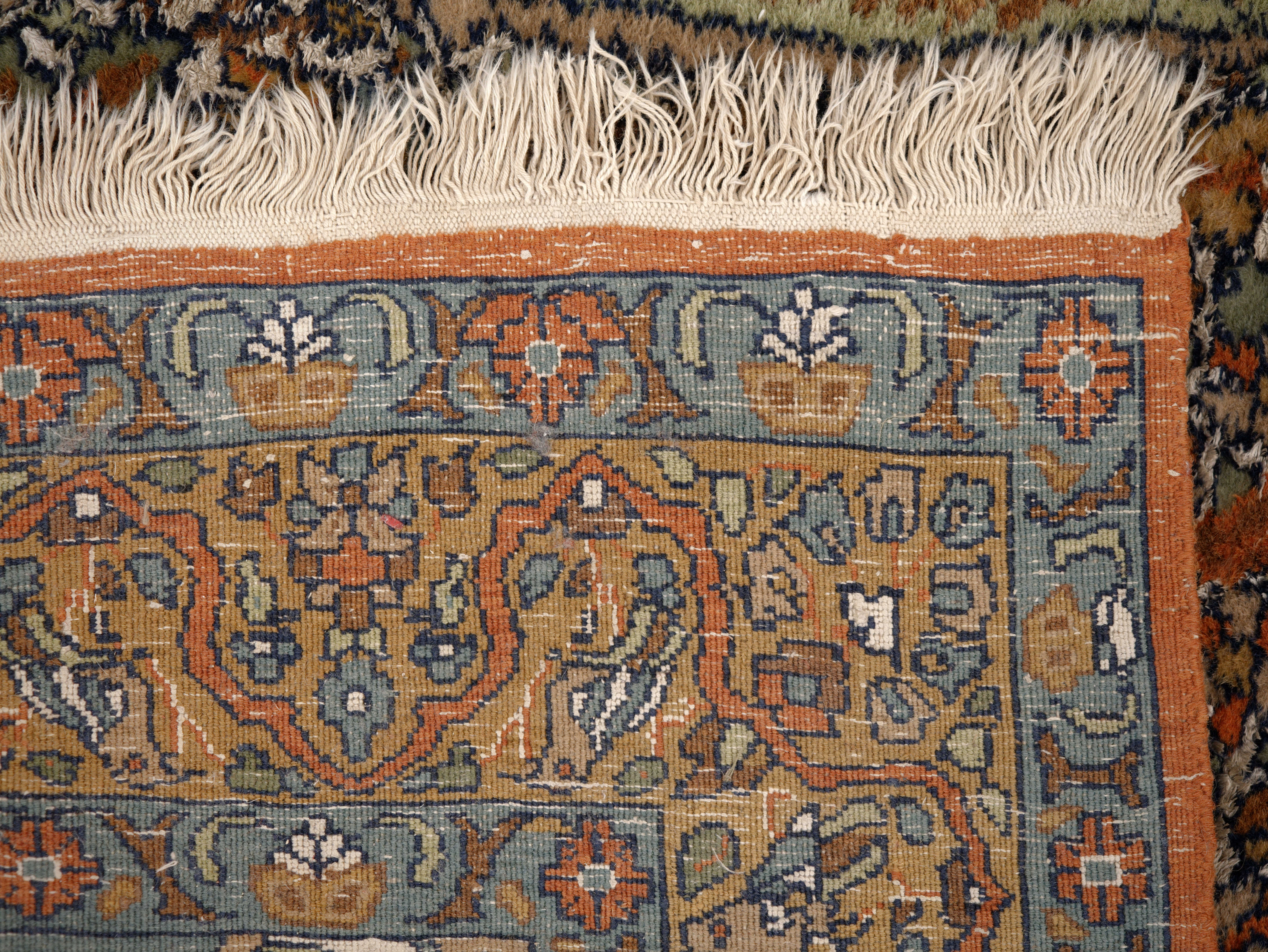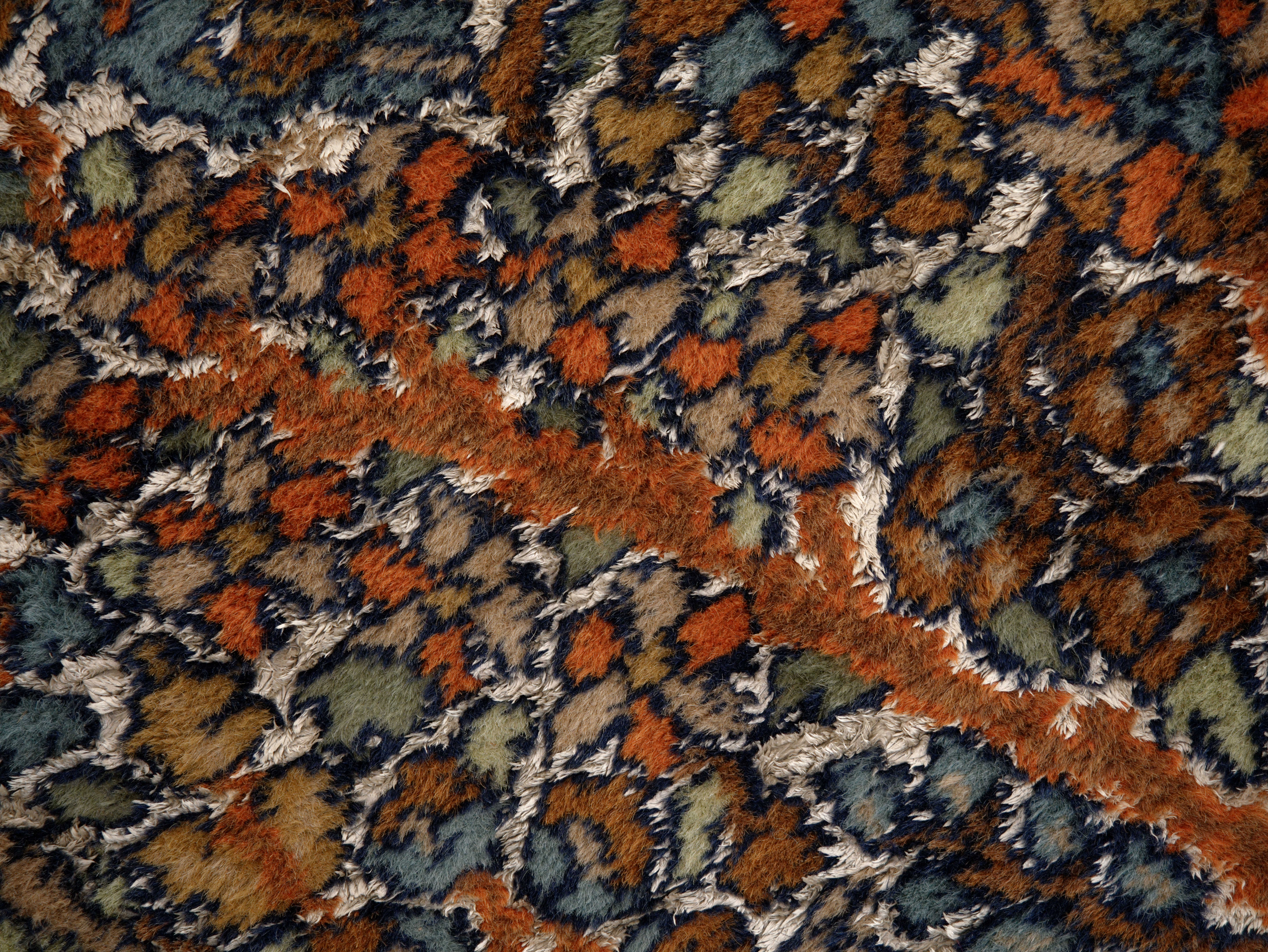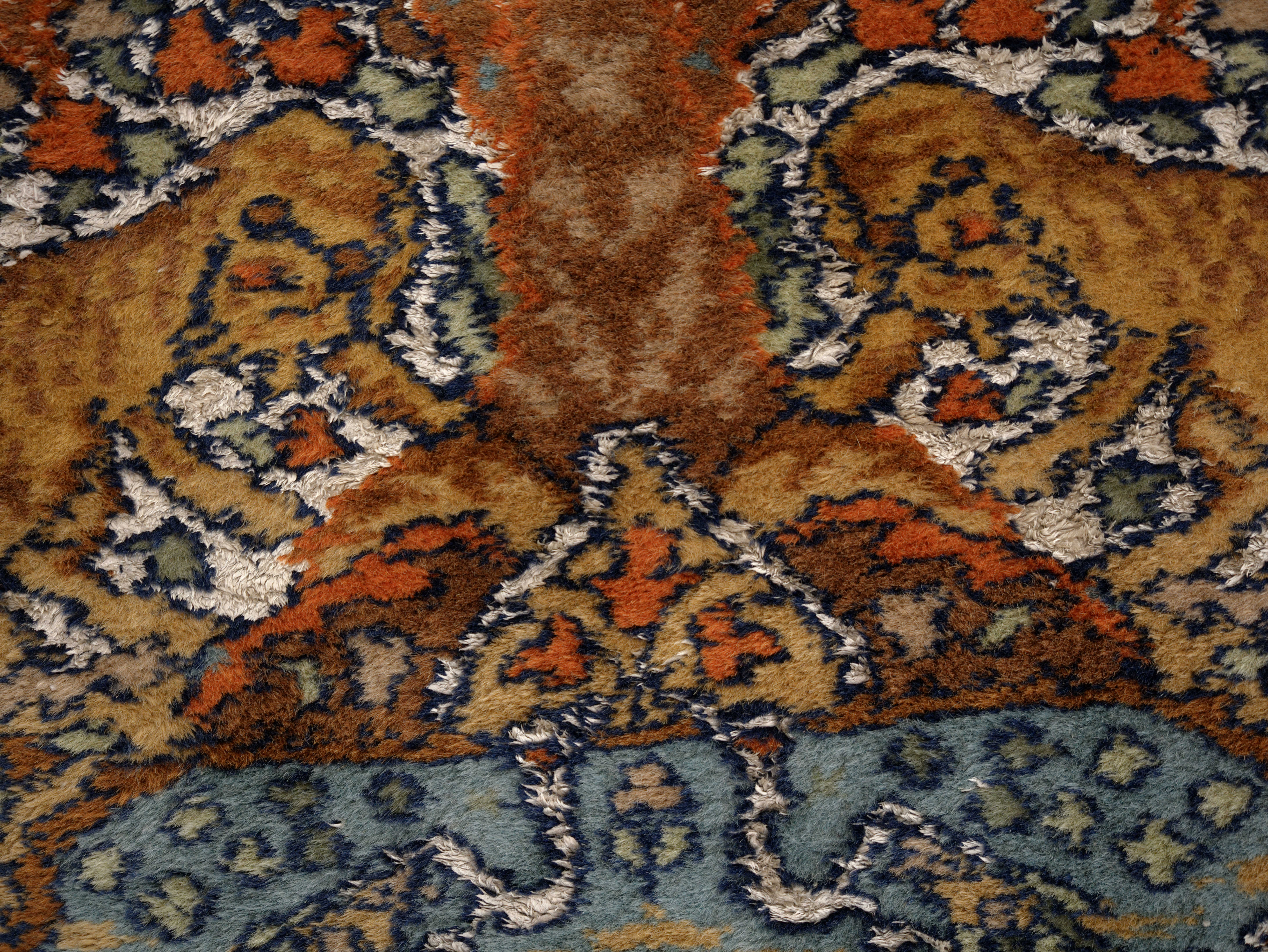 Velmi jemná a detailní vazba umožňuje propracovaný dekor s výraznou kresbou. Kombinace s hedvábím dodává koberci jemný lesk, který se mění podle dopadu světla. Barevnost je harmonická, s převahou teplých tónů doplněných modrými a zelenými akcenty.