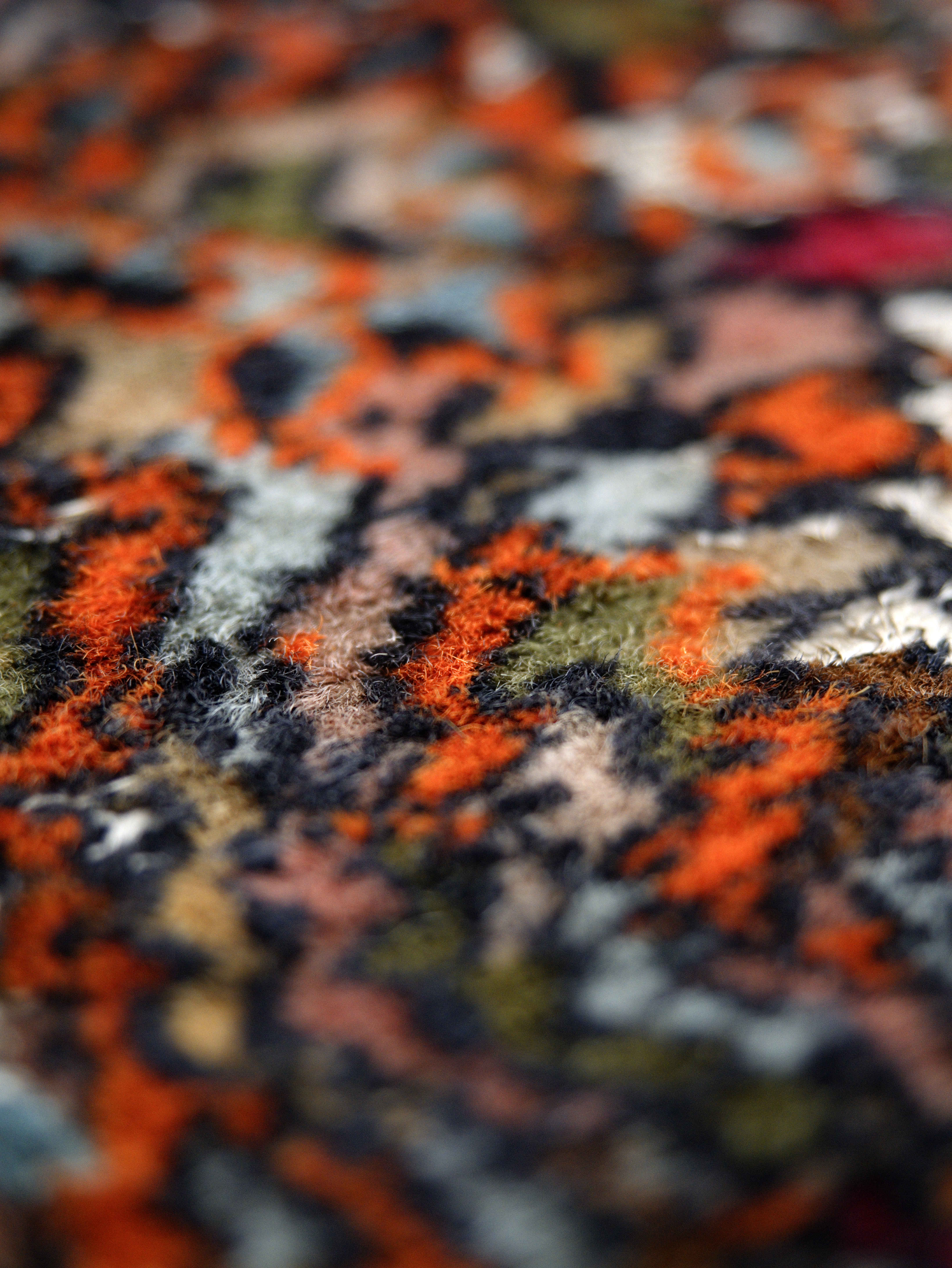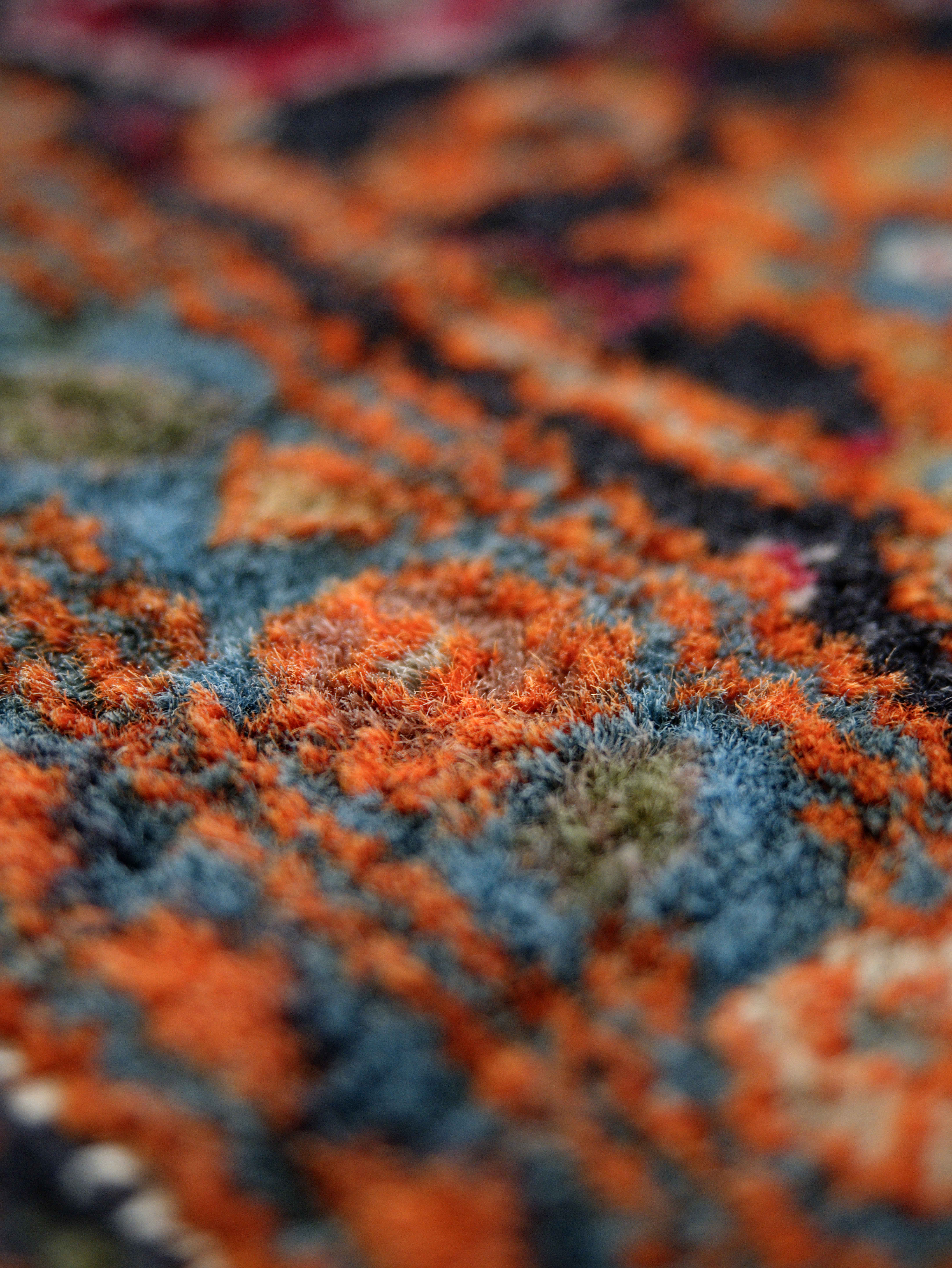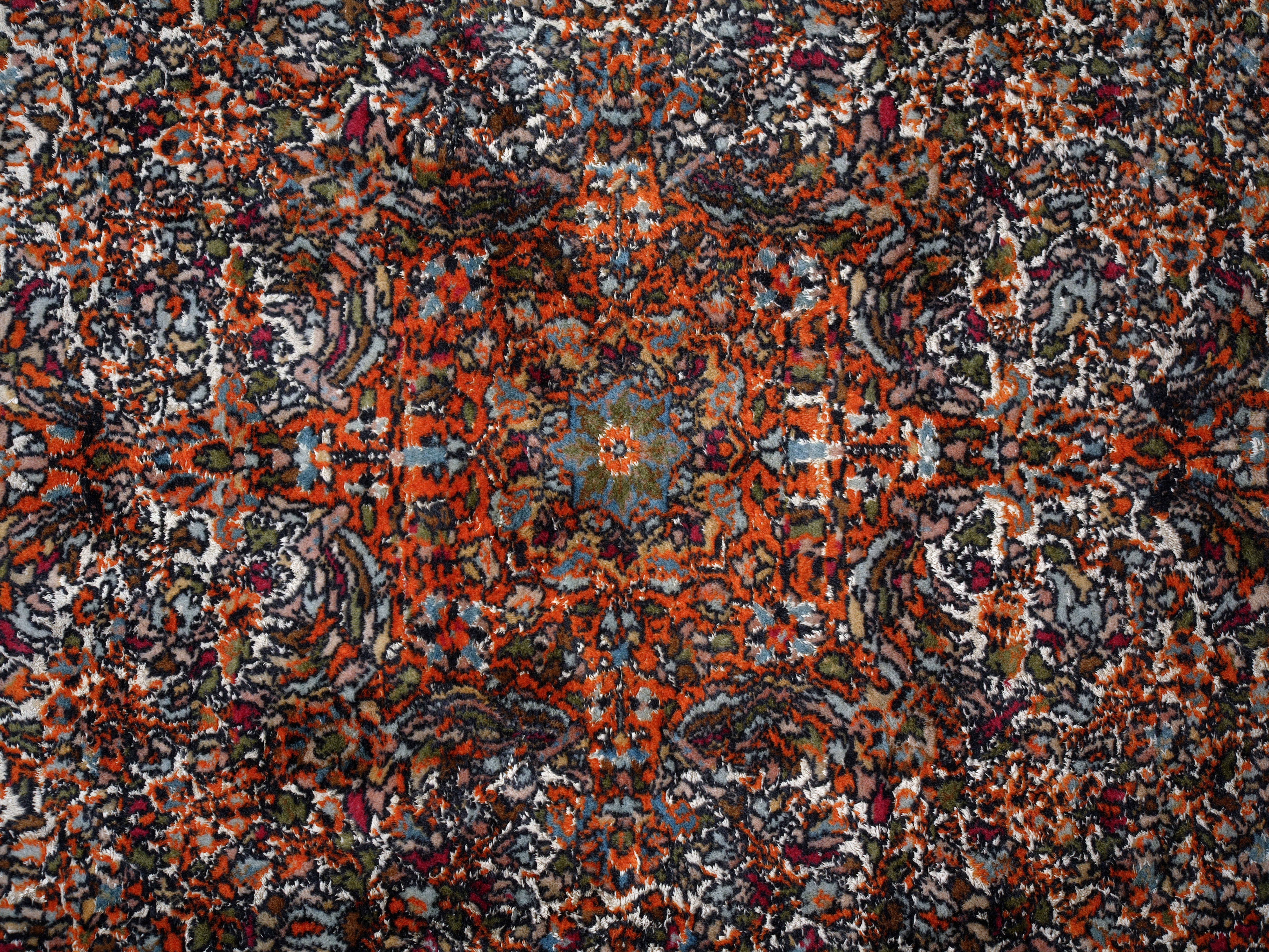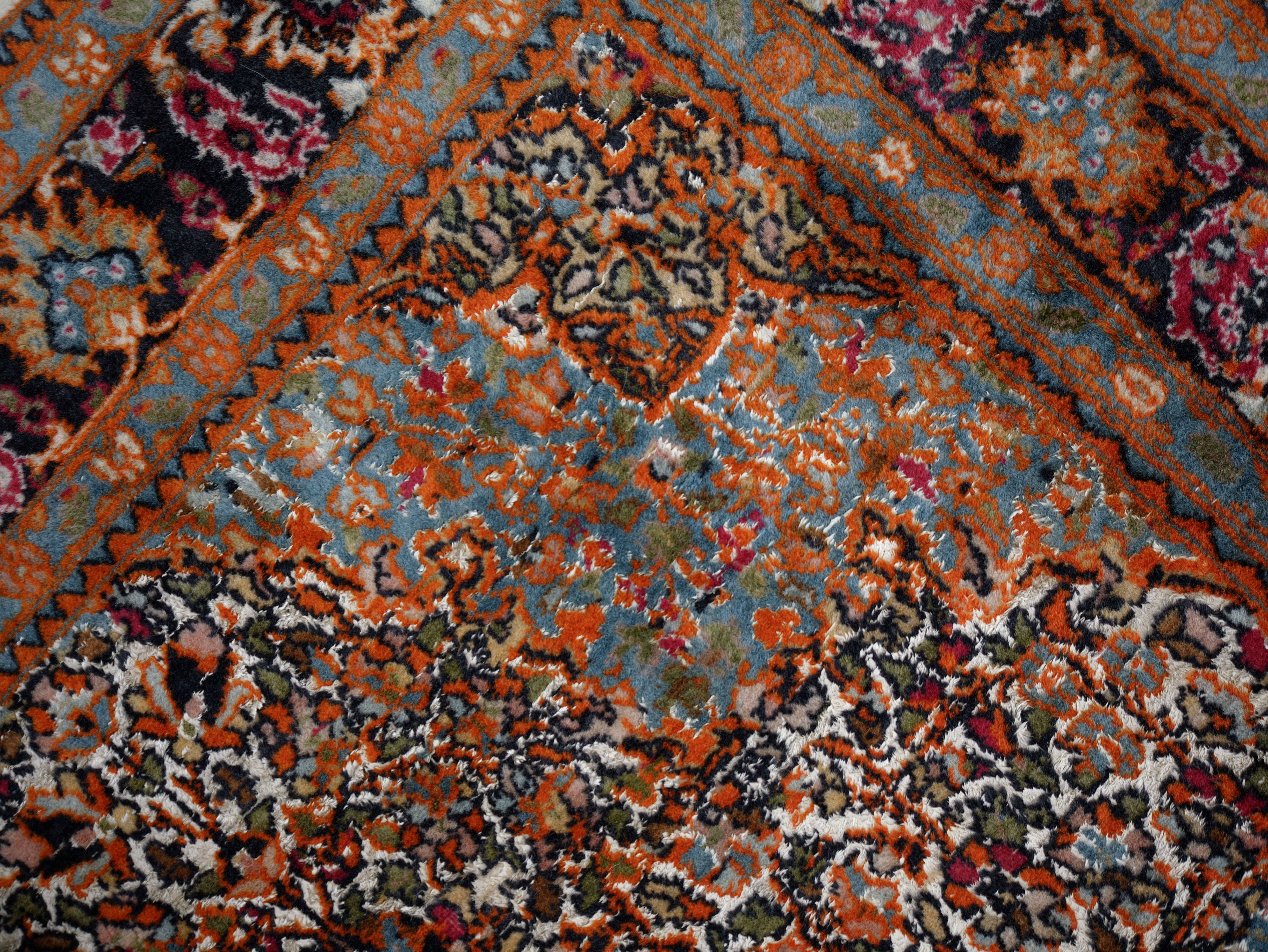 Barevnost kombinuje teplé odstíny červené a oranžové s modrými, krémovými a zelenými tóny, čímž vzniká vyvážený a elegantní celek. Hedvábné prvky dodávají koberci hloubku a proměnlivost při dopadu světla.