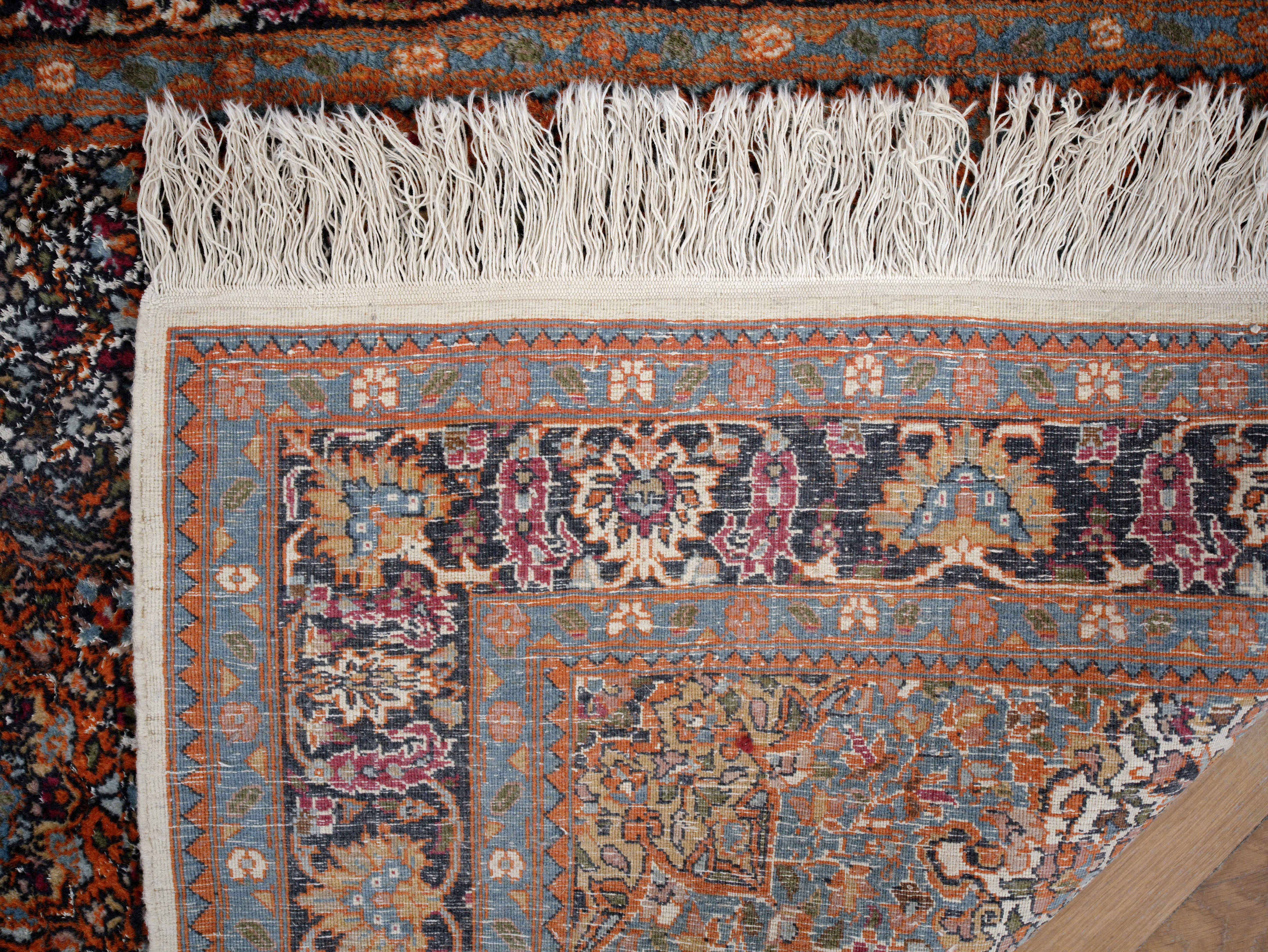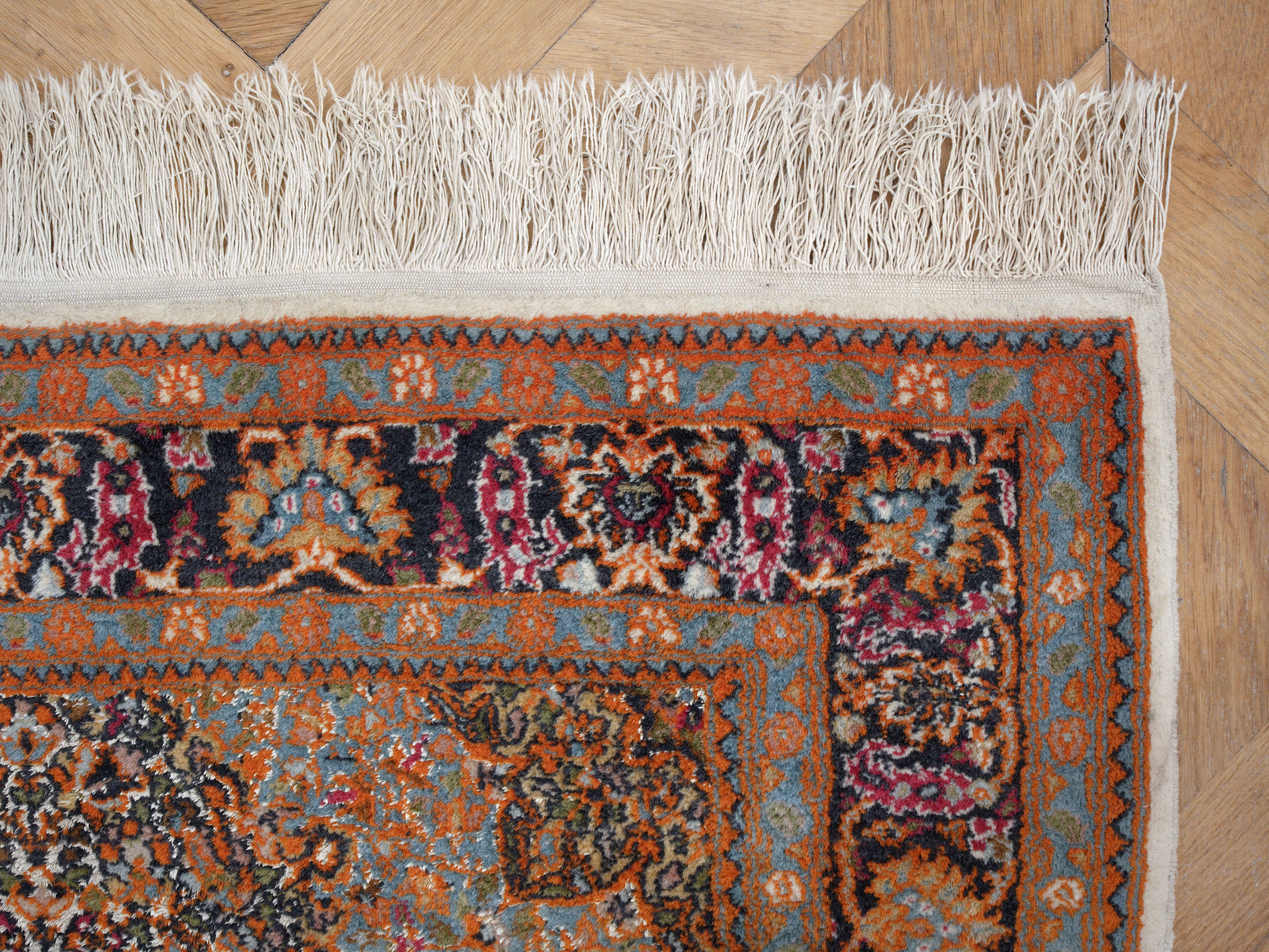 Ručně vázaný perský koberec z proslulé oblasti Ghom v Íránu představuje ukázku precizního řemesla a vysoké kvality materiálů. Vlas tvoří jemná korková vlna v kombinaci s hedvábím, které dodává povrchu typický jemný lesk a zvýrazňuje detail ornamentu.
