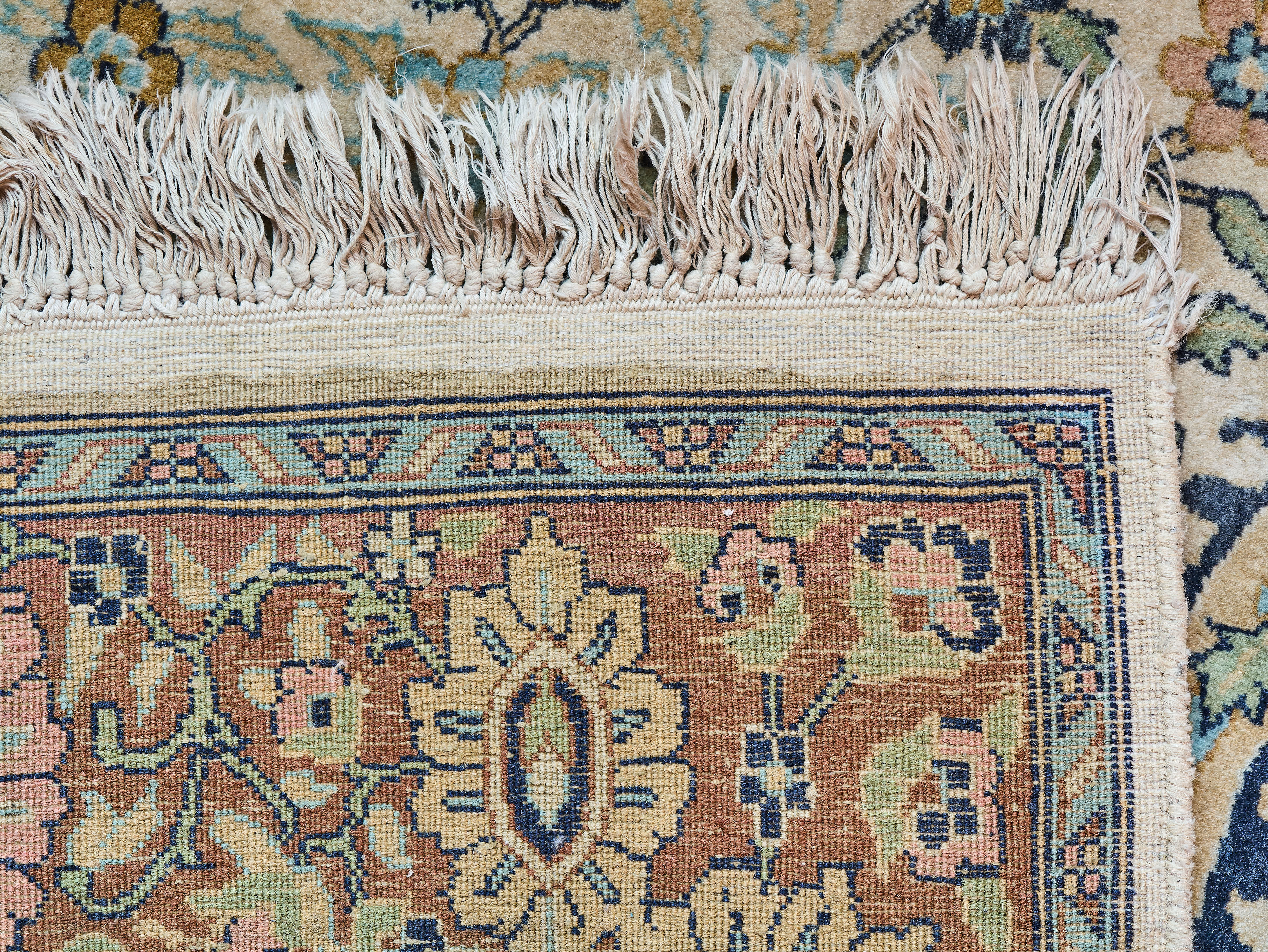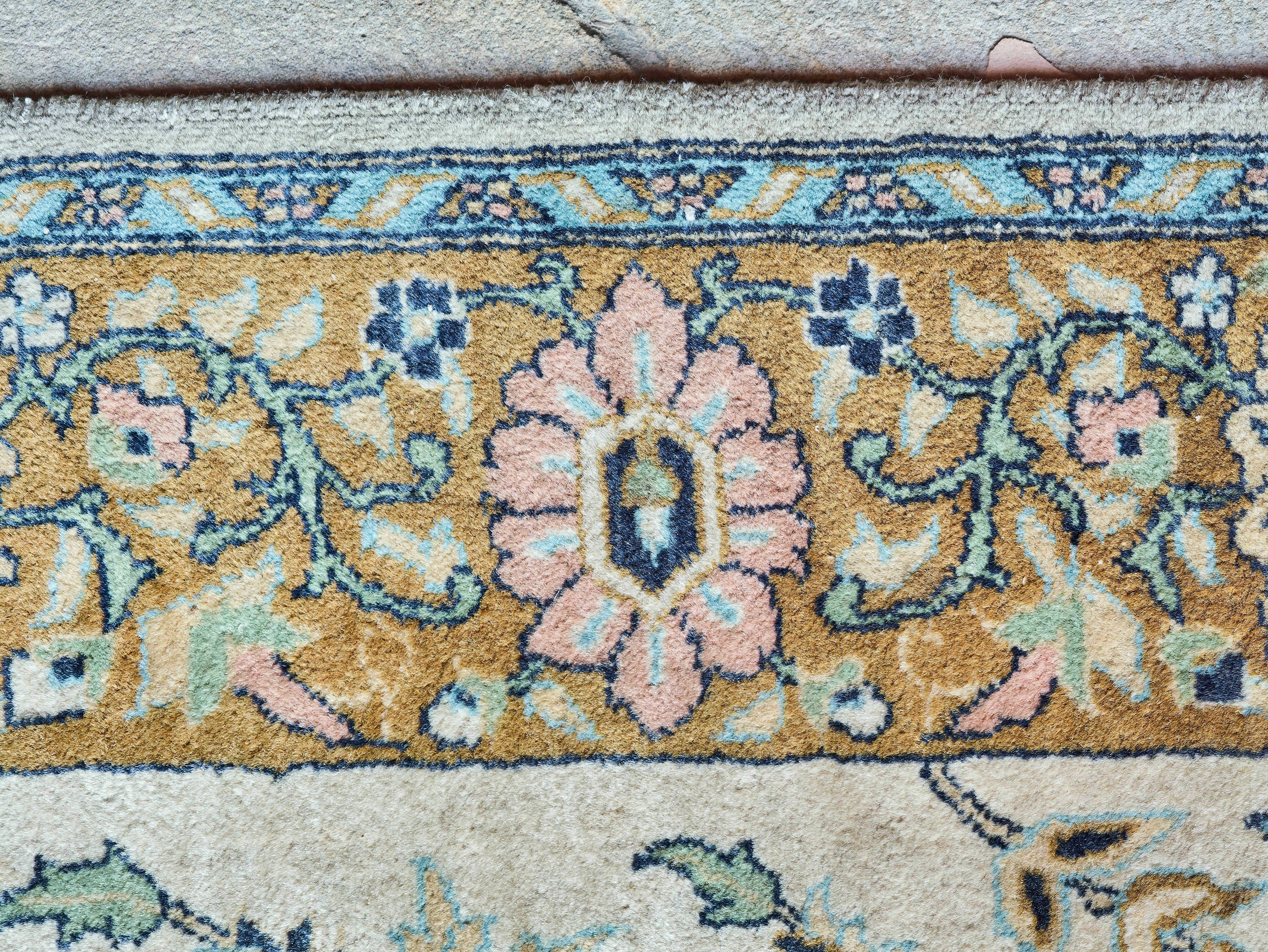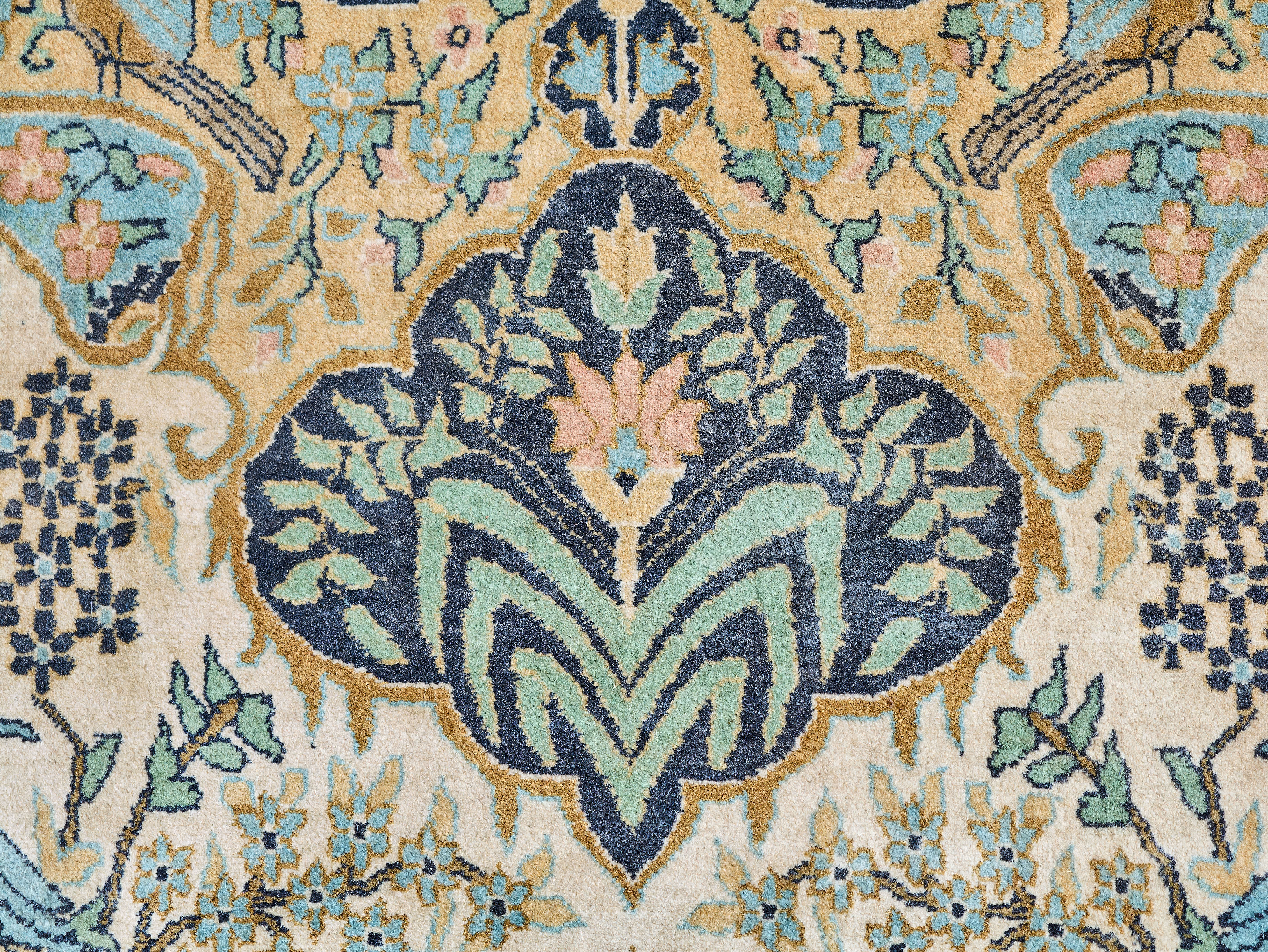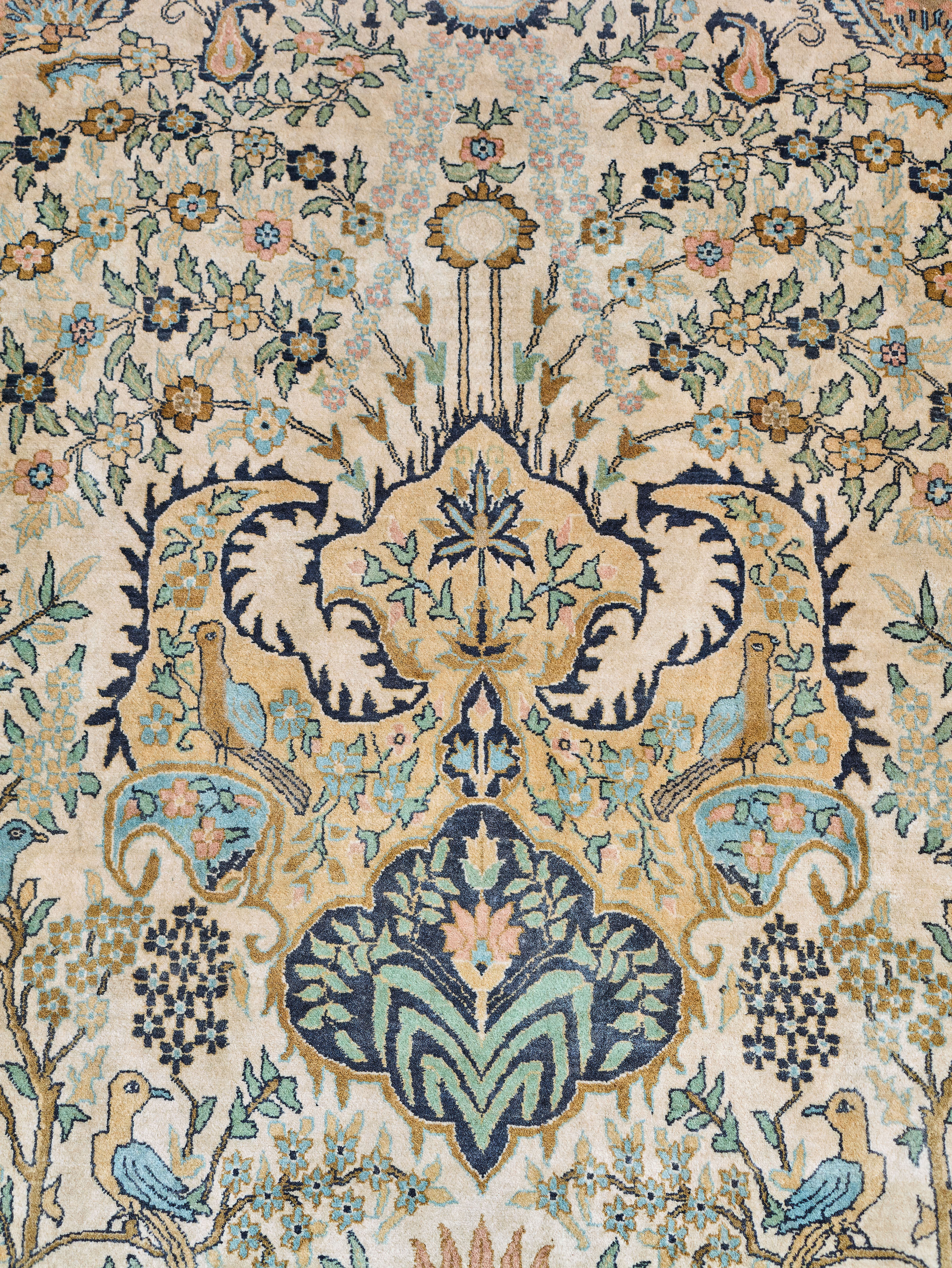 Ručně vázaný perský koberec z oblasti Tabrizu s motivem Stromu života, symbolu prosperity, kontinuity a harmonie. Vysoká hustota vazby okolo 250 000 uzlů na m² zajišťuje velmi jemnou kresbu a detailní provedení ornamentu. Barevnost je harmonická, s převahou světlého pole doplněného bohatou florální kompozicí a ptactvem.