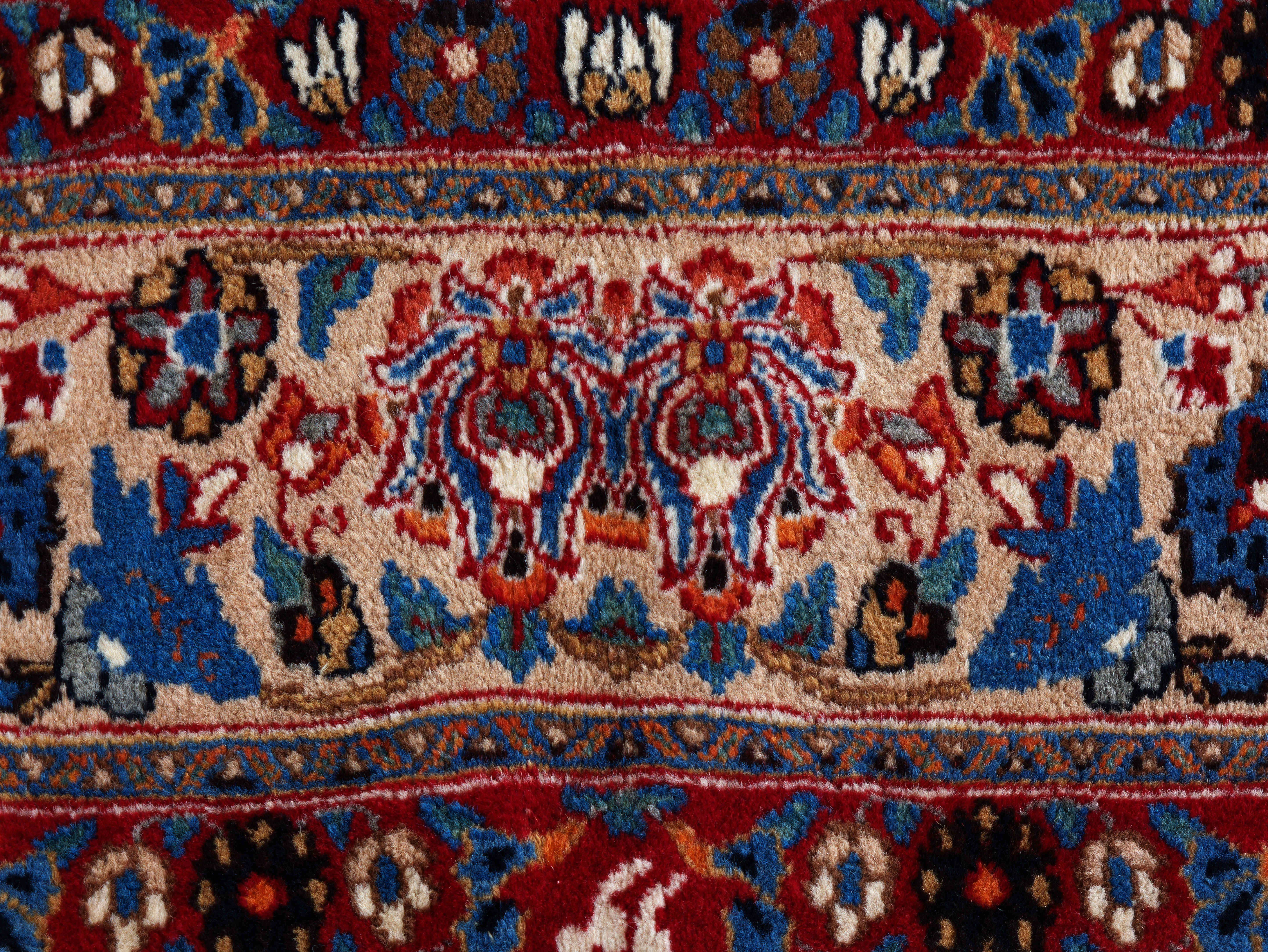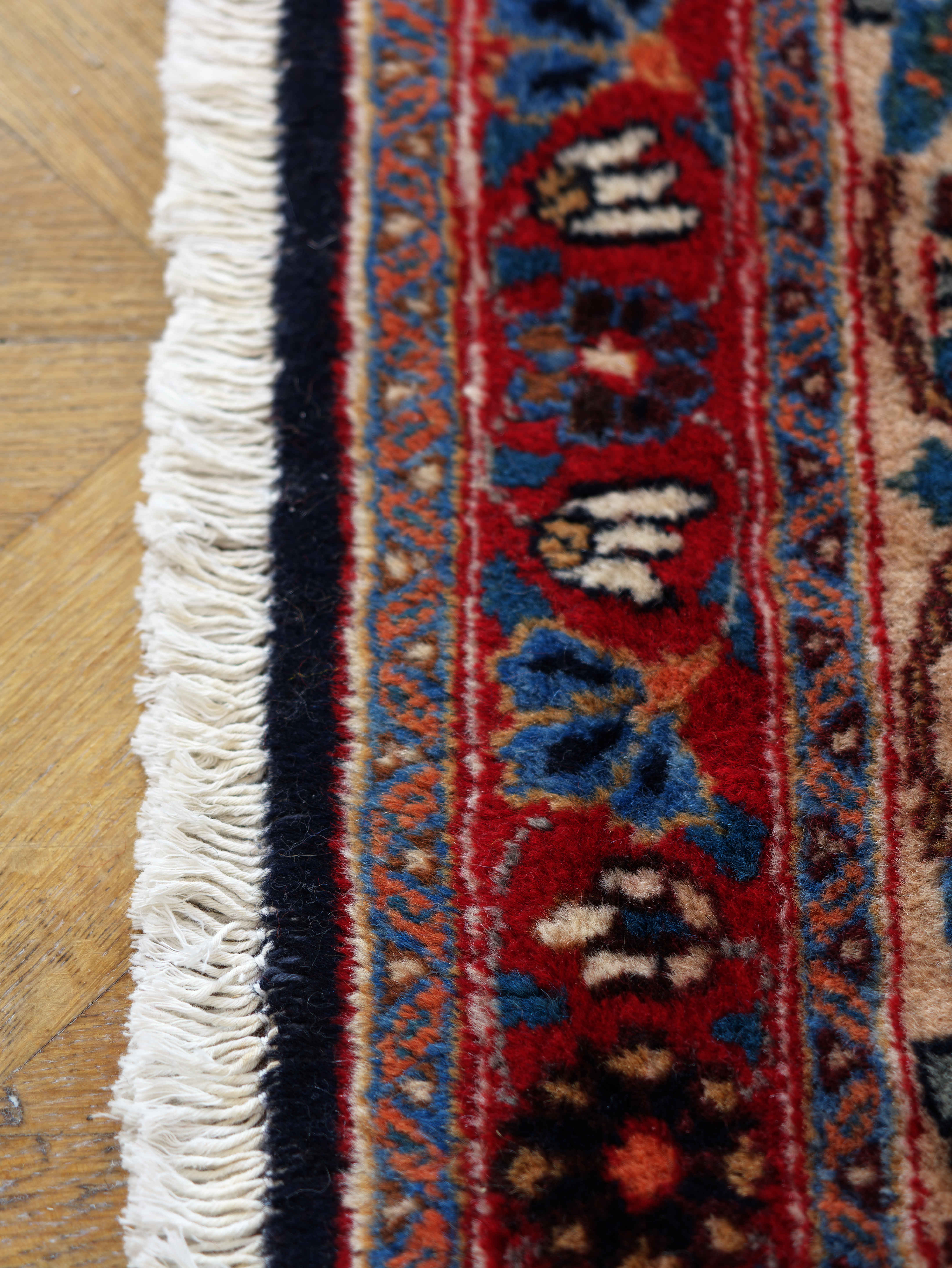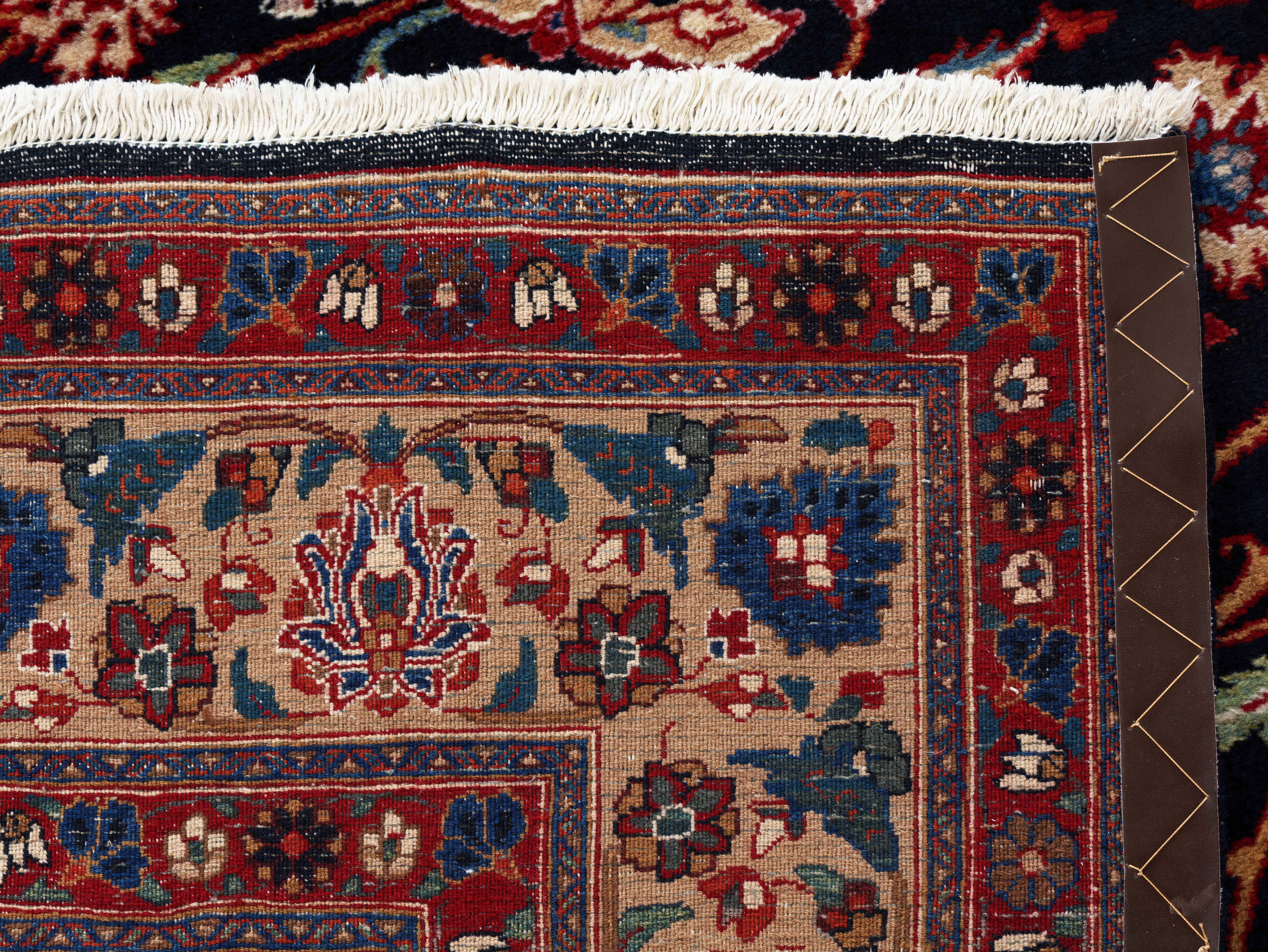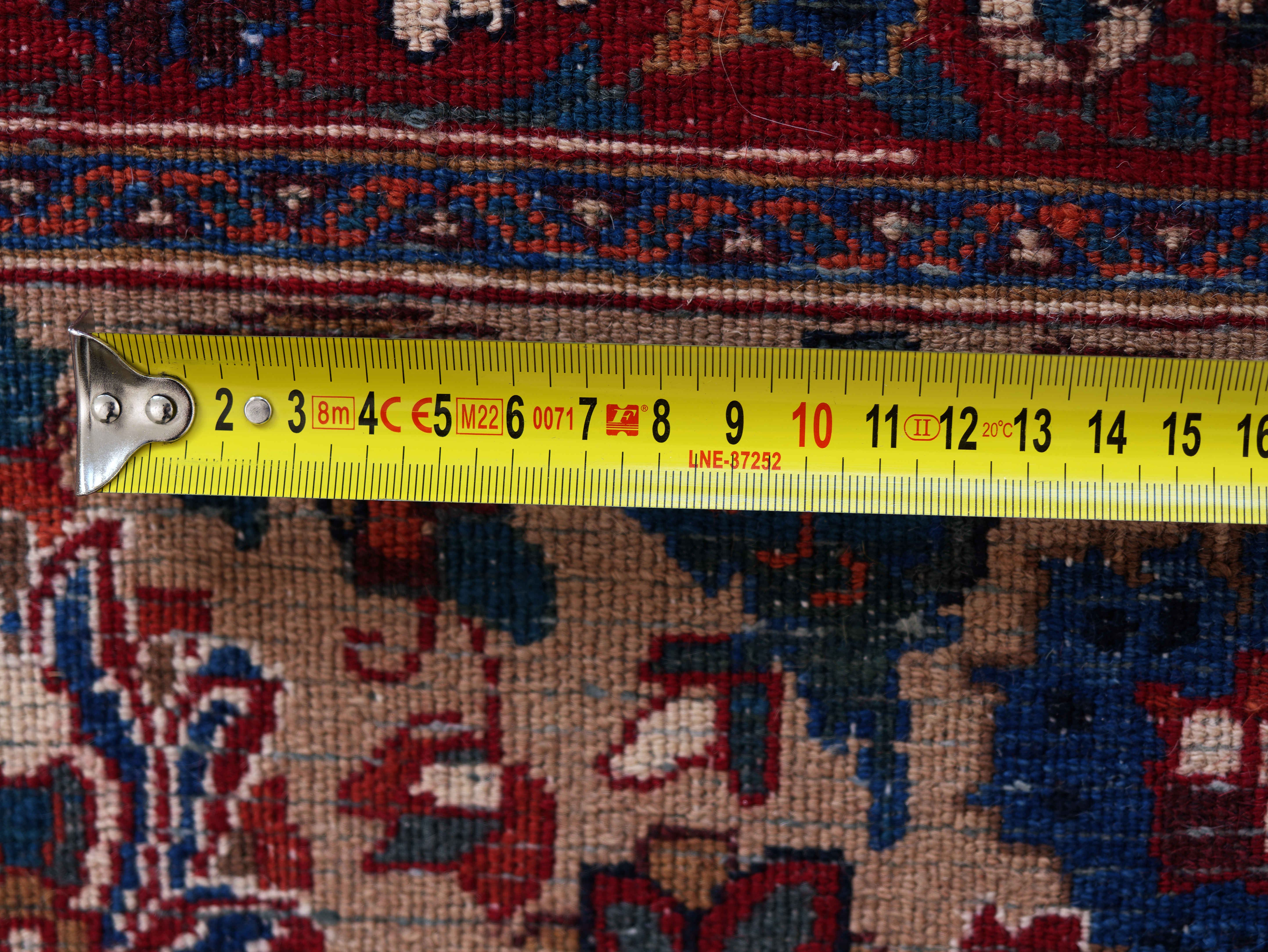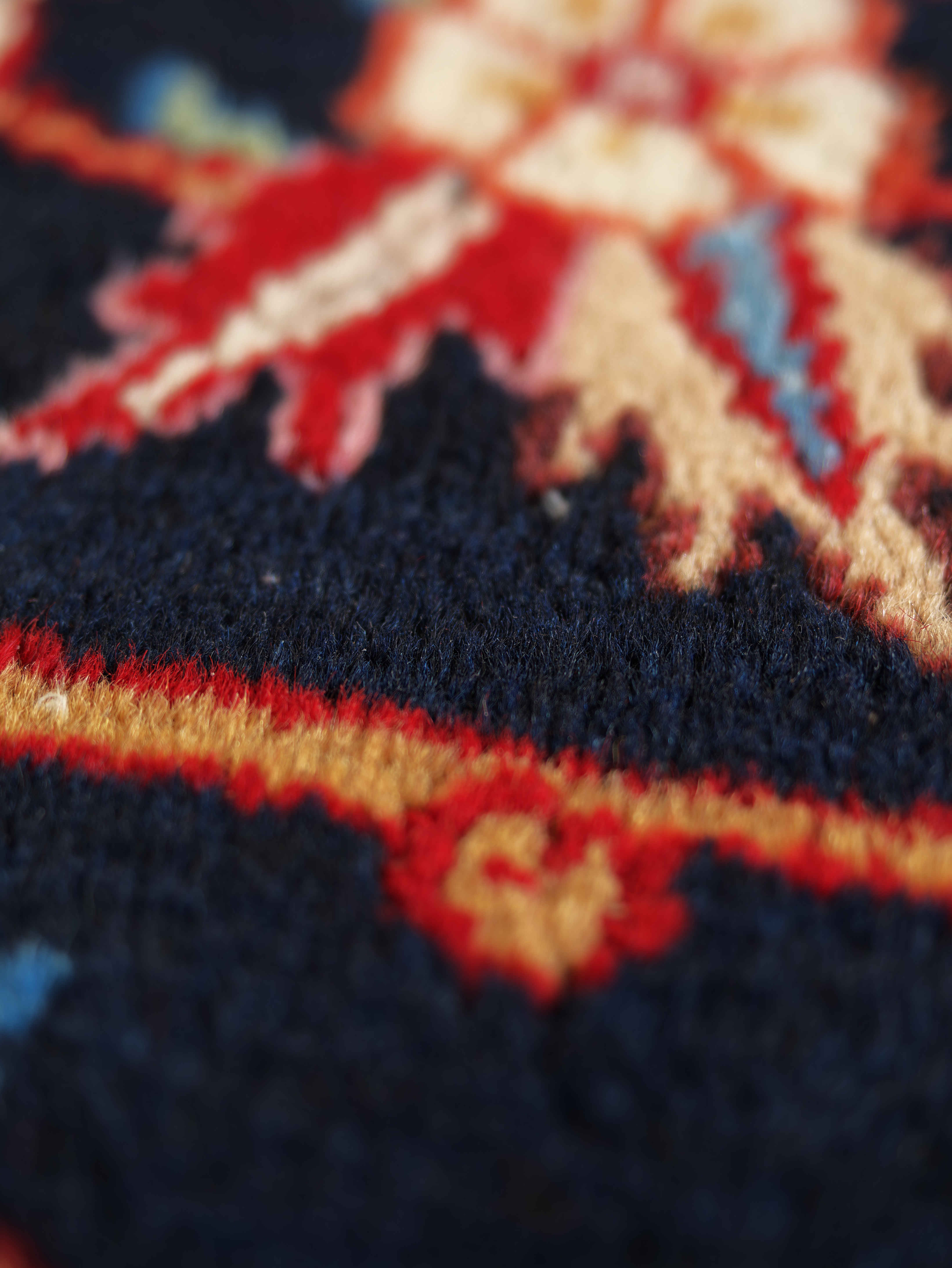 Centrální hvězdicový medailon je obklopen dynamickým rostlinným dekorem s typickými stylizovanými květy a arabeskami, které jsou precizně rozvinuty po celé ploše koberce. Výrazná víceřadá bordura s květinovými motivy harmonicky uzavírá kompozici a podtrhuje její vyváženost i reprezentativní charakter.