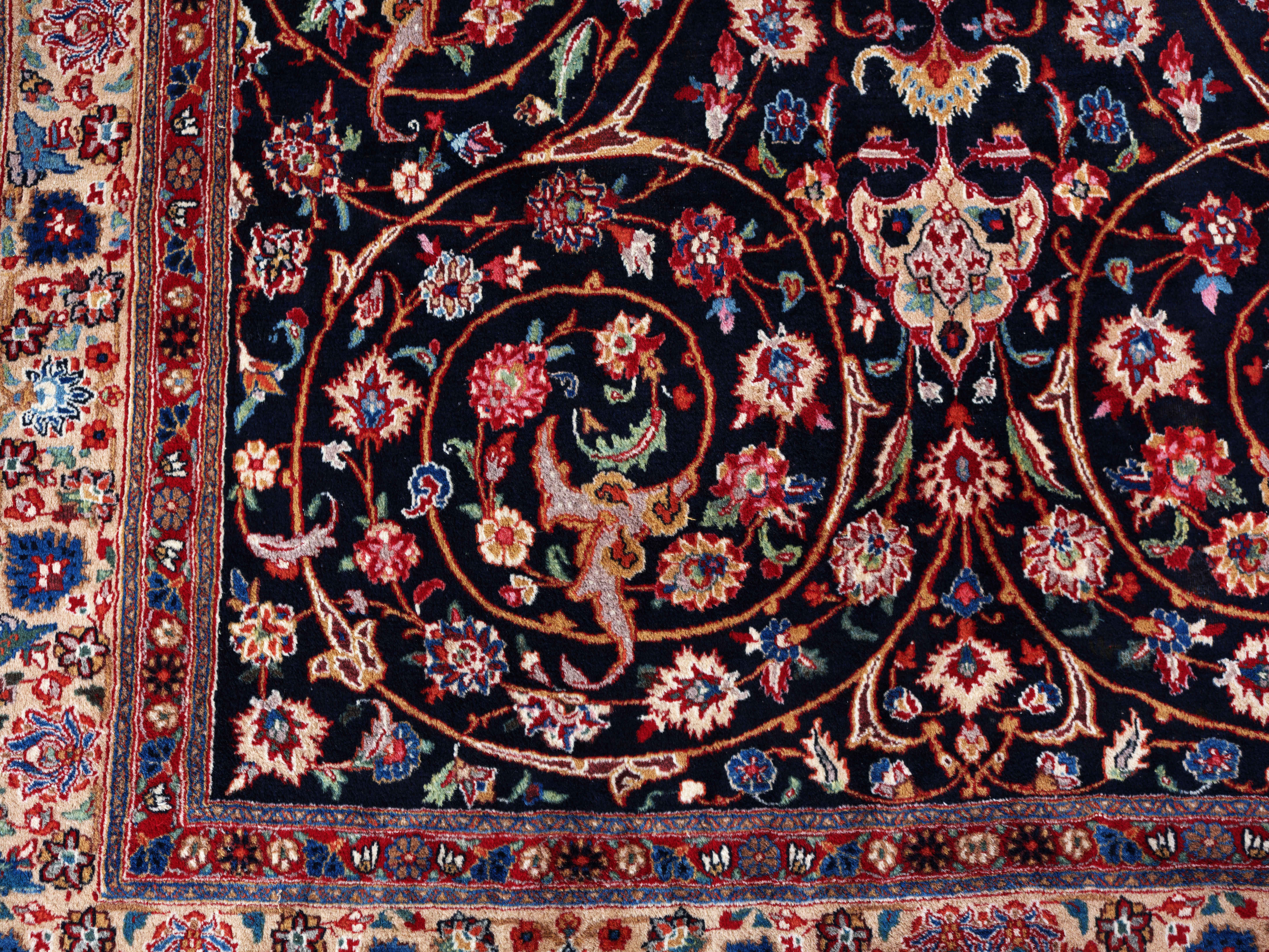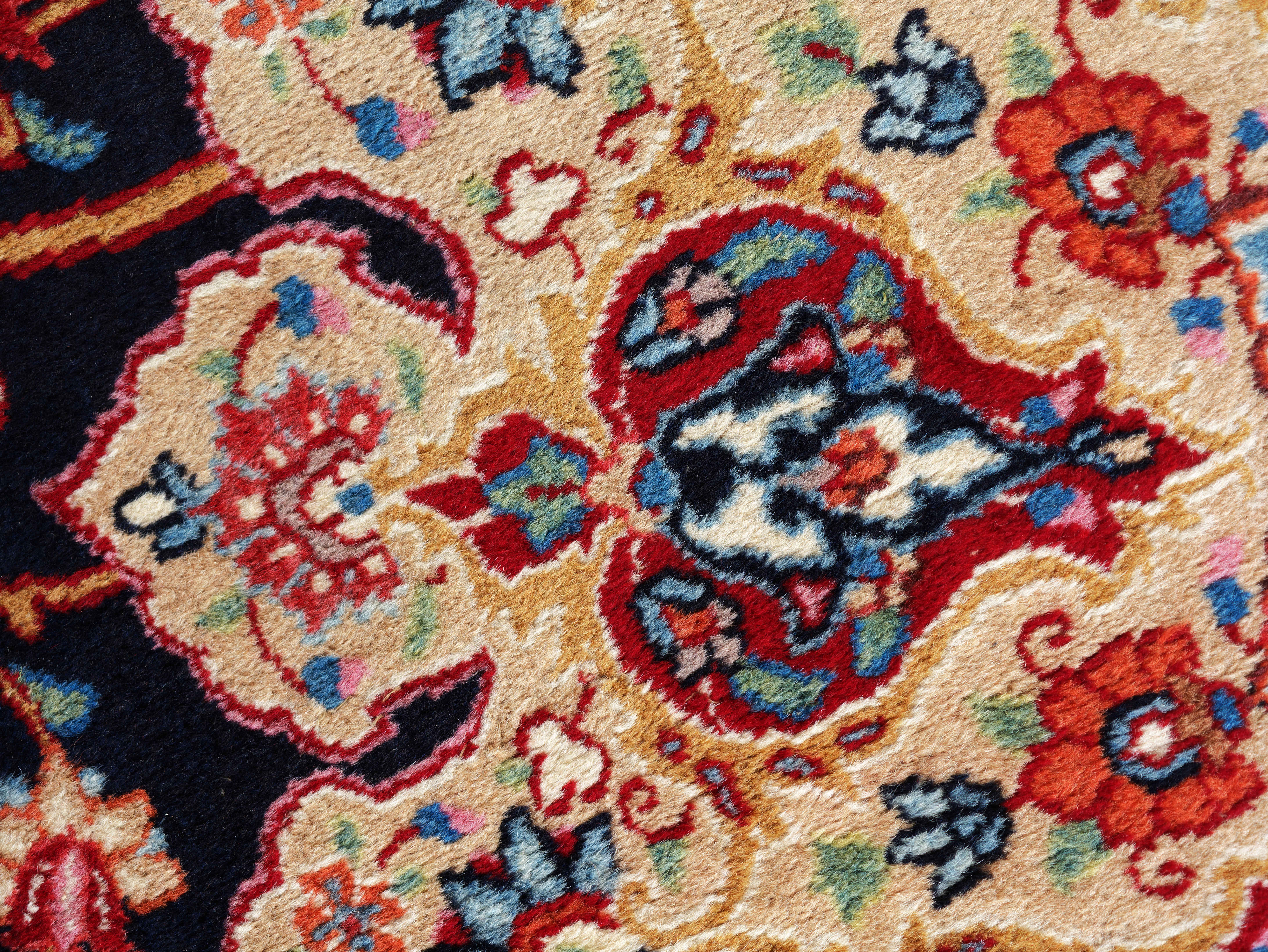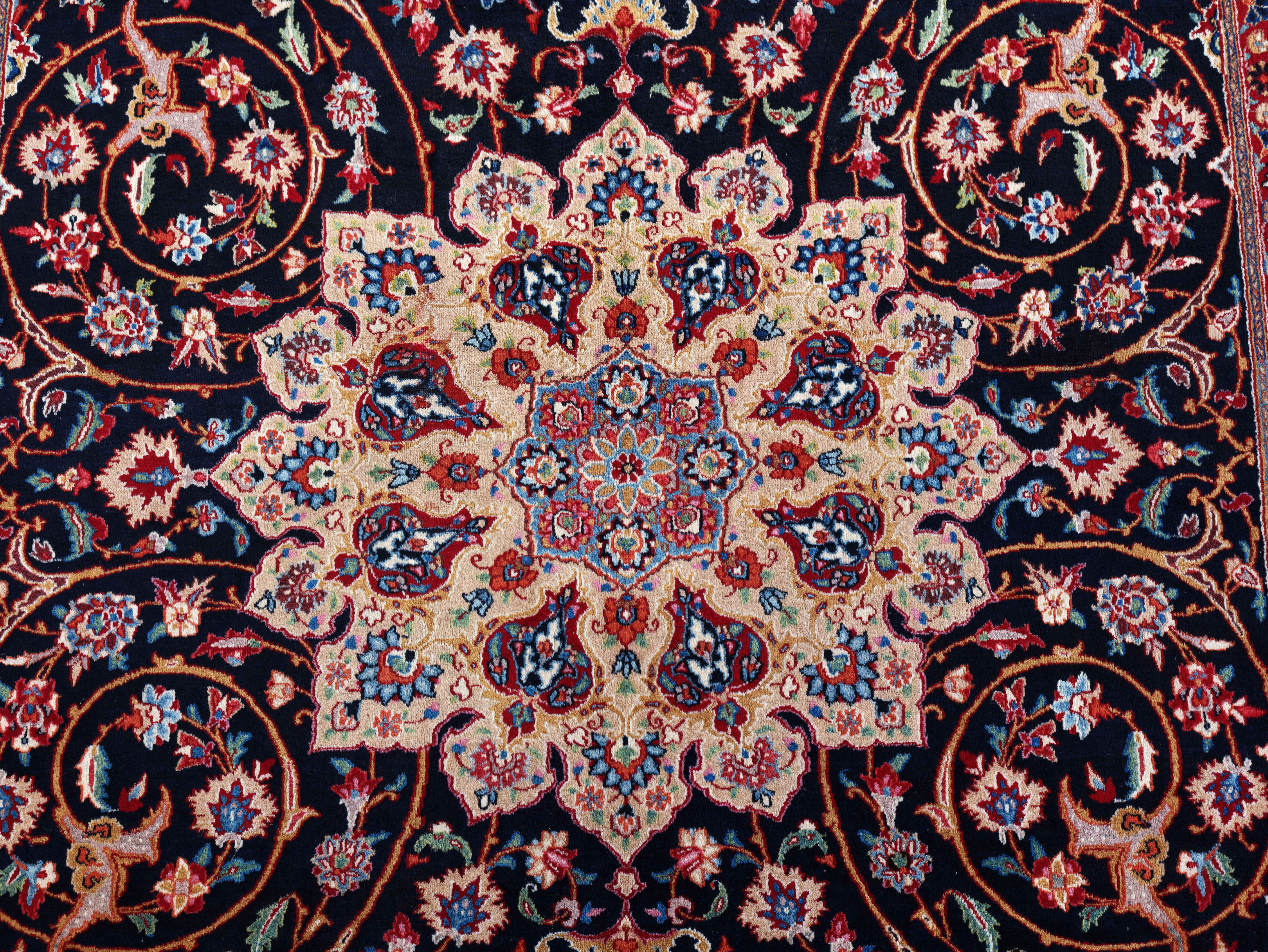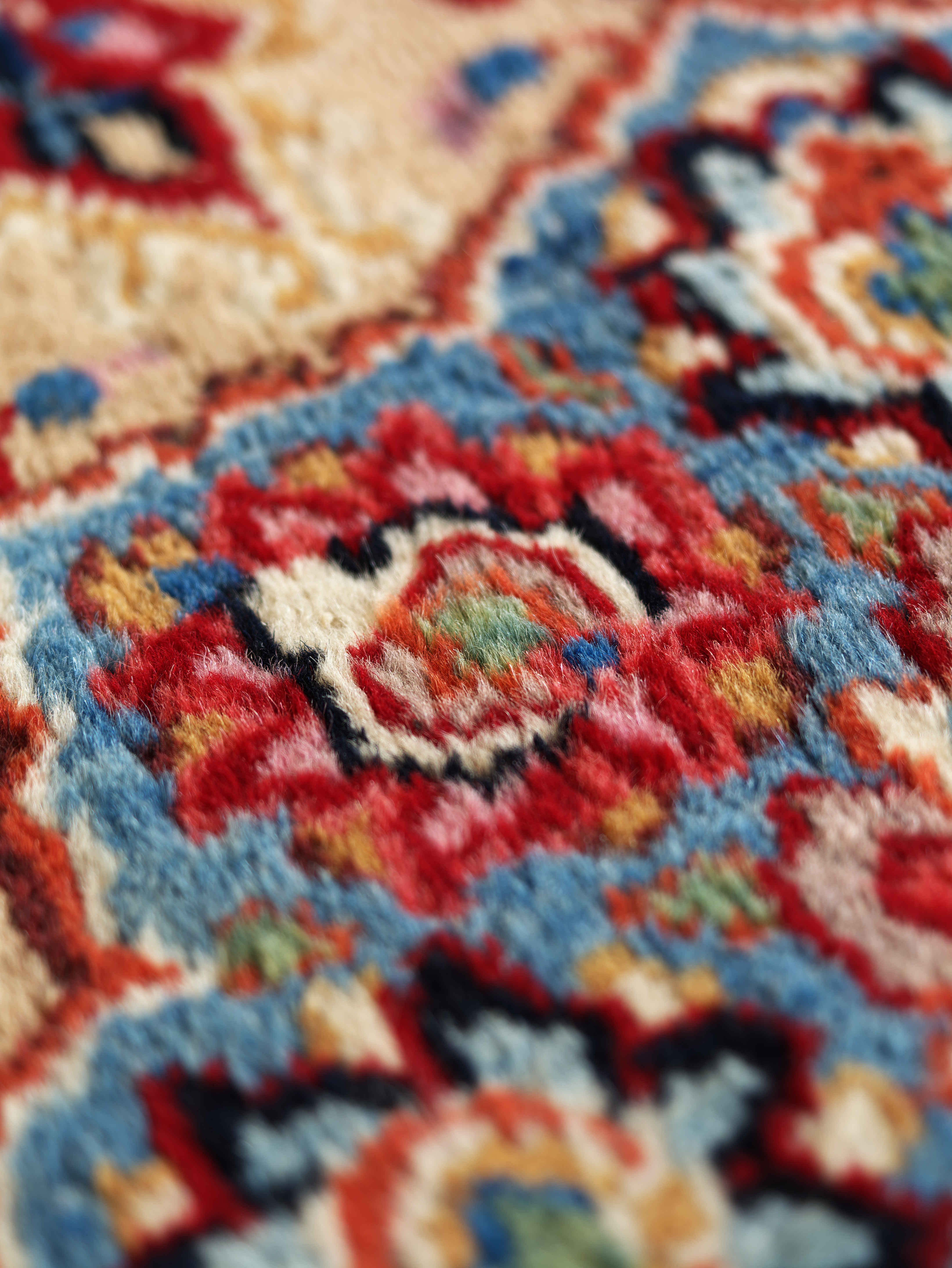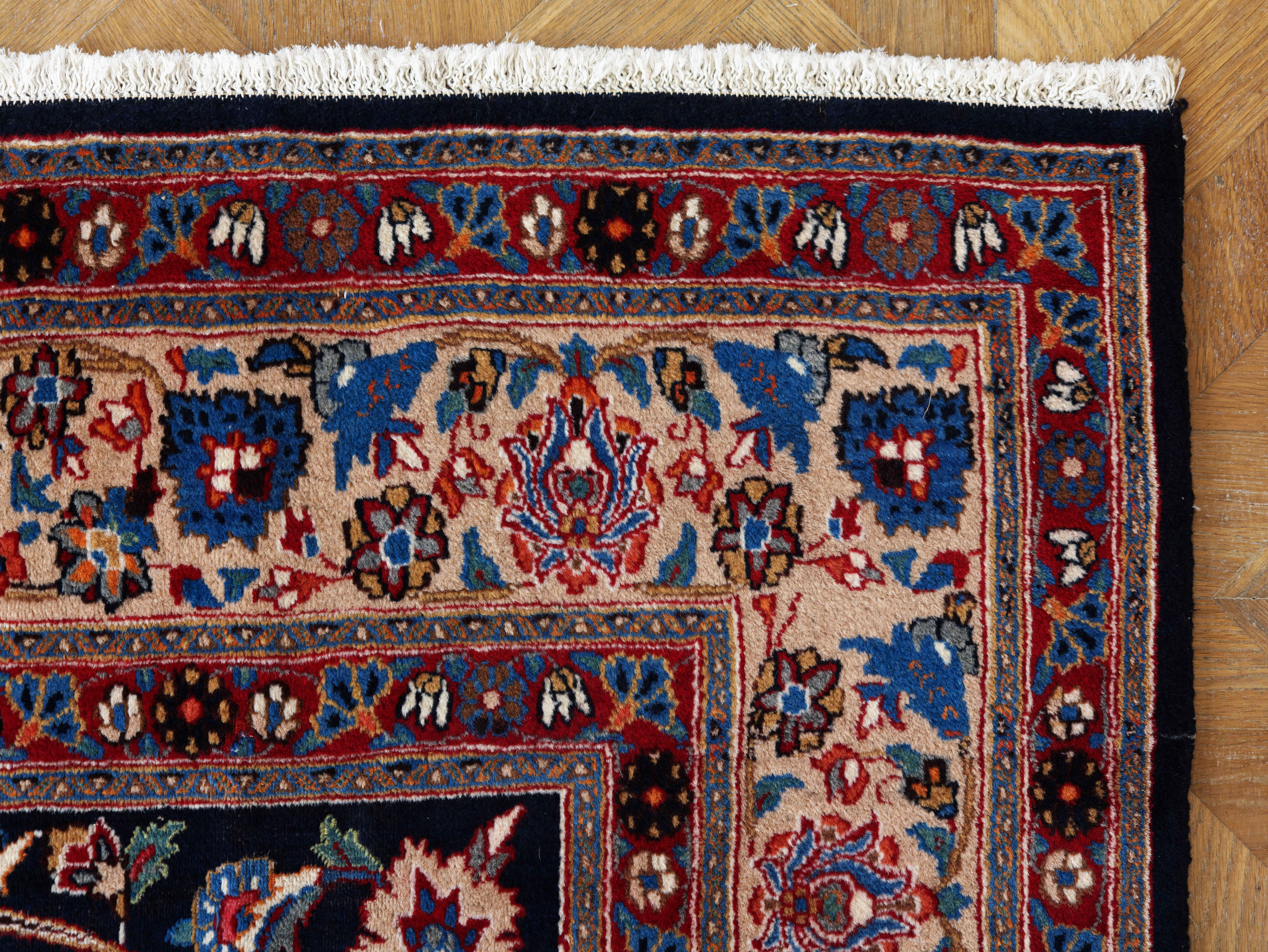 Centrální hvězdicový medailon je obklopen dynamickým rostlinným dekorem s typickými stylizovanými květy a arabeskami, které jsou precizně rozvinuty po celé ploše koberce. Výrazná víceřadá bordura s květinovými motivy harmonicky uzavírá kompozici a podtrhuje její vyváženost i reprezentativní charakter.