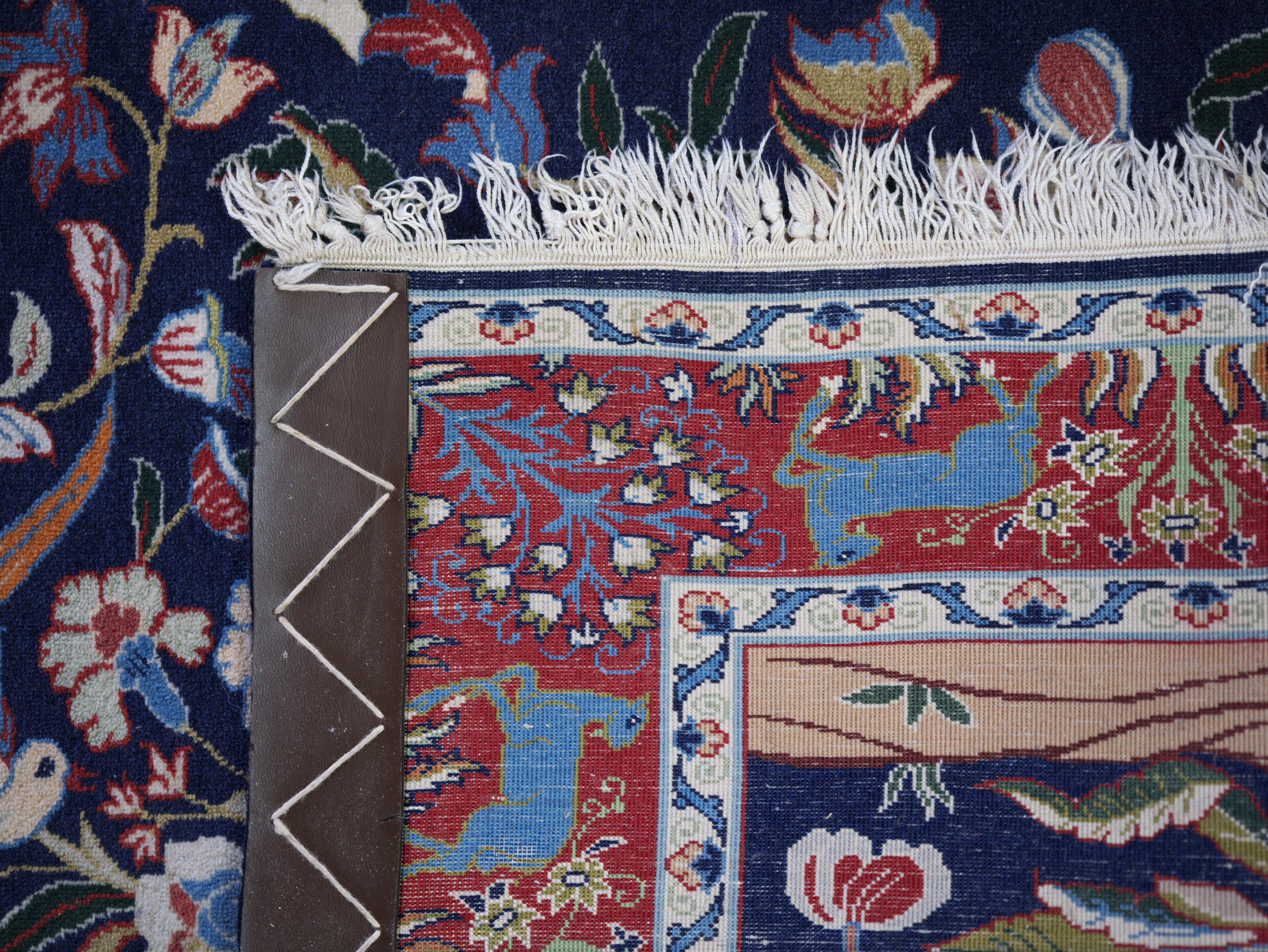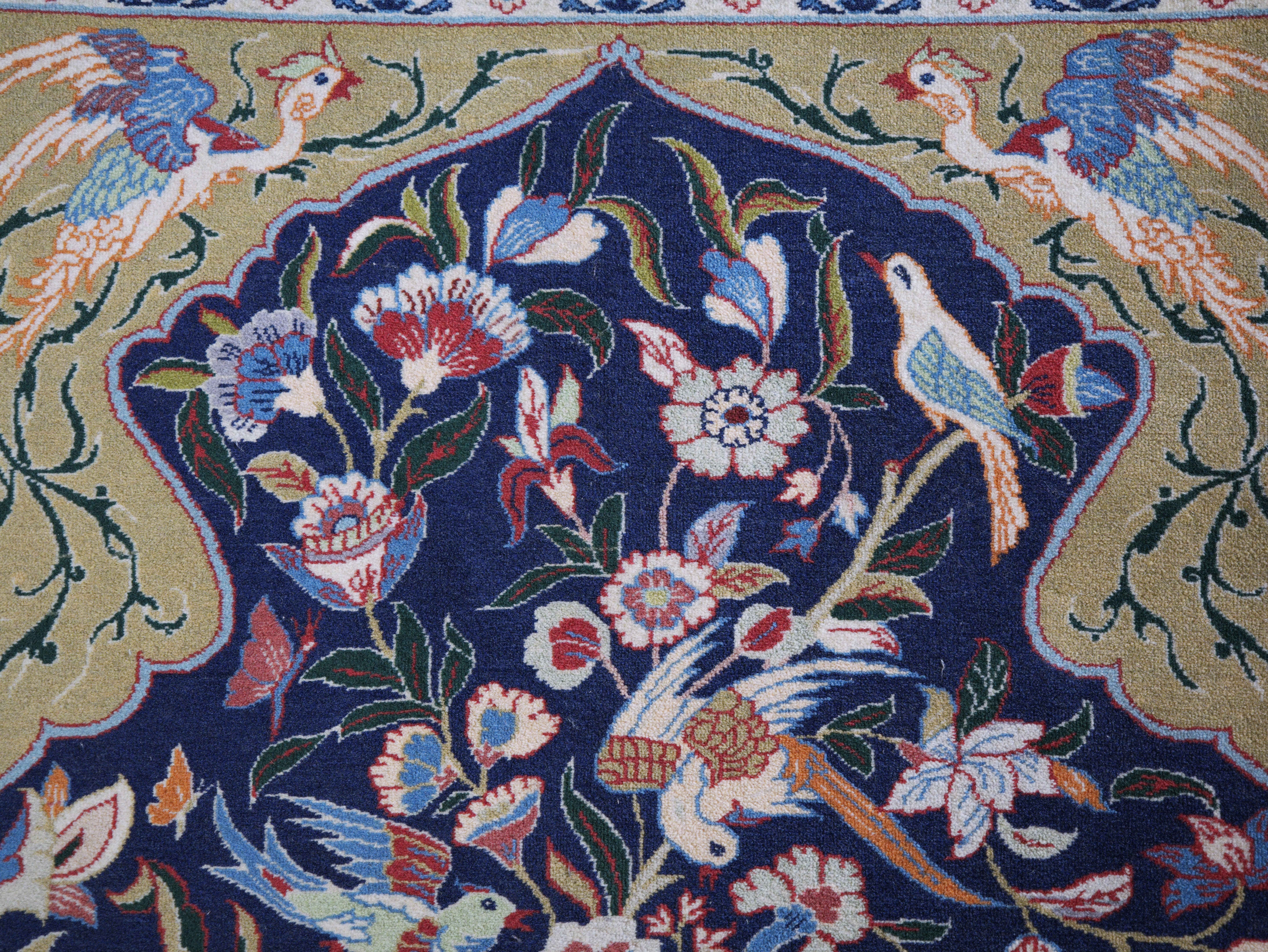 Jemný ručně vázaný perský kobereček z proslulého Isfahanu, vyhotovený z korkové vlny na hedvábné osnově. Vyniká mimořádně jemnou vazbou, precizním kreslením detailu a reprezentativní barevností v tónech tmavě modré, červené, světle modré, slonové kosti a zelené.