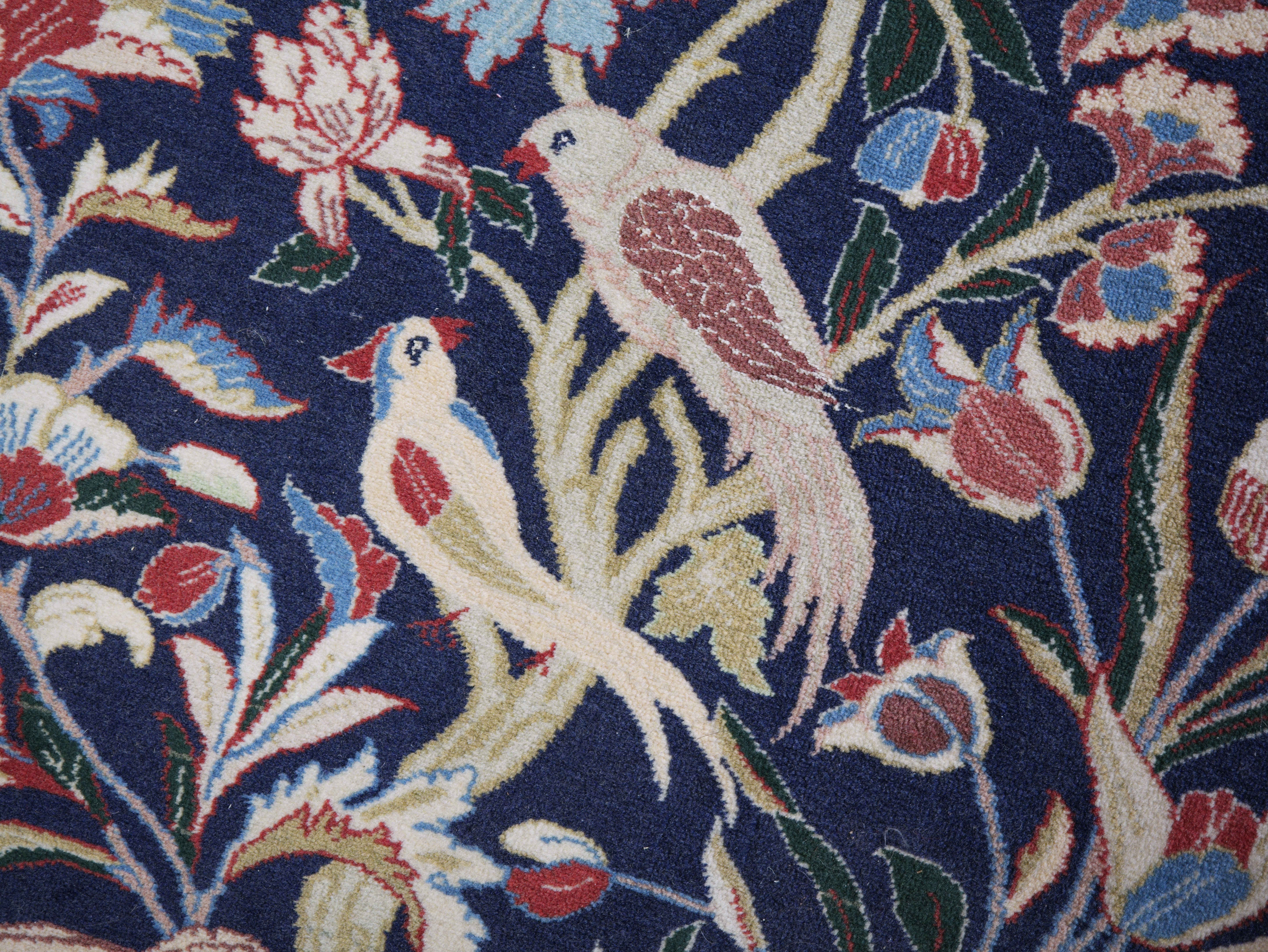 Středové pole zdobí působivý motiv stromu života s bohatě rozvětvenými květy a množstvím ptáků, který patří k tradičním a velmi oblíbeným perským kobercovým kompozicím. Ornamentika je doplněna dekorativní bordurou s figurálními a rostlinnými prvky, což celku dodává živost, eleganci a sběratelskou přitažlivost.