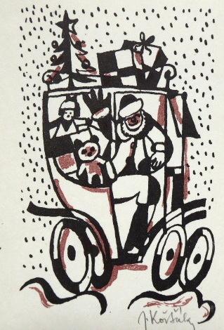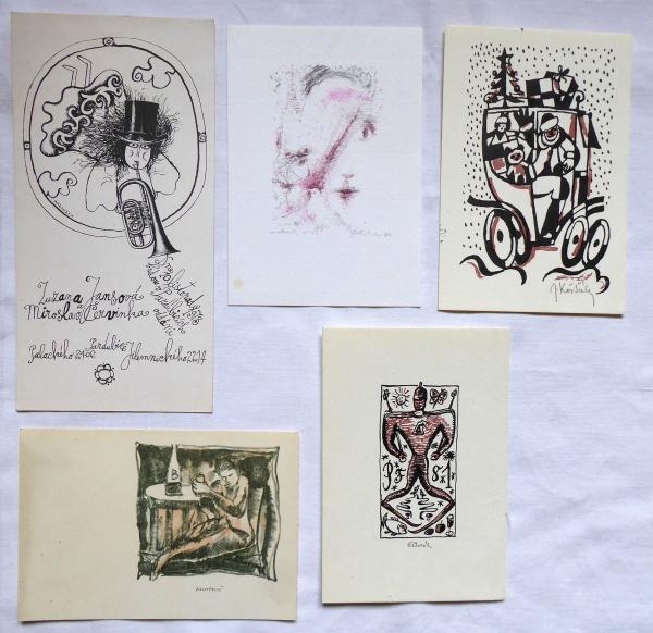 1. Jiří Kalousek: litografie na papíře 21 x 10,5 cm. Signováno v desce. Nerámováno. 2. Jaromír Košťál: barevná litografie na papíře 15,2 x 10,5 cm. Signováno vpravo dole tužkou. Nerámováno. 3. Jan Cihla: barevná lept na papíře, rozměr tiskové plochy 10 x 7 cm. Signováno tužkou vpravo dole, vlevo dole tužkou – autorský tisk. Vzadu na papíře přípis tužkou – Jan Cihla, lito. 80. Nerámováno. 4. Miroslav Matouš: barevná litografie na papíře, rozměr tiskové plochy 7,5 x 8 cm. Signováno tužkou uprostřed dole. Nerámováno. 5. Signatura nečitelná – Lyžař PF 81: barevná litografie na papíře, rozměr tiskové plochy 8,5 x 4,5 cm. Signováno tužkou uprostřed dole. Nerámováno.