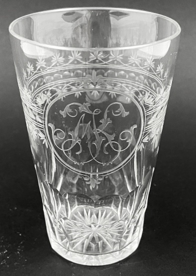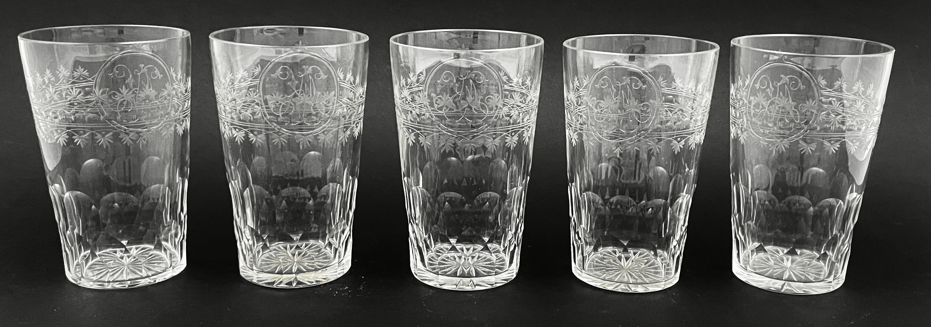 Čiré ručně broušené a ryté sklo. Pět elegantních ručně broušených a rytých skleniček z čirého skla. V medailonu ručně vyrytá písmena doplněná po obvodu skleniček broušenými čočkami a rytými florálními motivy. Na dně ručně broušená hvězdice. Střední Evropa 1870 – 1900. Výška 13 cm.