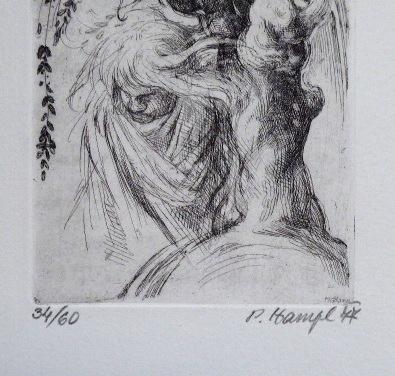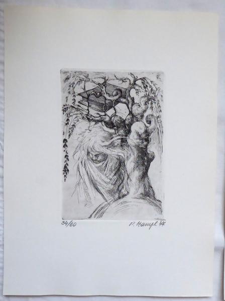 Lept na papíře 13 x 9 cm. Signováno tužkou vpravo dole, datováno 77. Vlevo dole tužkou – číslo listu 34 / 60. Vzadu na papíru razítko – Petr Hampl: Libri prohibiti, C3, 1977. Nerámováno.