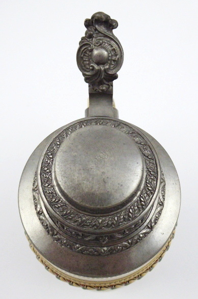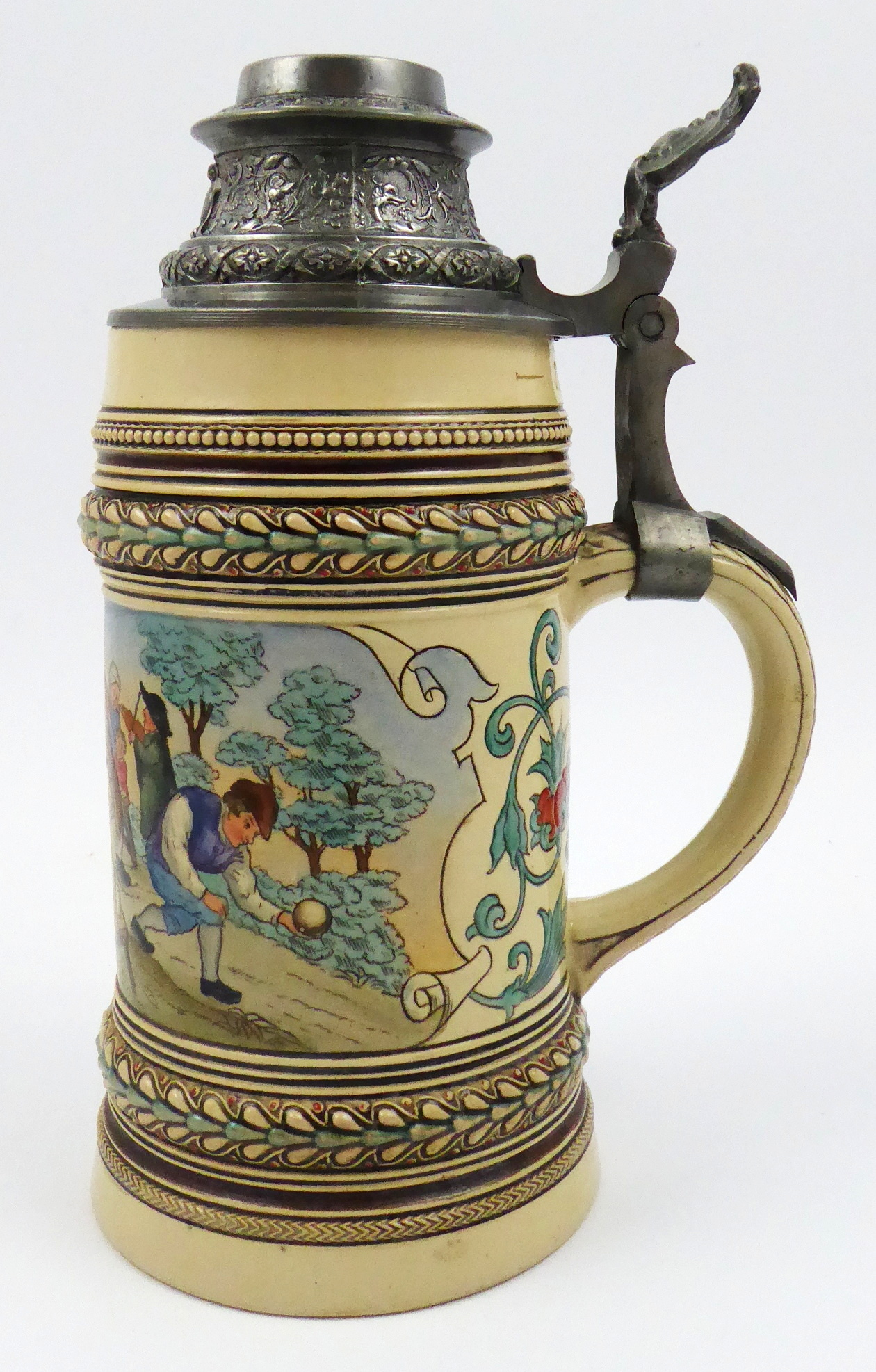 Tvrdá světlá glazovaná kamenina, ruční malba, cín. Pivní korbel z tvrdé kameniny se světlou glazurou a ruční malbou zobrazující vesnickou pijatiku doprovázenou hrou v kuželky a muzicírováním pod širým nebem. Dekor korbelu doplněn o reliéfní florální věnečky, vlnovky a punktování. Velmi pěkné zdobné víko a úchyt korbelu s palmetami. Ve výborném stavu. Značeno zespodu: čísly. Německo 1890 – 1930. Výška 24 cm.