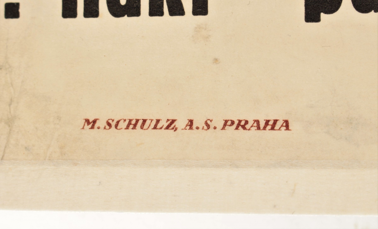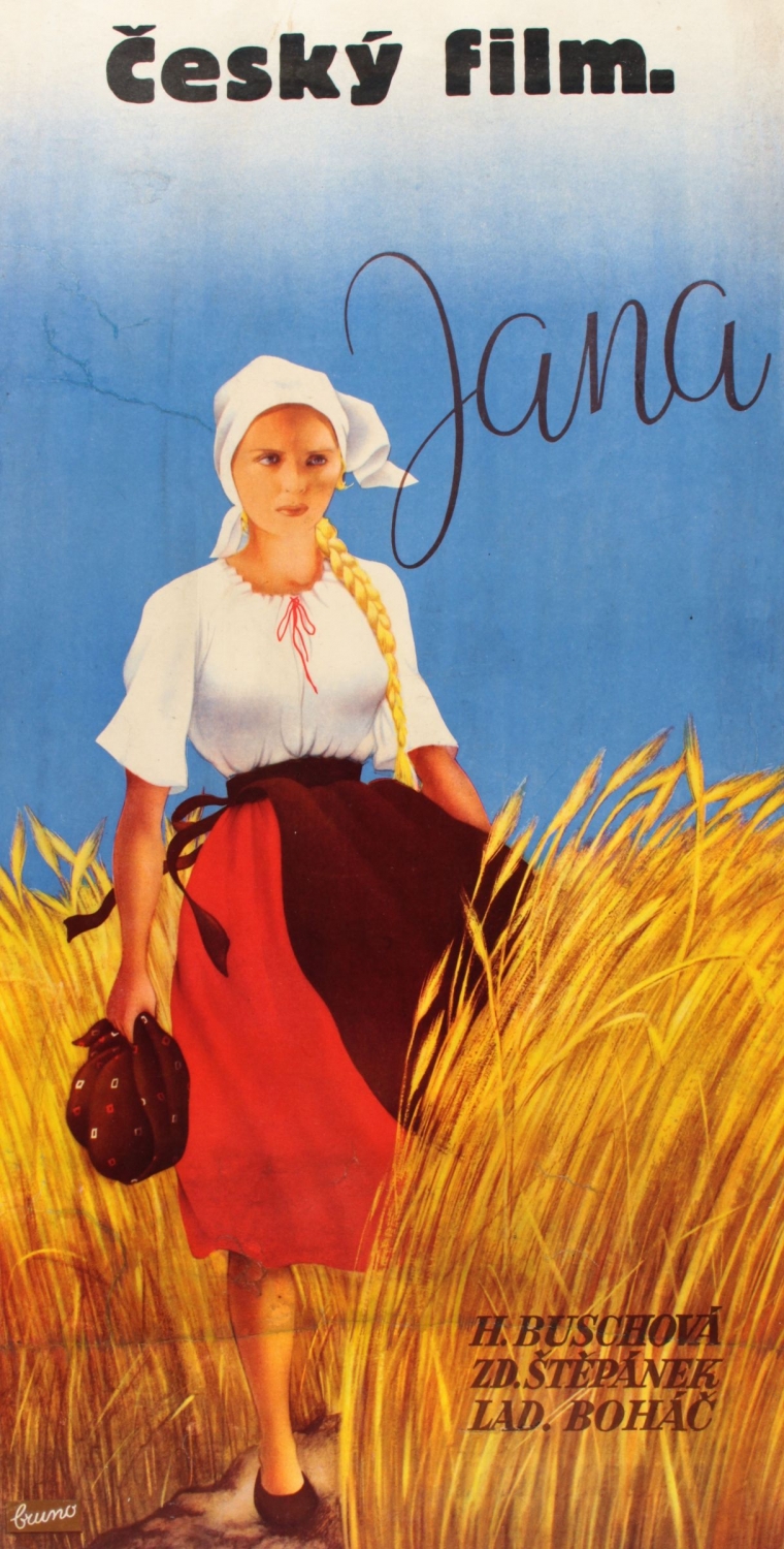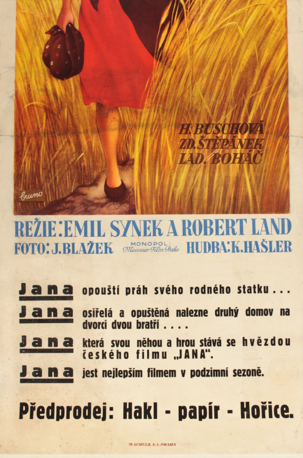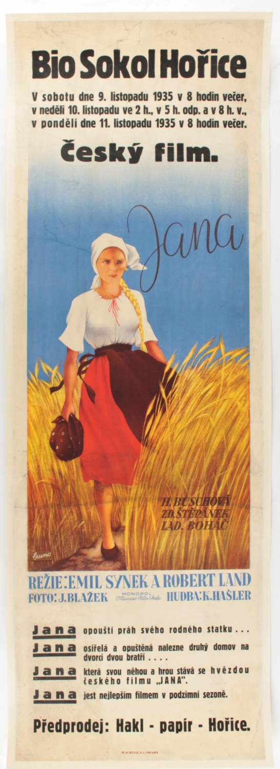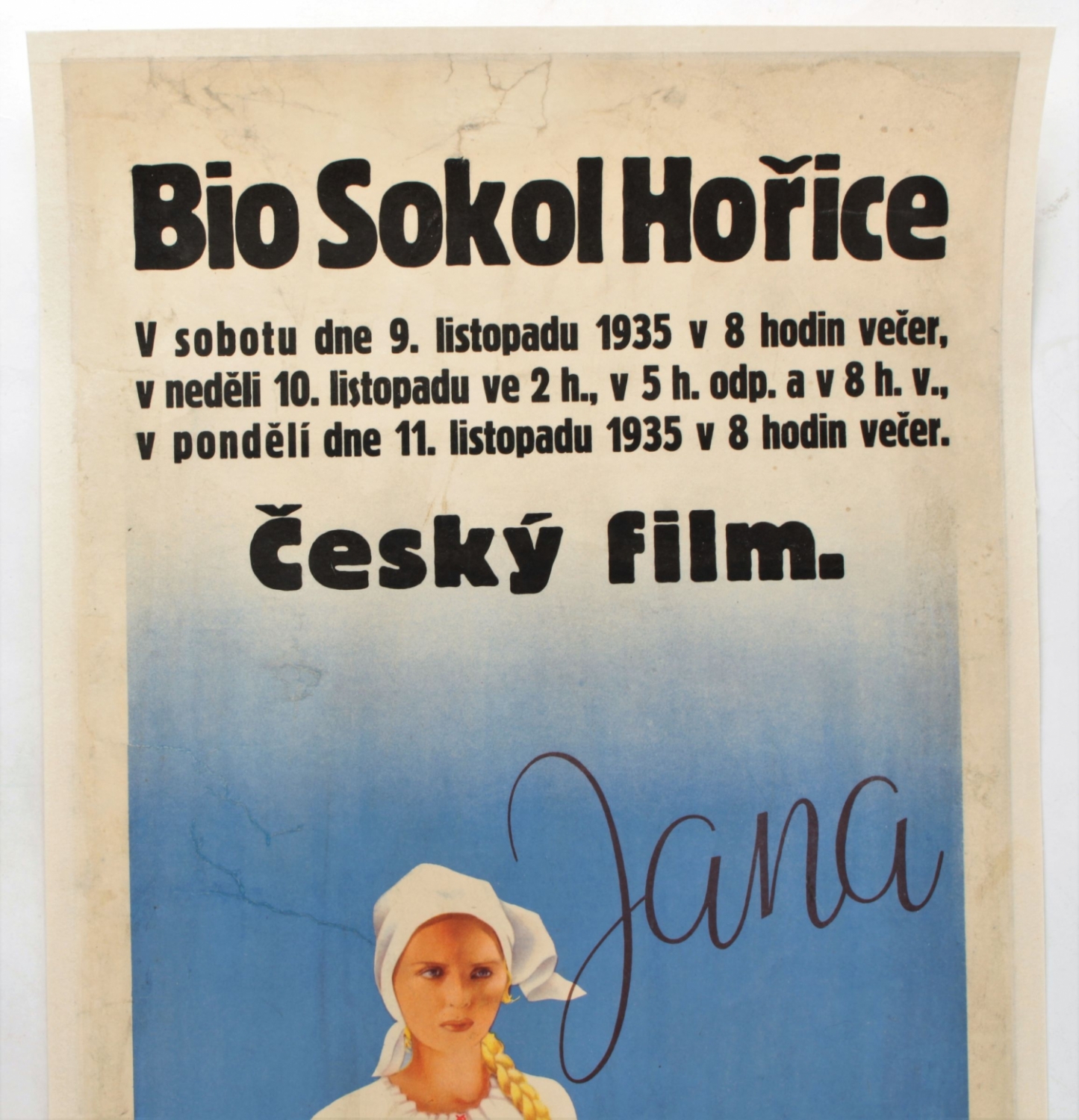 Barevná litografie na papíře, rok 1935, adjustováno na plátno, rozměry 92 x 31 cm, plakát Bio Sokol Hořice, Český film Jana, značeno M. Schulz, a.s. Praha, nerámováno – volně loženo.