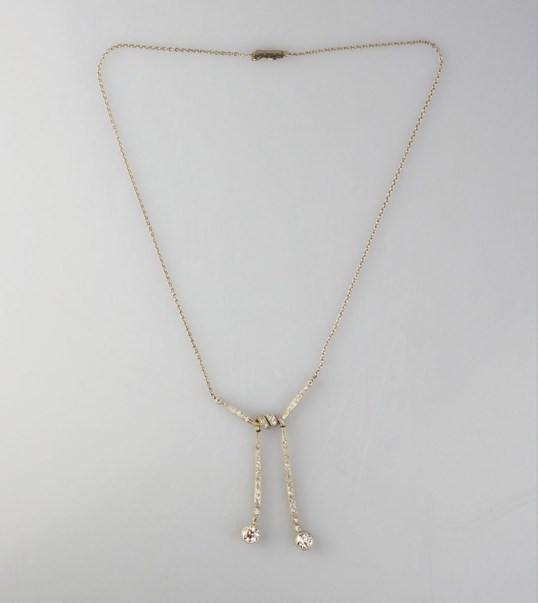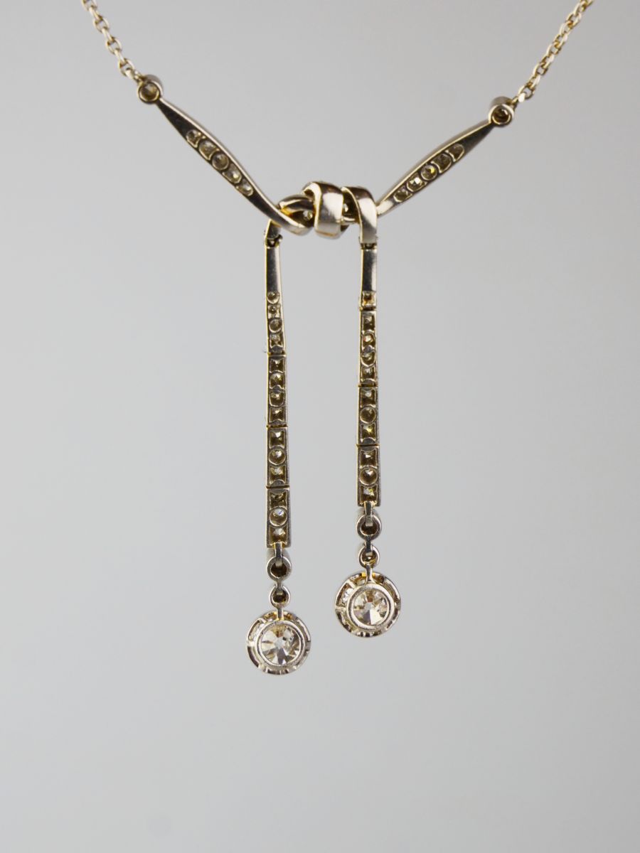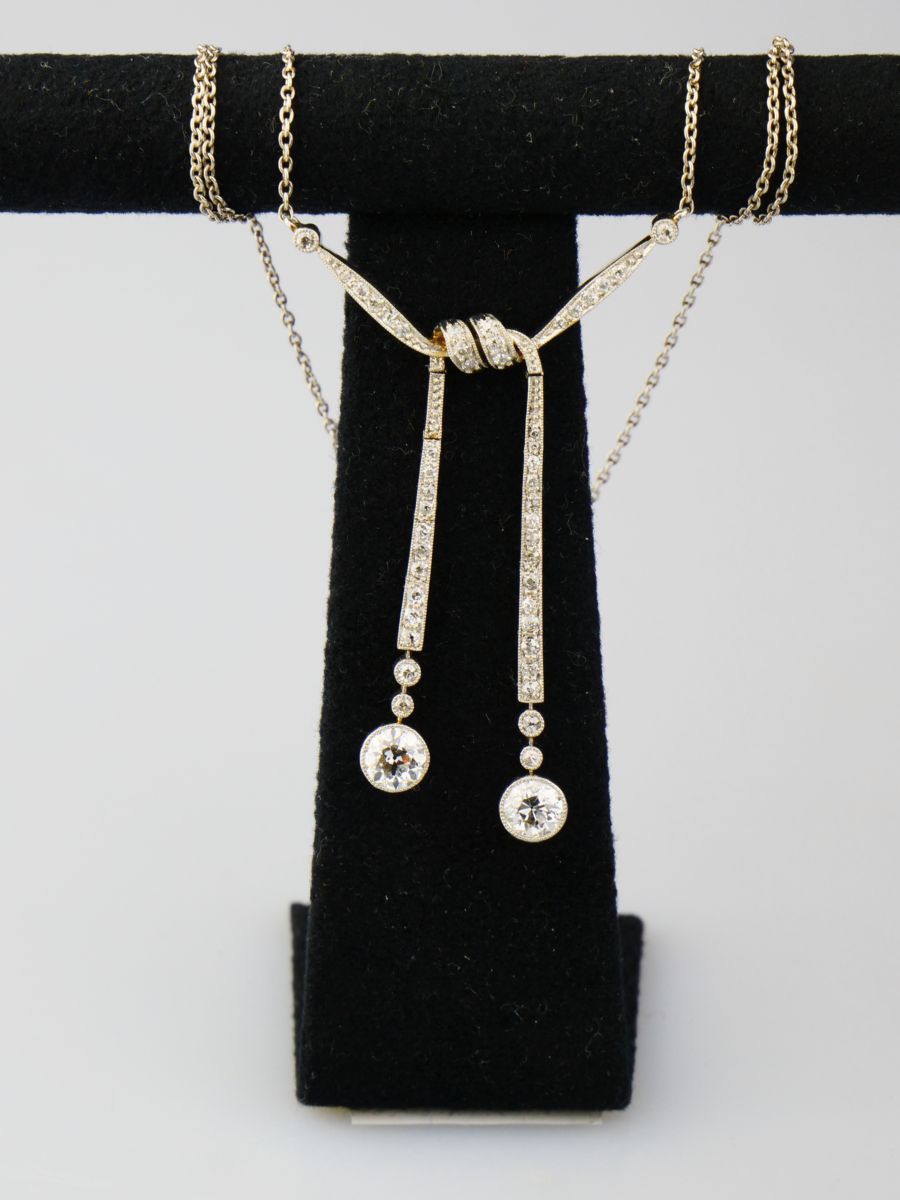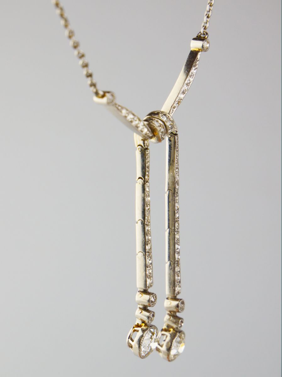 art deco platinový koliér s diamanty, efektní tvar zauzlované stuhy, Pt btto 9,36 g/900/000, celková hmotnost diamantů briliantového brusu je cca 1,6 ct, dva hlavní diamanty briliantového brusu o hmotnosti cca 0,5 + 0,5 ct, čistota SI3, barva I-J, střední Evropa, kolem r. 1925, délka řetízku 38 cm, závěs 5,5 x 3 cm; atest Puncovniho úřadu