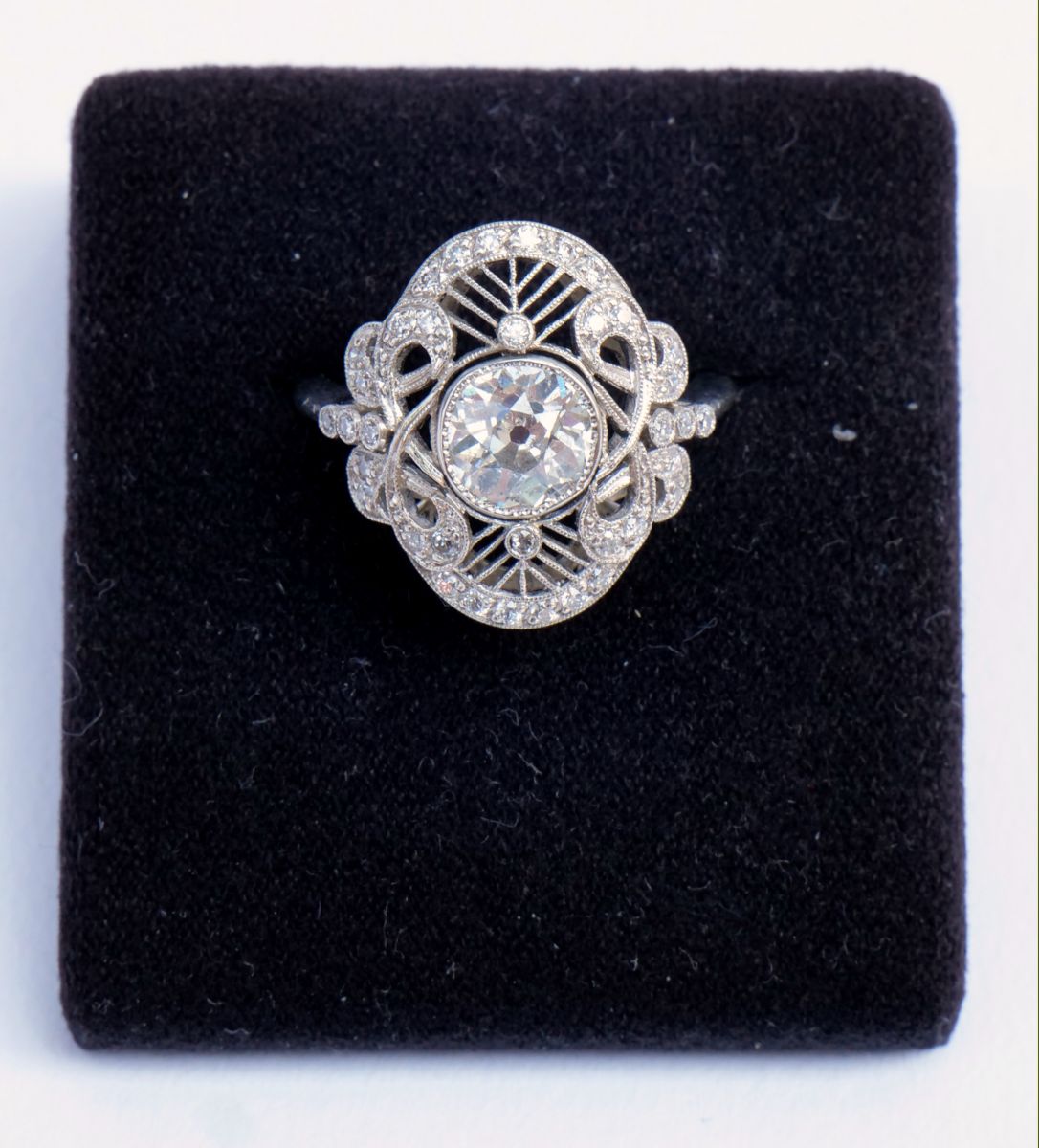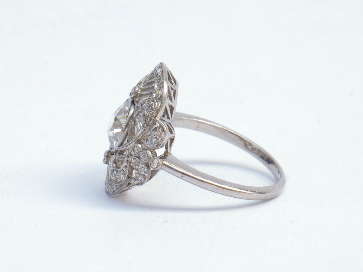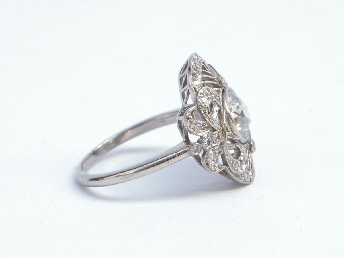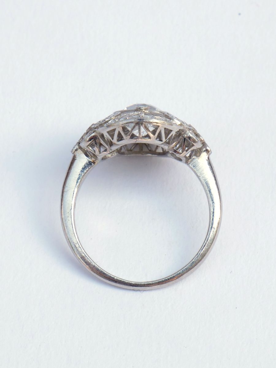 platinový prsten s ručně prořezávanou hlavou, centrální diamant starého briliantového brusu o hmotnosti 1,15 ct, čistota SI2 a barva M, Pt btto 5,60g/950/000, velikost 54; západní Evropa, kolem roku 1925, pozdější český punc; znalecký posudek